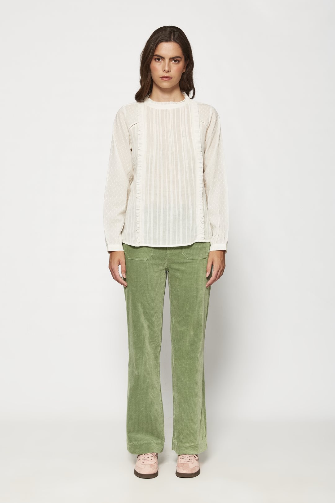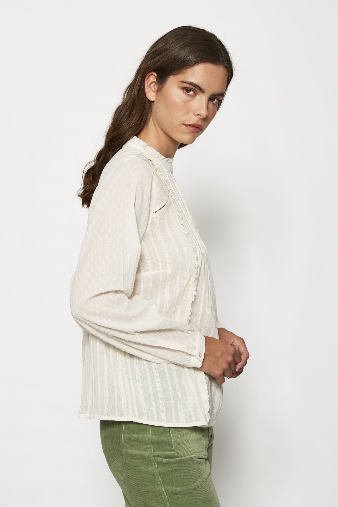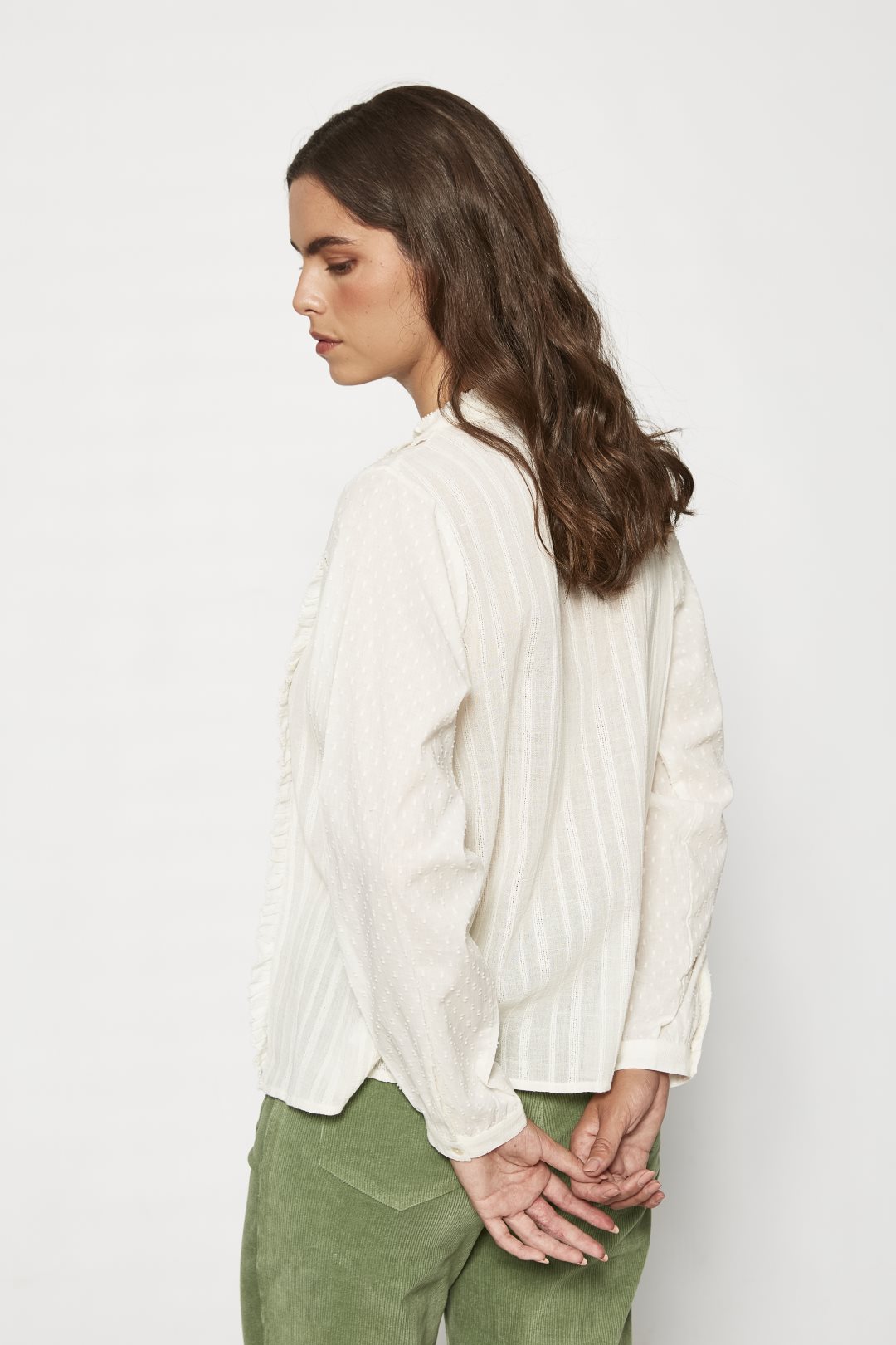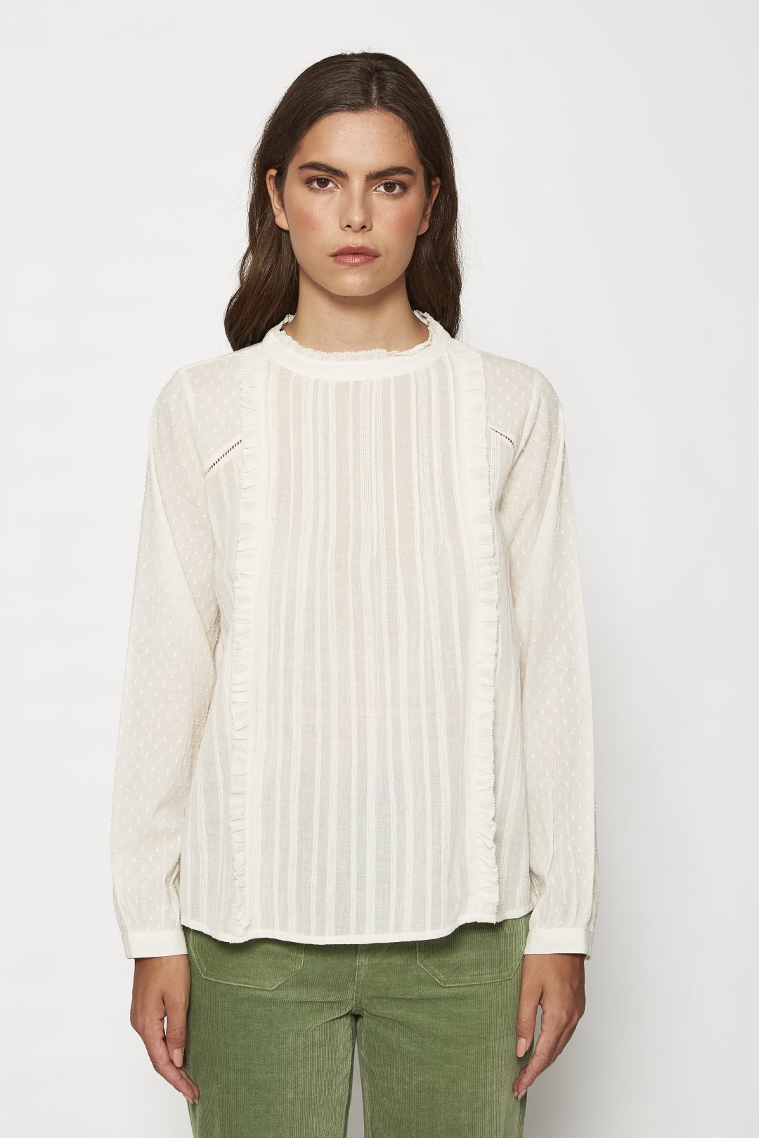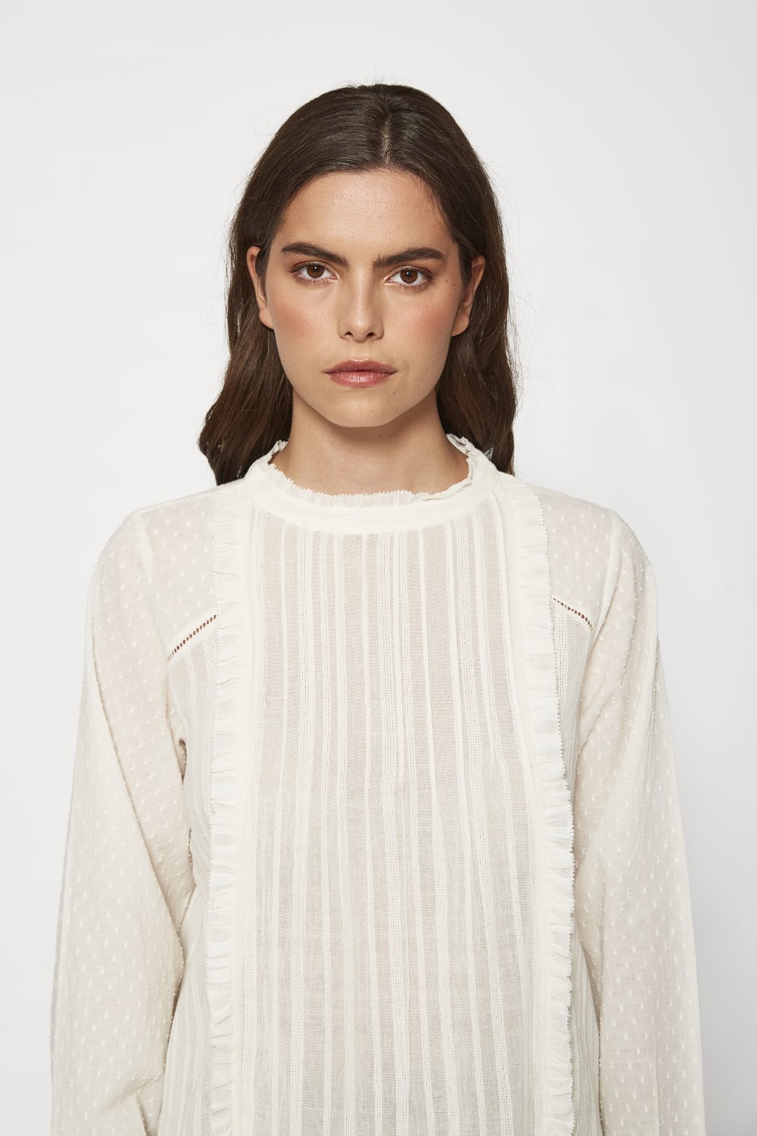 Women’s blouse from MD’M’s autumn-winter collection. Made of 100% cotton, featuring long puff sleeves with plumeti detail that adds texture and delicacy. Includes front mini ruffle and Perkins collar with ruffle, providing a feminine and elegant touch. Lightweight and versatile piece, perfect to pair with trousers or skirts. Available in multiple sizes.