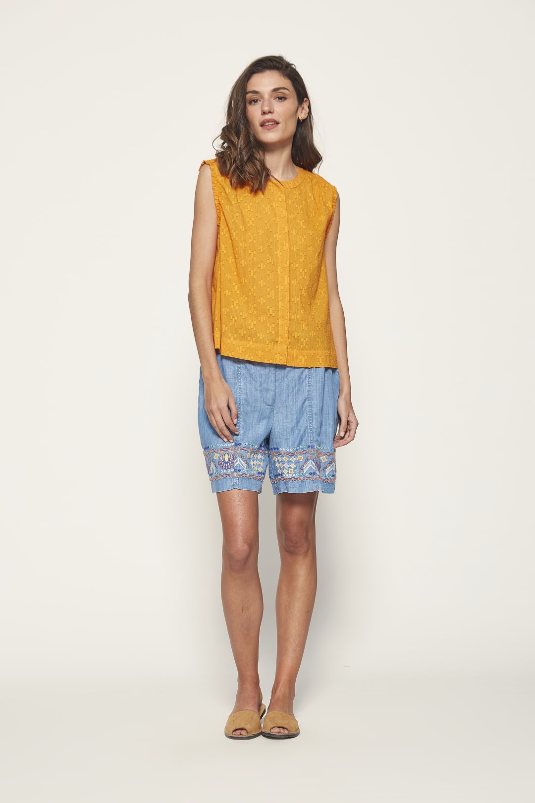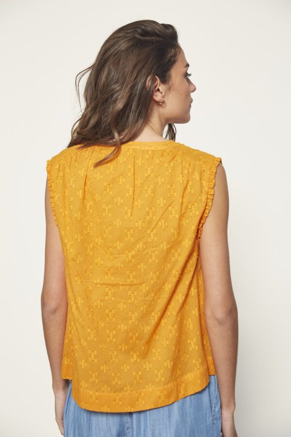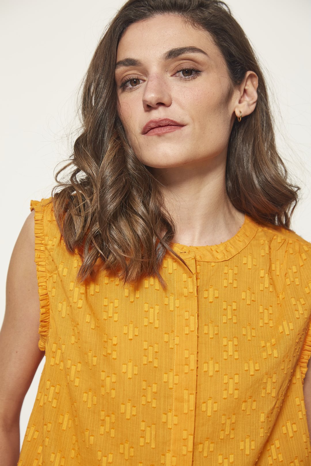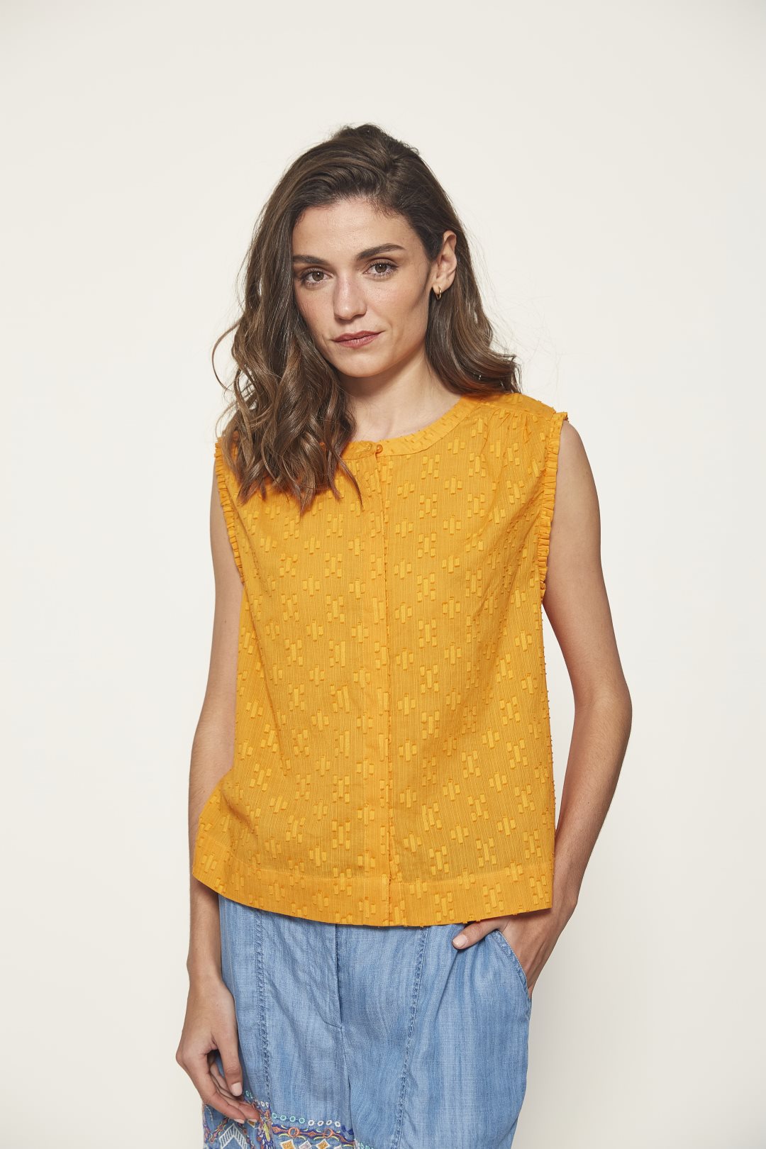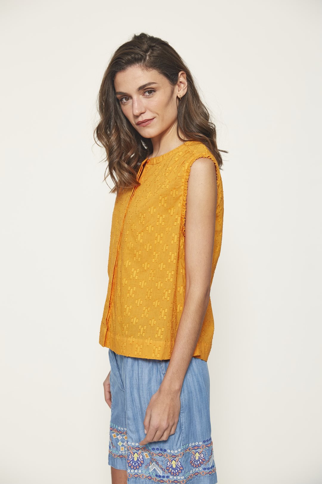 Orange Sleeveless round neck shirt with delicate texture made of 100% cotton. Concealed front button closure.