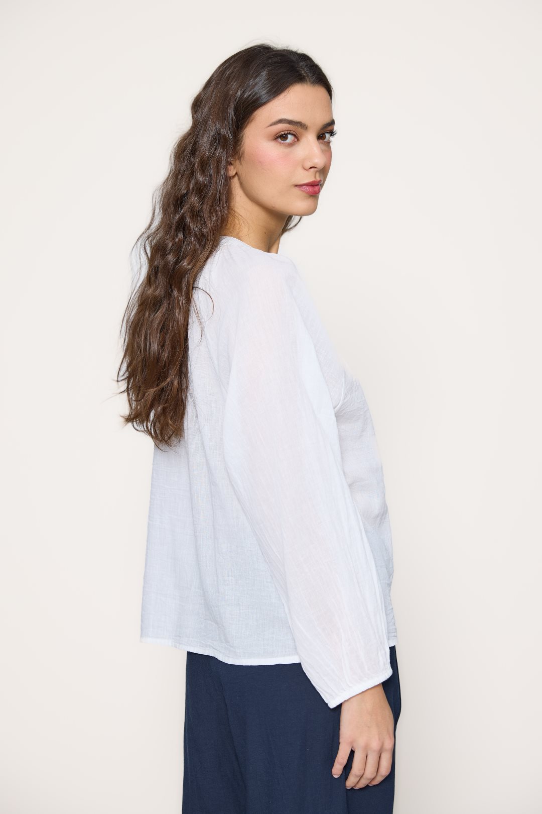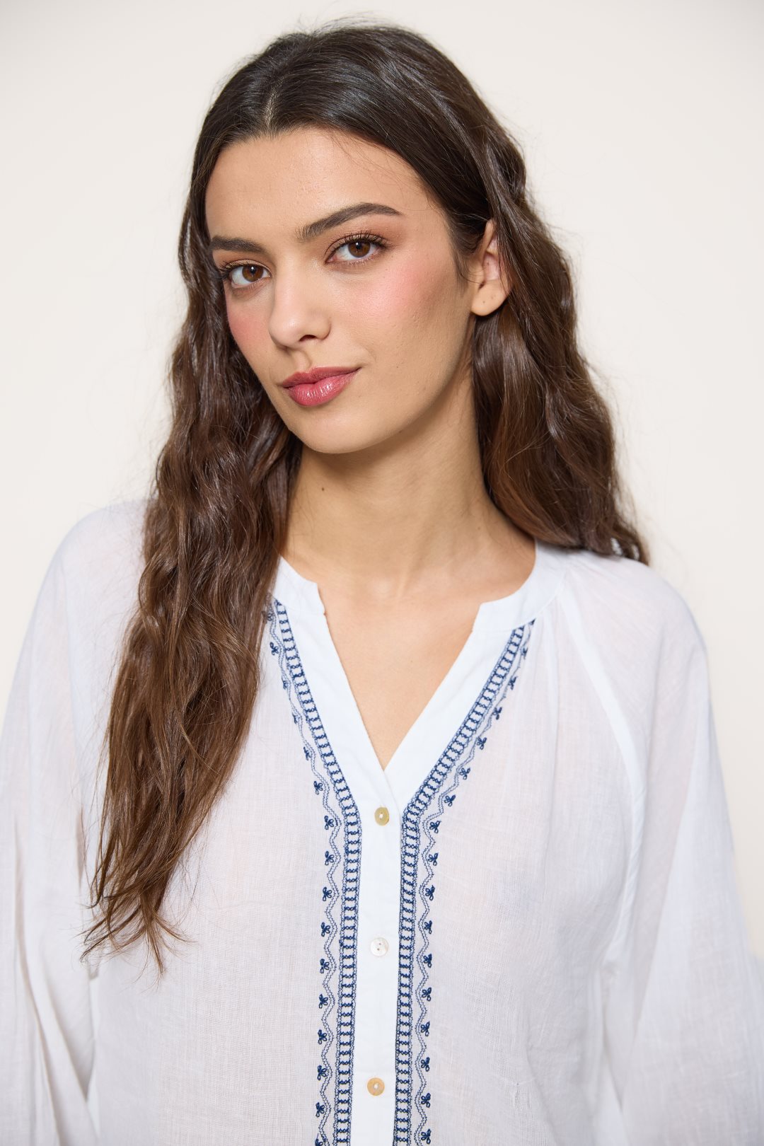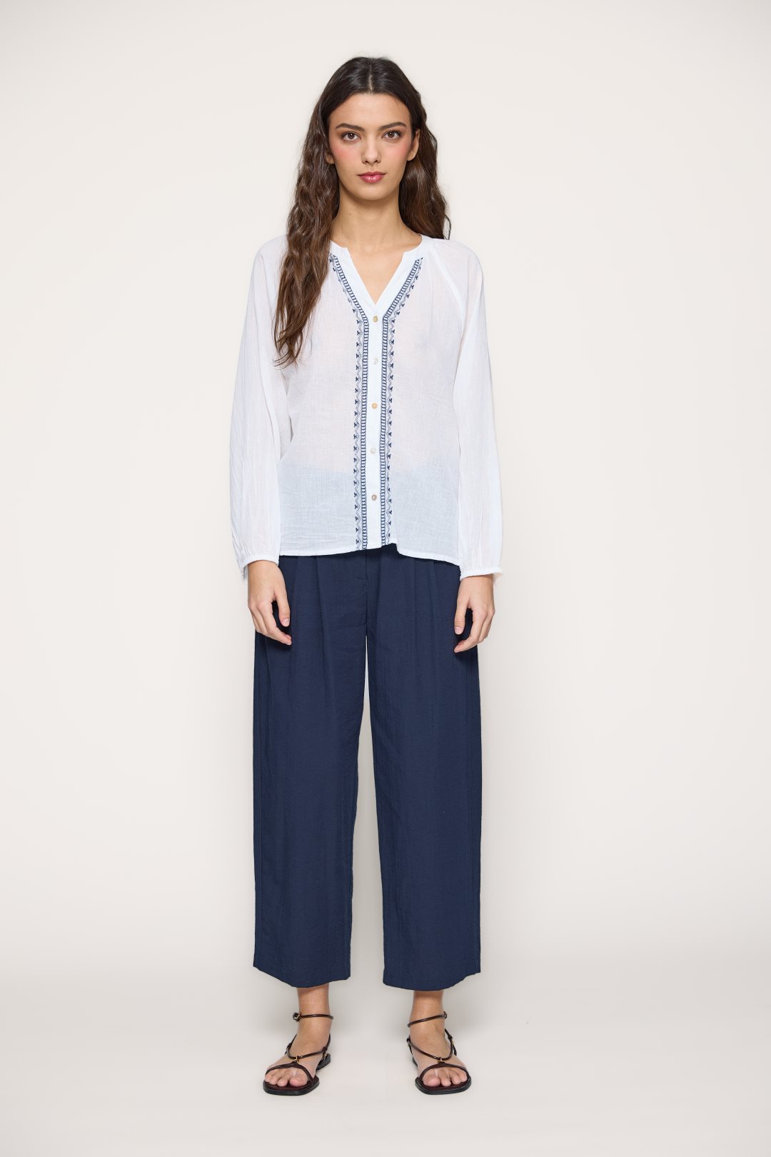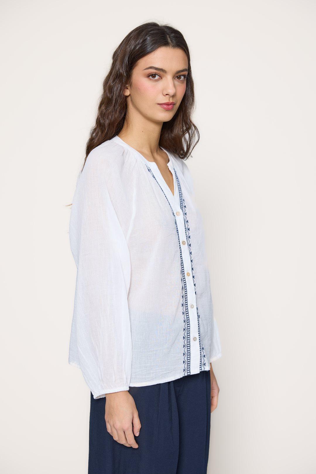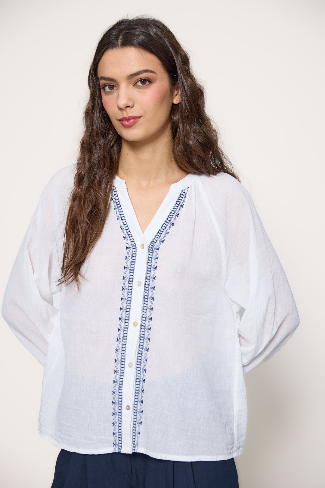 Women’s blouse made of lightweight, breathable 100% cotton. Features navy embroidery along the front, a V-neckline with button placket, and long sleeves with cuffs. Its relaxed fit brings effortless style and comfort — perfect to pair with jeans, skirts, or wide-leg trousers for a breezy summer look.