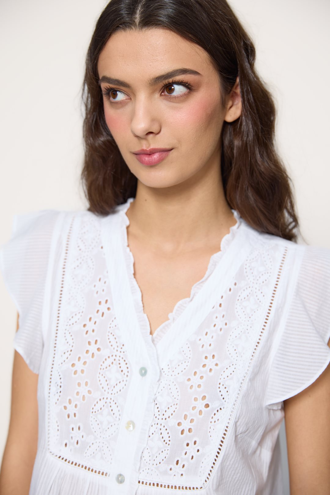 Women’s blouse from MD’M’s spring-summer collection. Made of 100% cotton, it stands out for its romantic design with eyelet embroidery on the top and delicate ruffles along the neckline. With short flutter sleeves and front button closure, it offers freshness and femininity. A light and versatile piece, perfect to pair with seasonal trousers or skirts. Available in several sizes.
