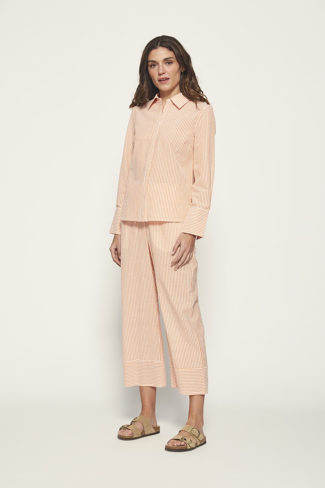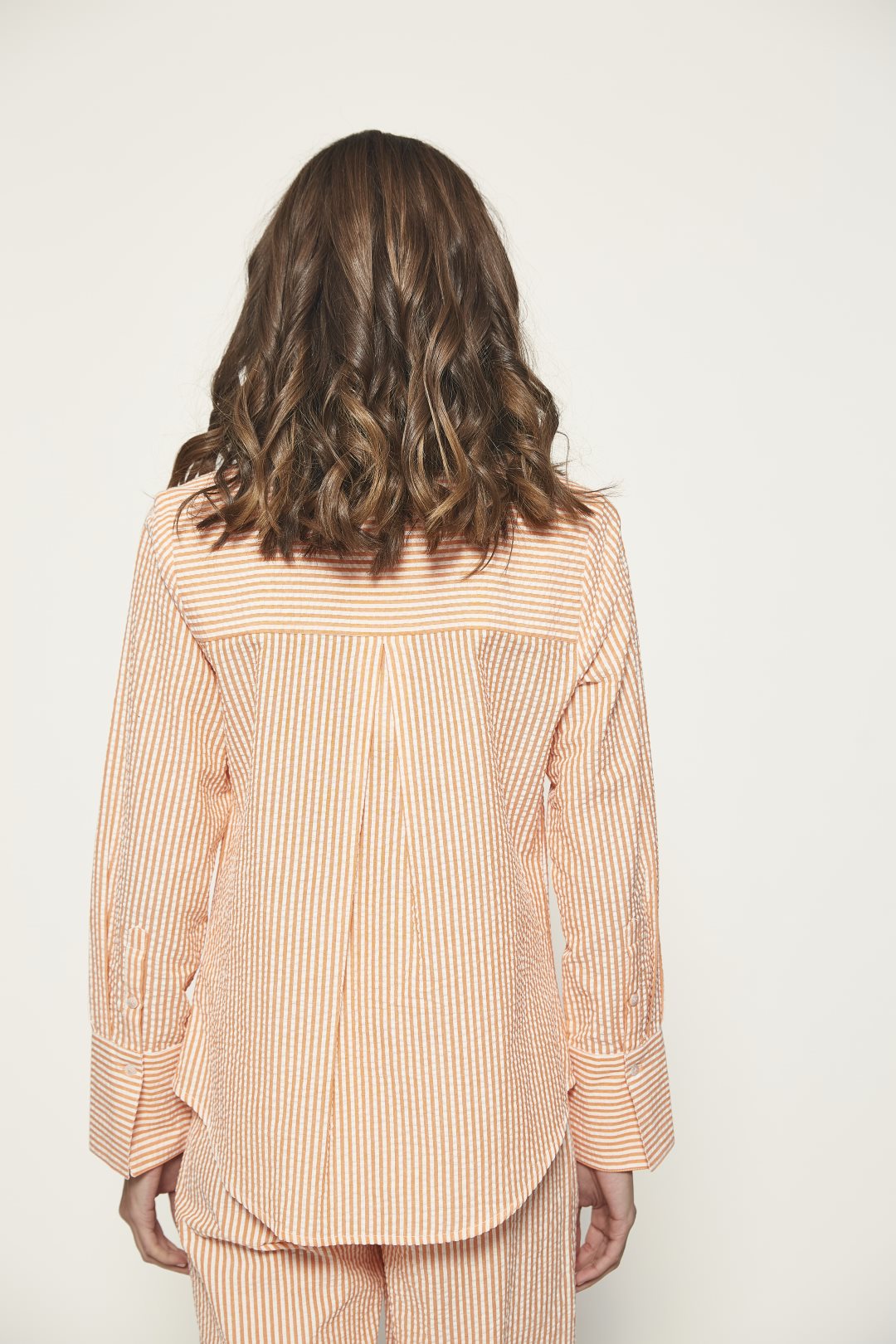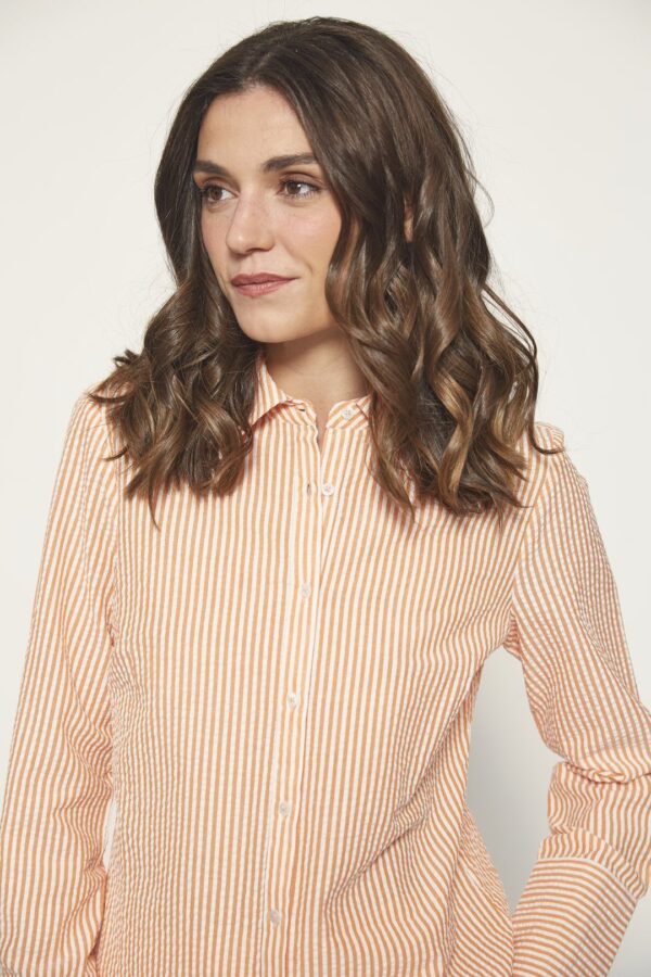 Orange Long-sleeved striped shirt, made from 100% cotton yarn with a sheersucker texture. Front button closure.