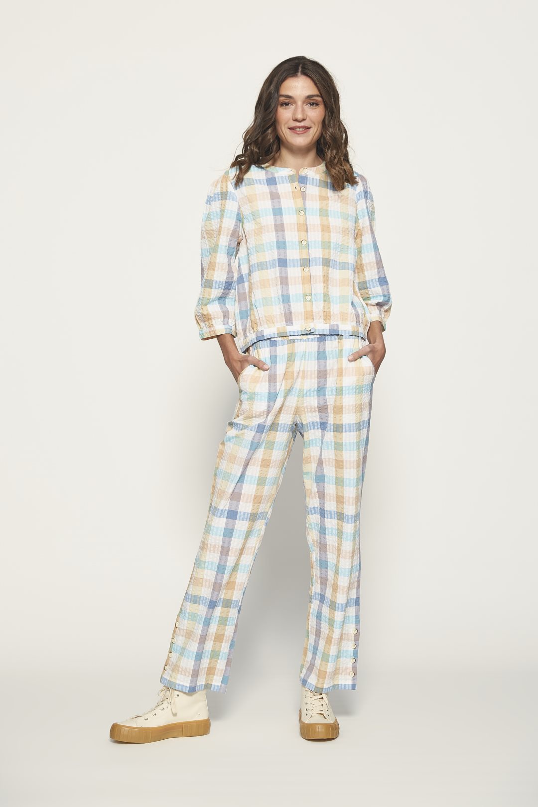 This puff sleeve shirt, crafted from 100% cotton, is the perfect addition to your spring-summer collection. Its checkered fabric adds a unique and versatile touch that fits any occasion. The Mao collar and front button closure give it an elegant and sophisticated finish, while the puffed sleeves subtly enhance the silhouette. Ideal for creating fresh, comfortable, and stylish looks.