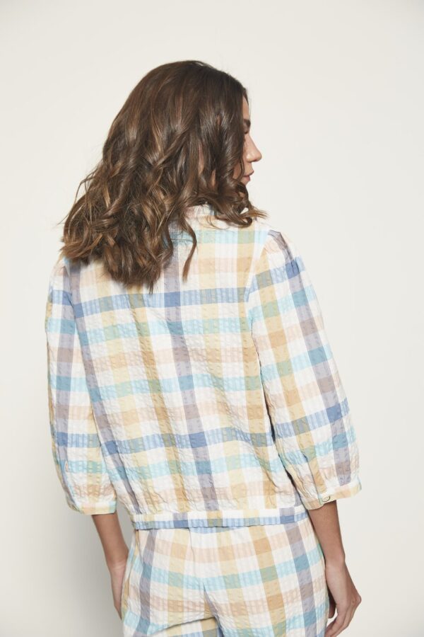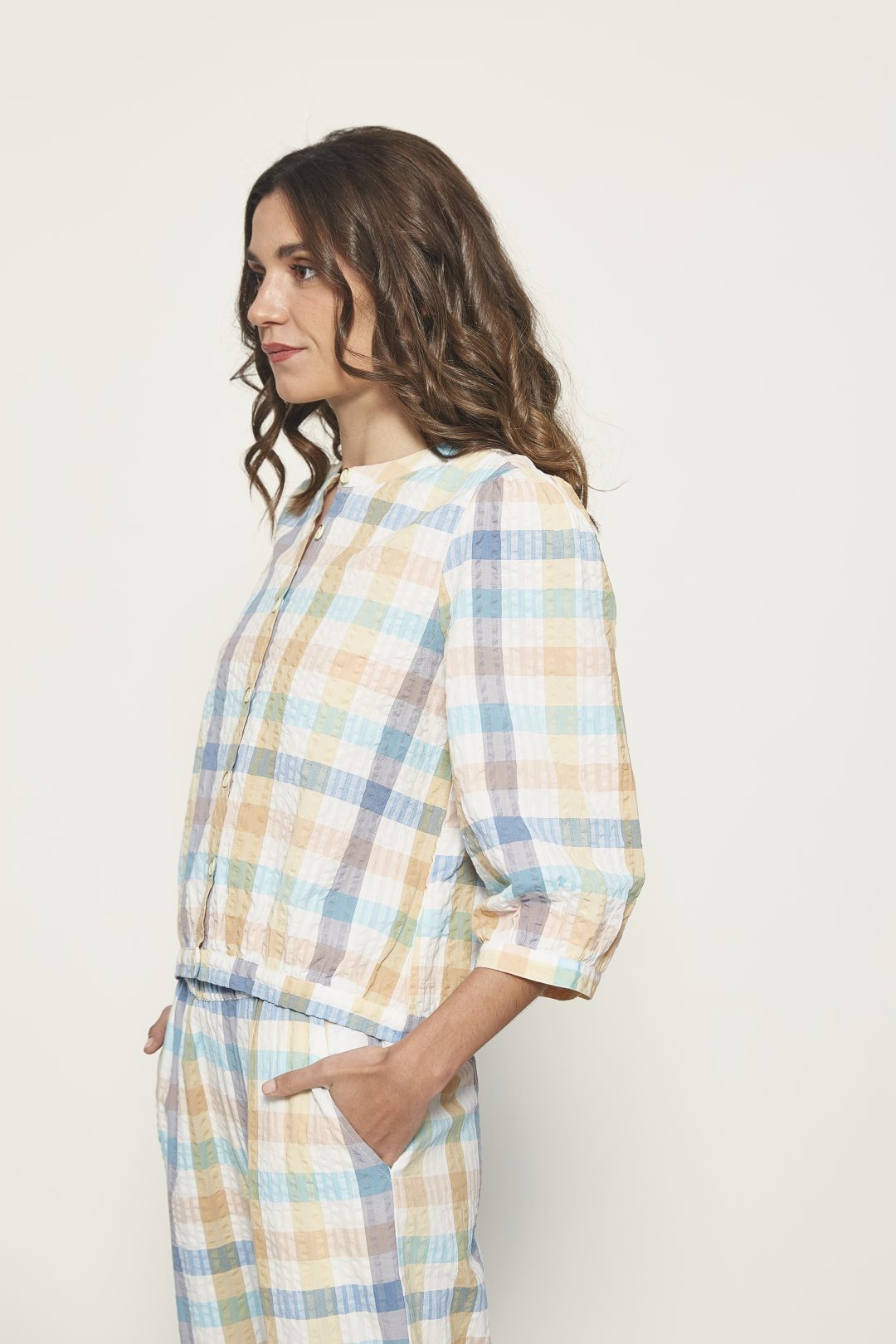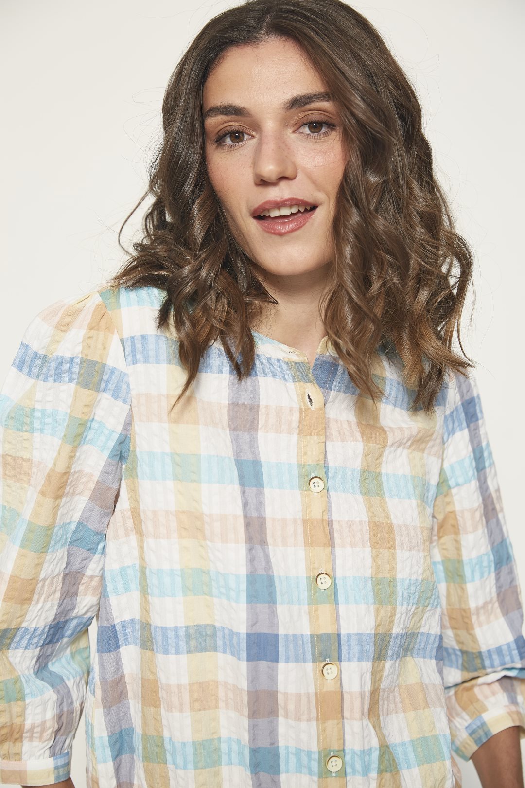 Blue 3/4 puffed sleeve shirt, made of 100% cotton with a checked weave and sheersucker texture. Round neck and front button closure.