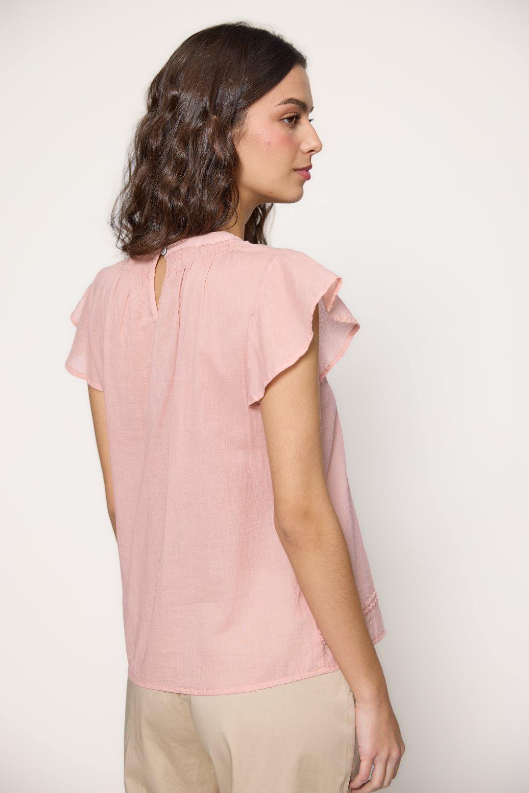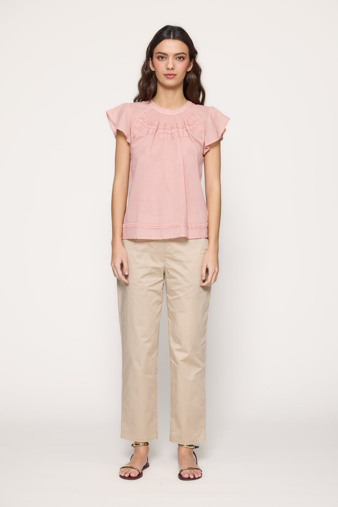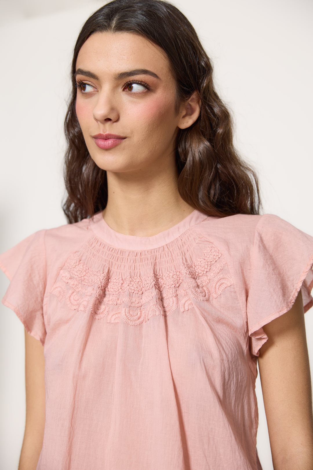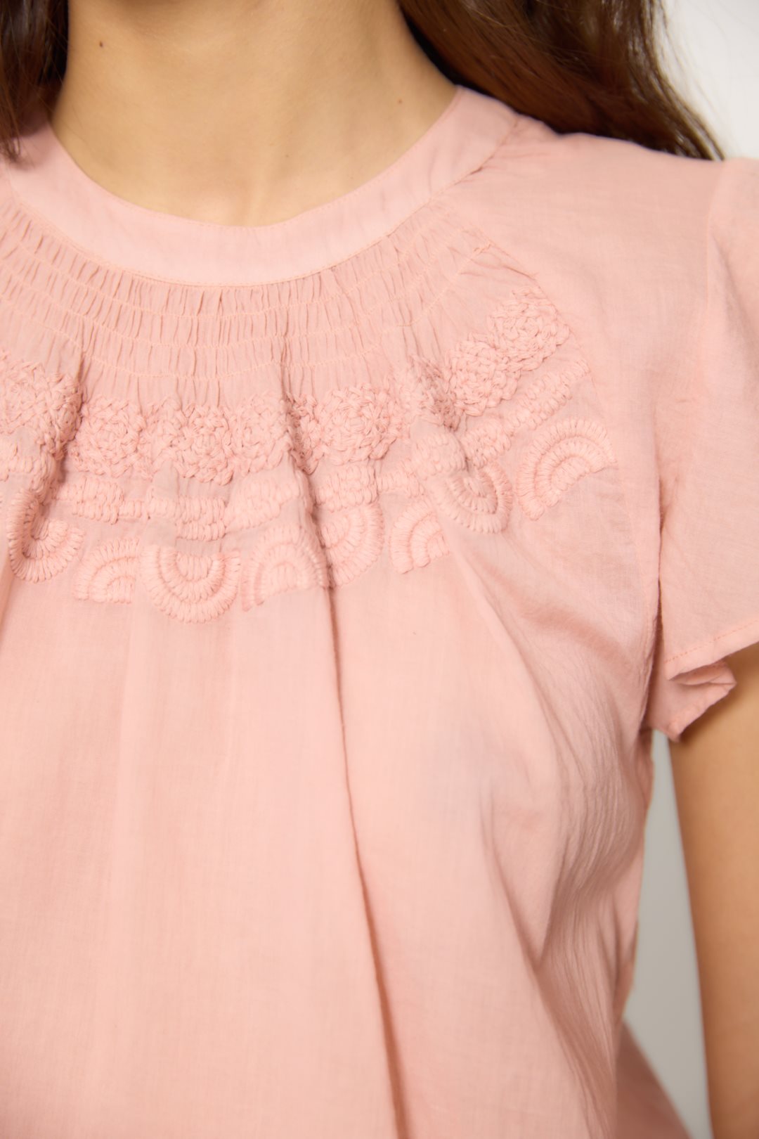 Pink Blouse with round neckline and embroidered detail on the yoke. Made of 100% cotton.