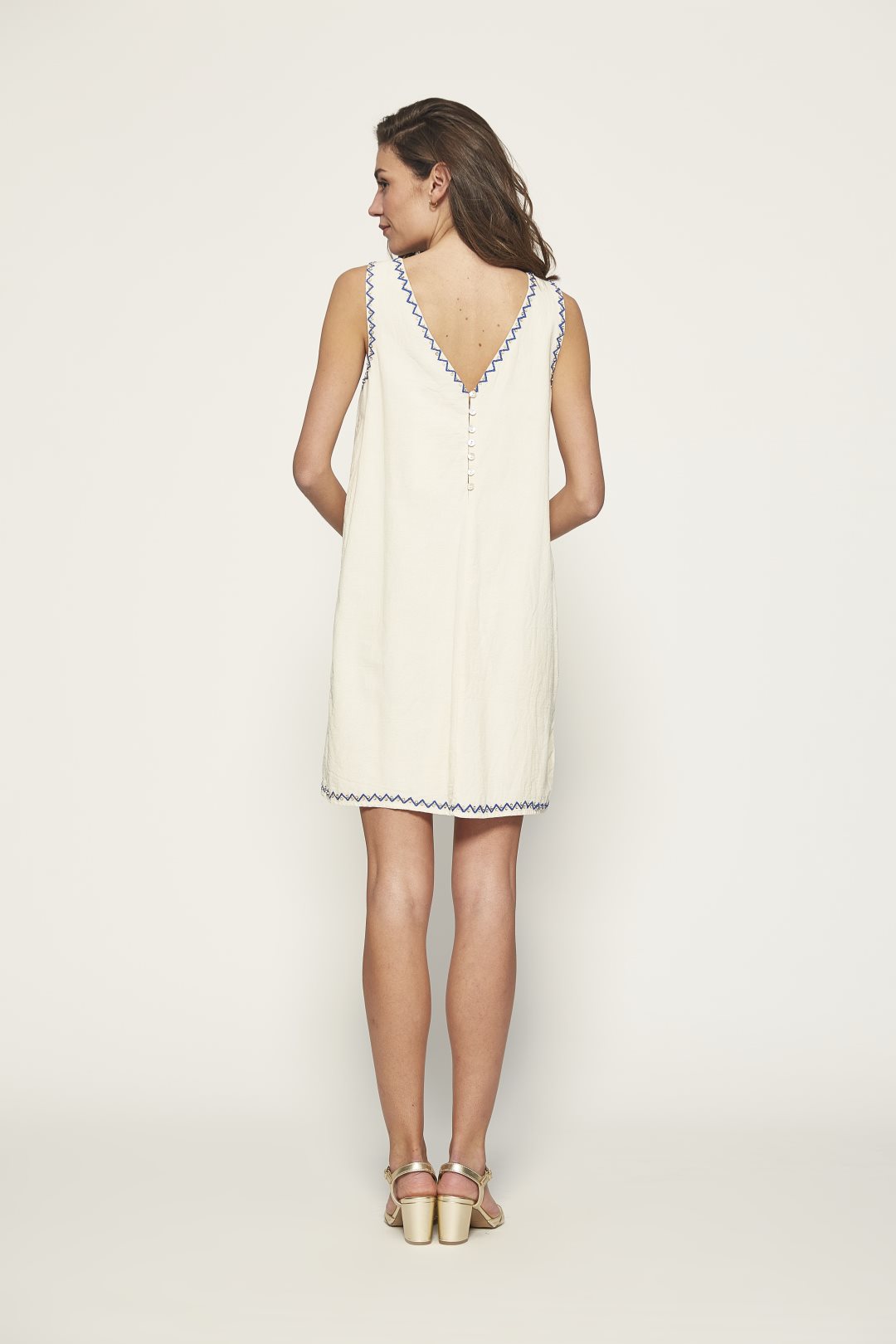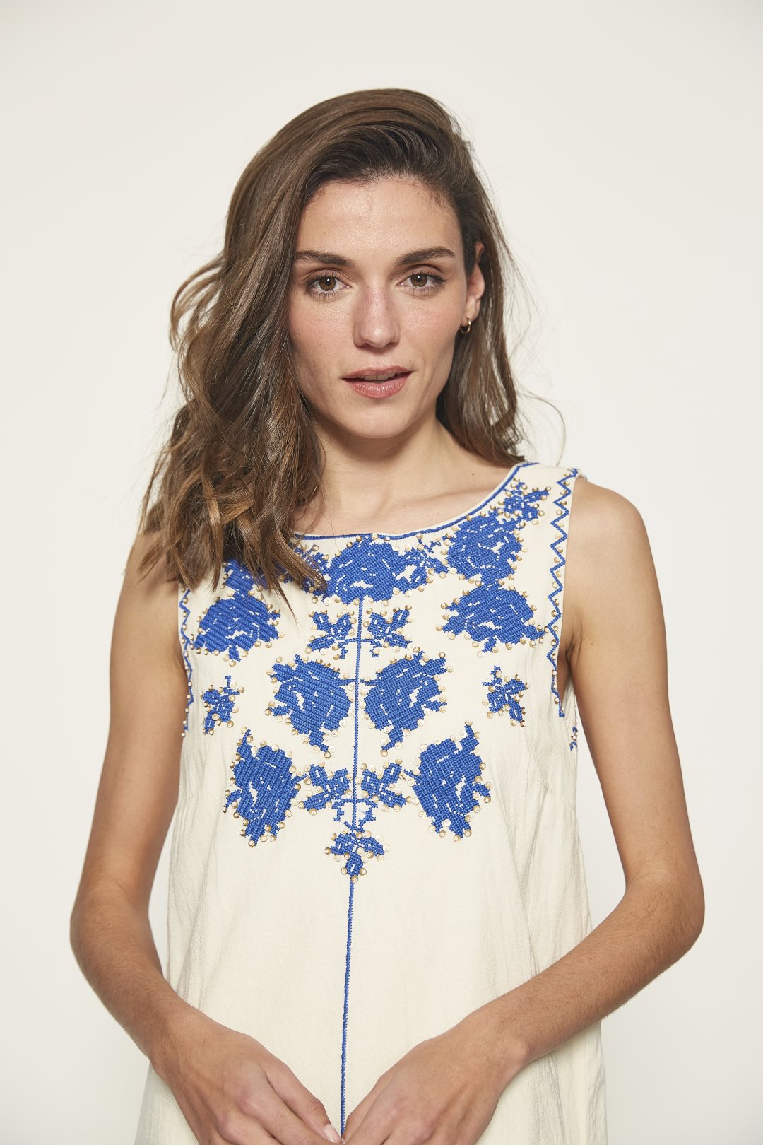 Ecru Short flared sleeveless dress, made of 100% cotton, with details embroidered with thread and beads. Pearlescent buttons on the back. Part of the exclusive MD’M STUDIO collection.