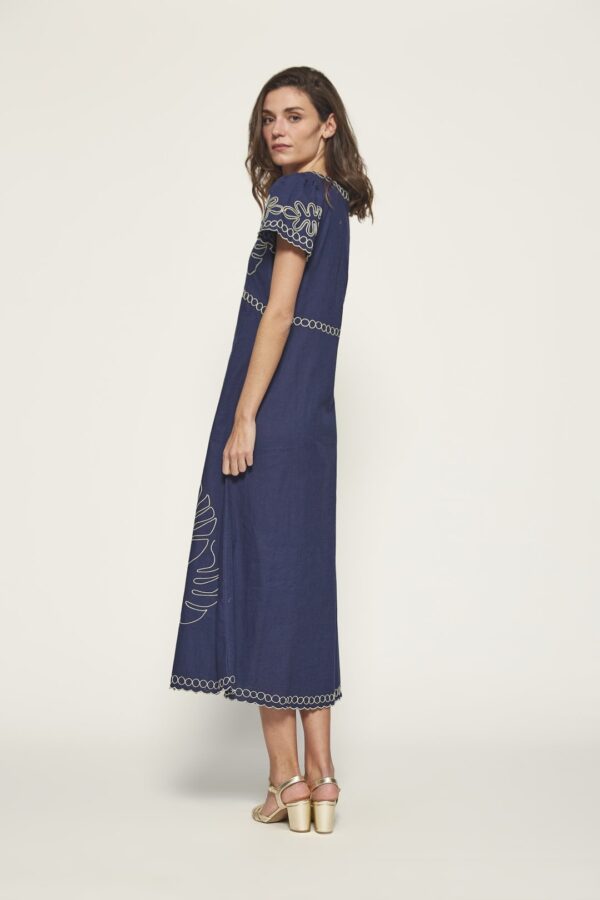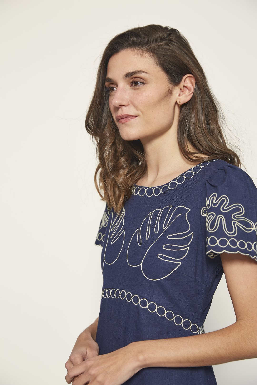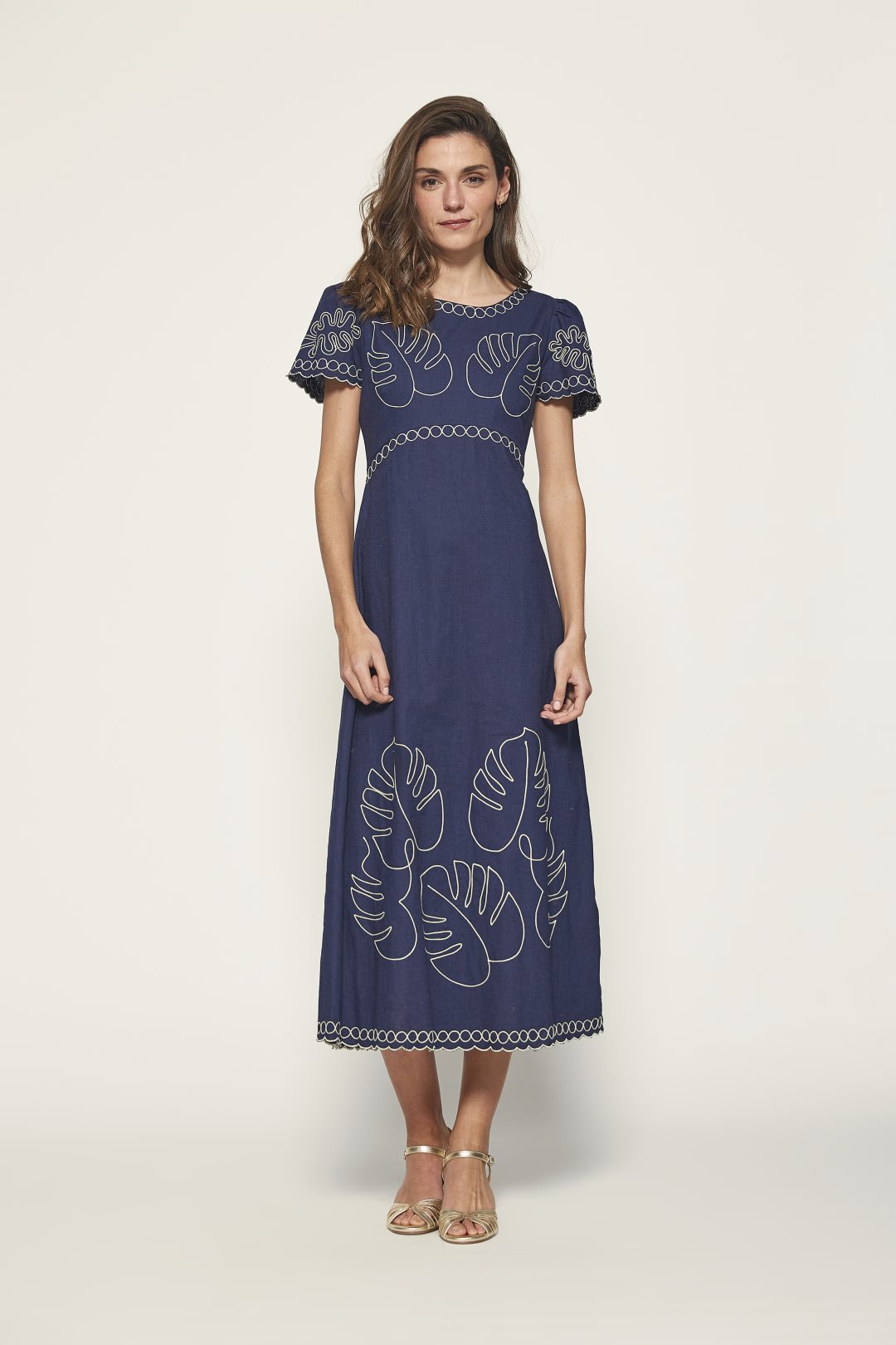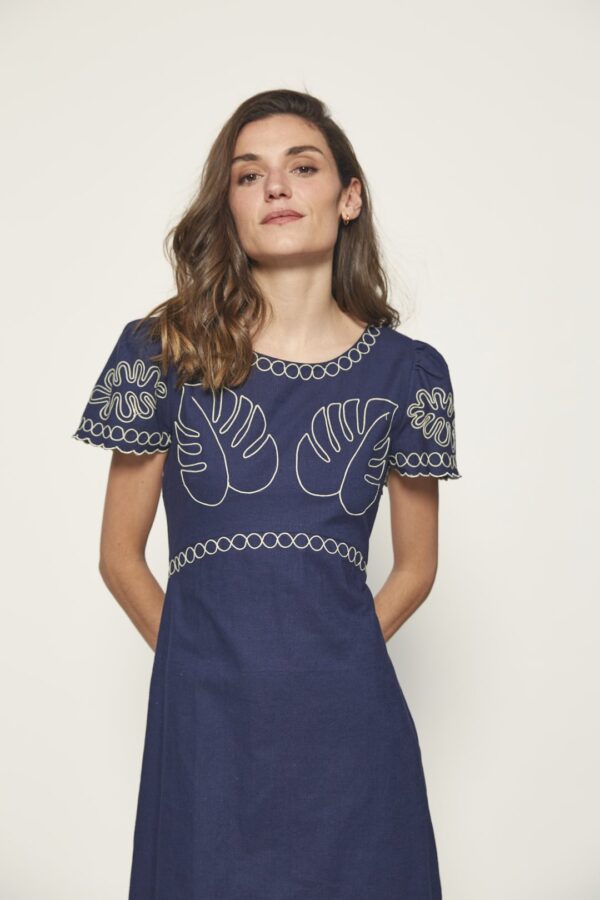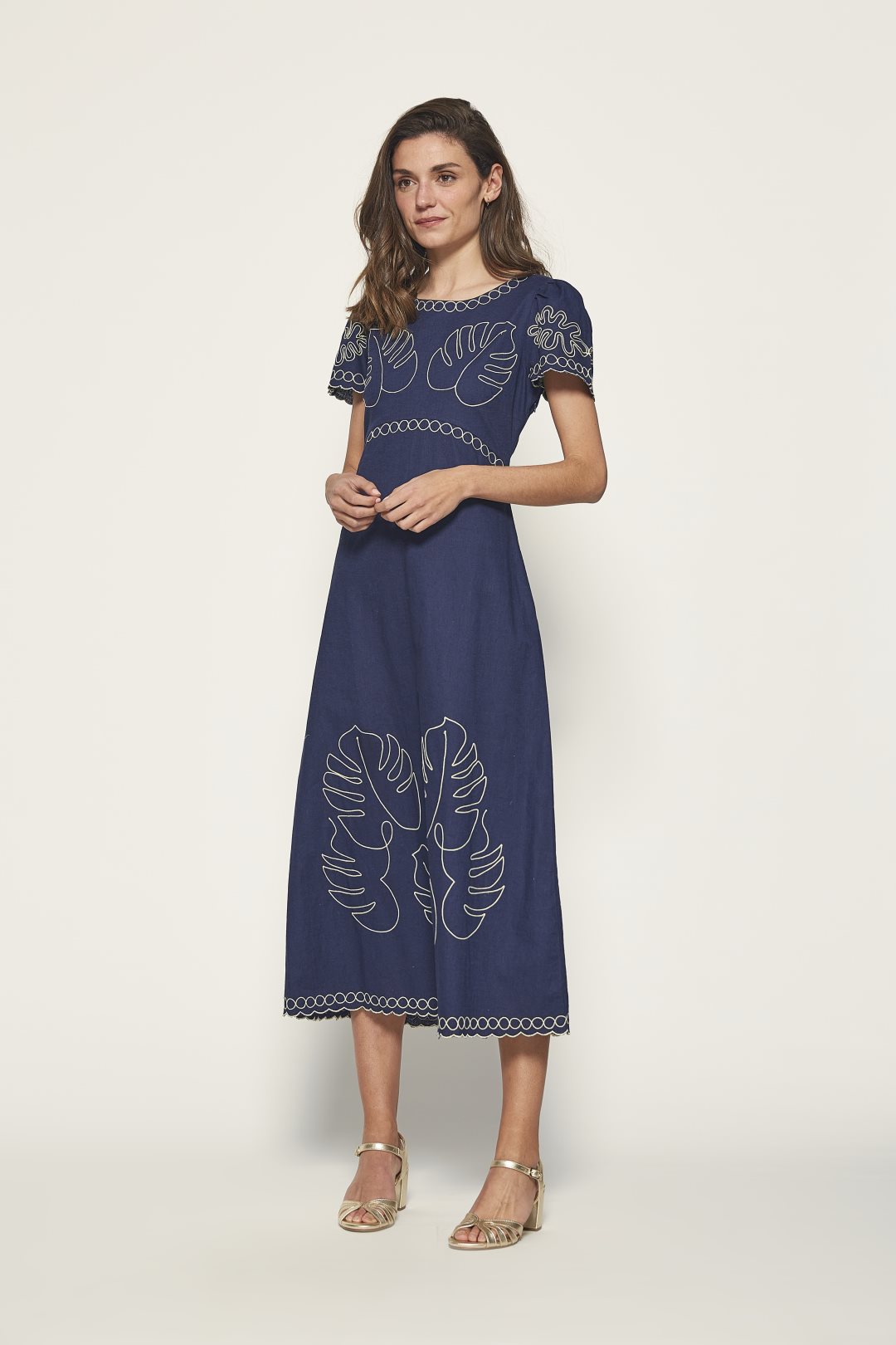 This midi dress from the MD’M STUDIO collection is designed to highlight your elegance at any event. Made from a blend of linen and cotton, it offers comfort and breathability on warmer days. The delicate leaf embroidery adds a sophisticated and feminine touch, while the short sleeves and round neckline create a flattering silhouette for the spring-summer season. Ideal for guests, its versatile design makes it the perfect choice for special occasions, combining both style and comfort.