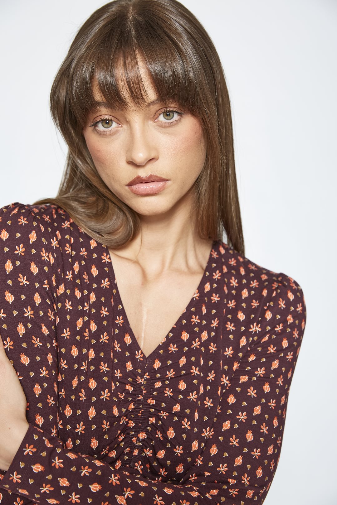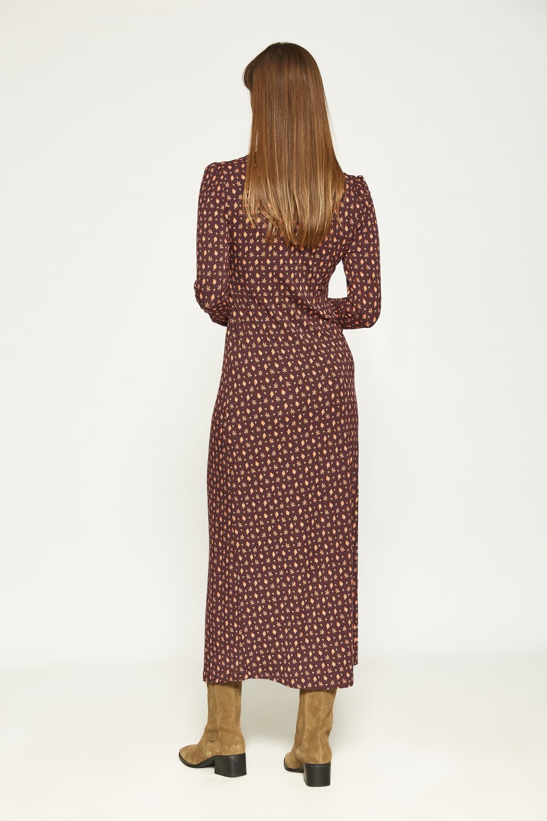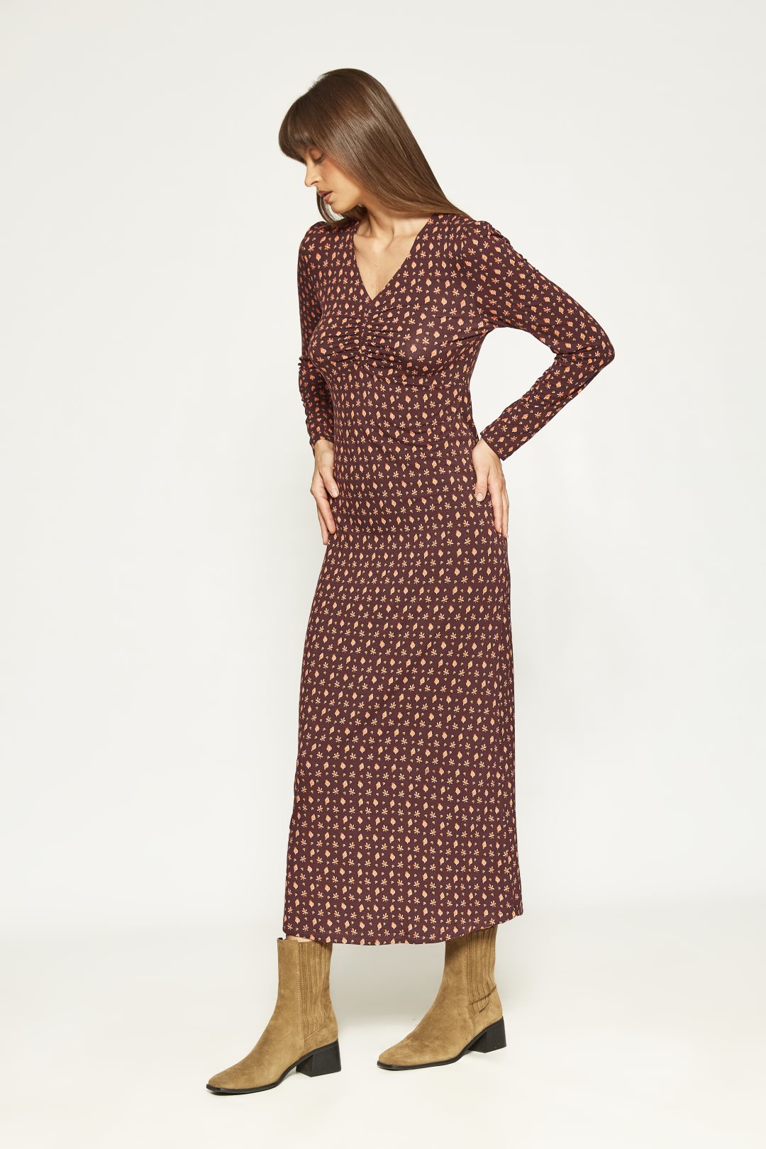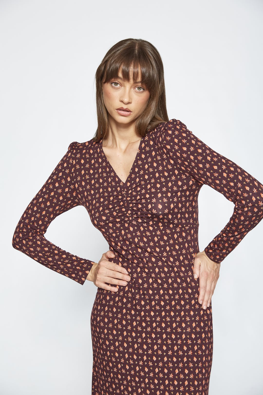 Brown Midi viscose knit dress with liberty print, V-neckline and long sleeves.