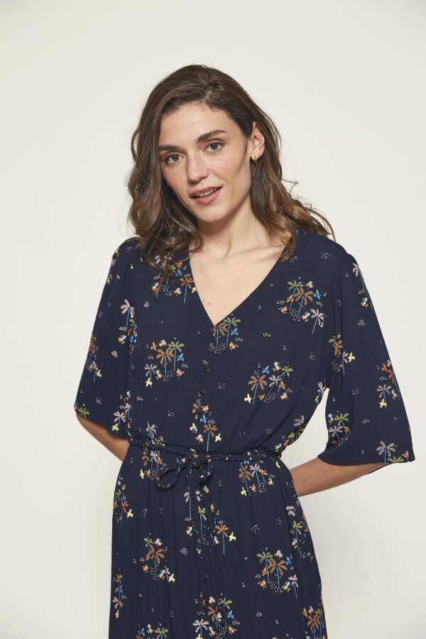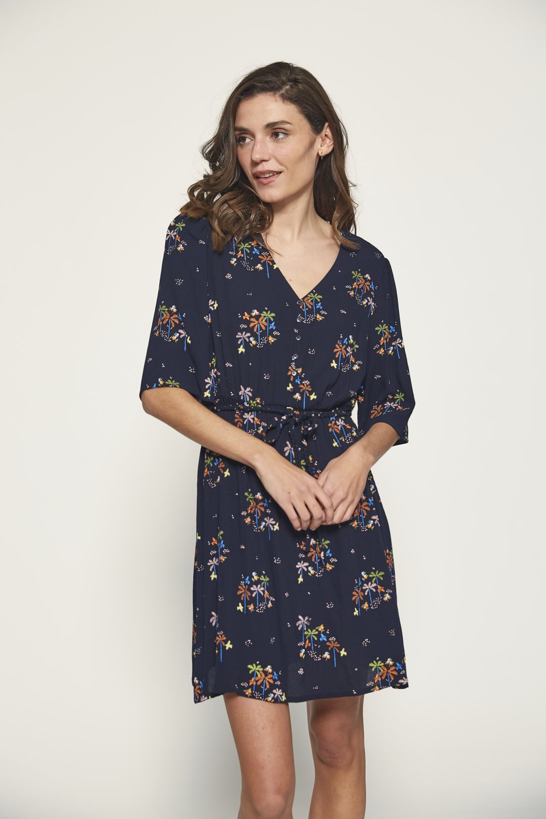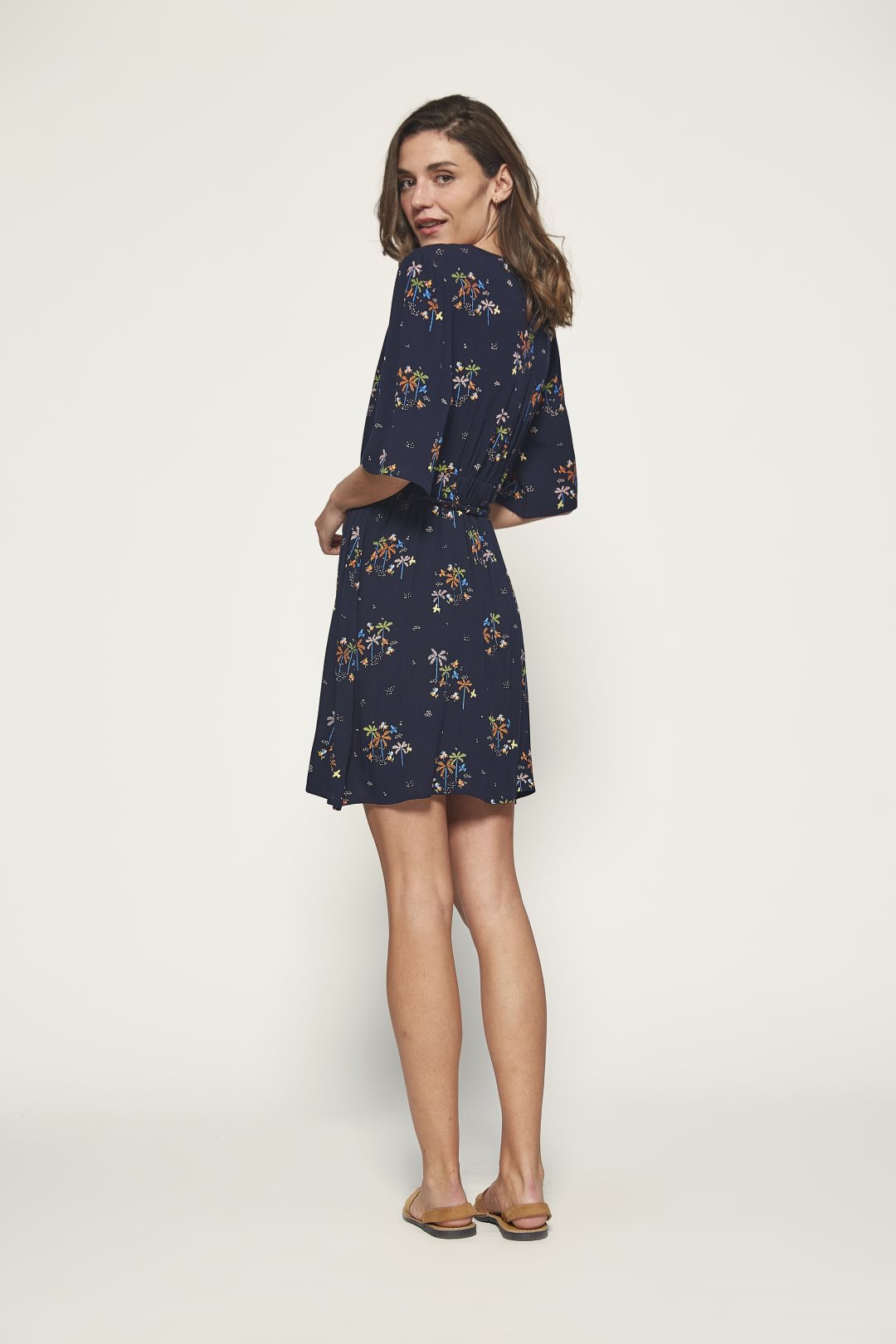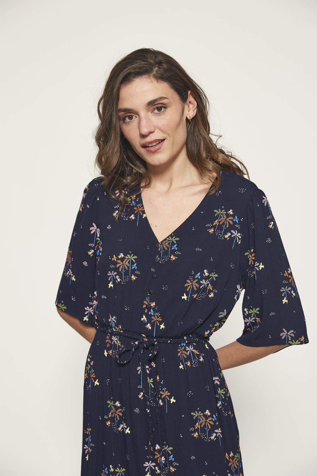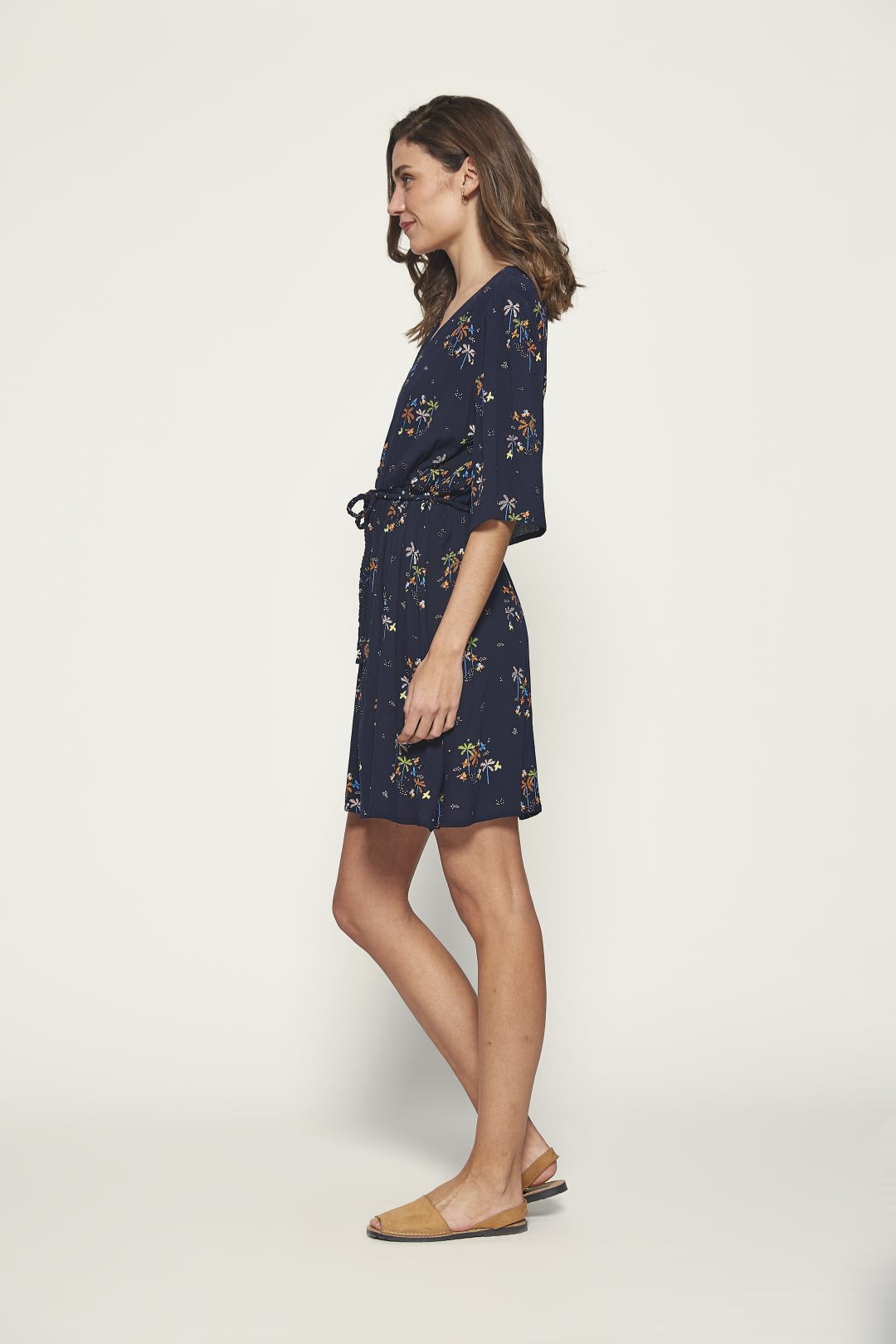 Navi Short viscose dress with micro palm tree print, short sleeves and V-neck. Braided belt to adjust the silhouette.