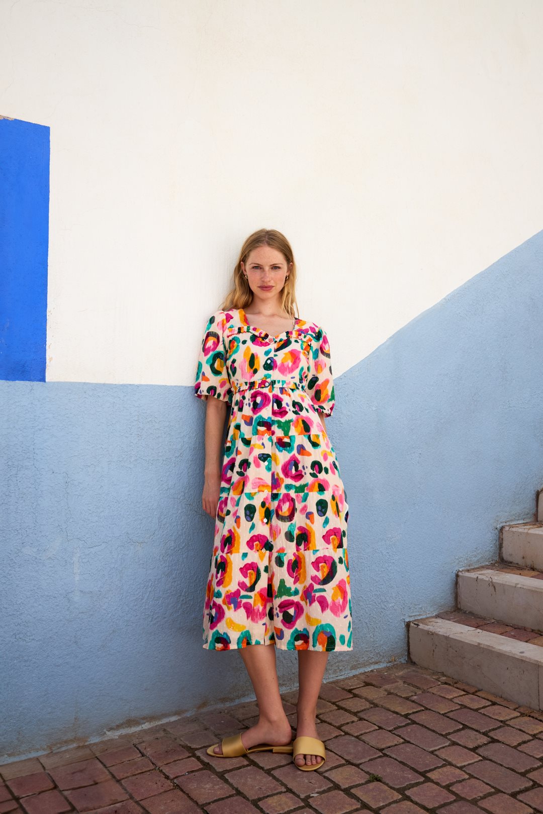 Embrace the summer with this short viscose dress, a lightweight and comfortable piece perfect for hot days. The palm print adds a modern tropical touch, while the short sleeves and V-neckline offer a fresh and flattering silhouette. The adjustable waist with a drawstring allows for a personalized fit, ensuring comfort and style all day long. Perfect for outdoor strolls, casual dinners, or any summer occasion, this dress is a versatile option that pairs beautifully with sandals or sneakers.