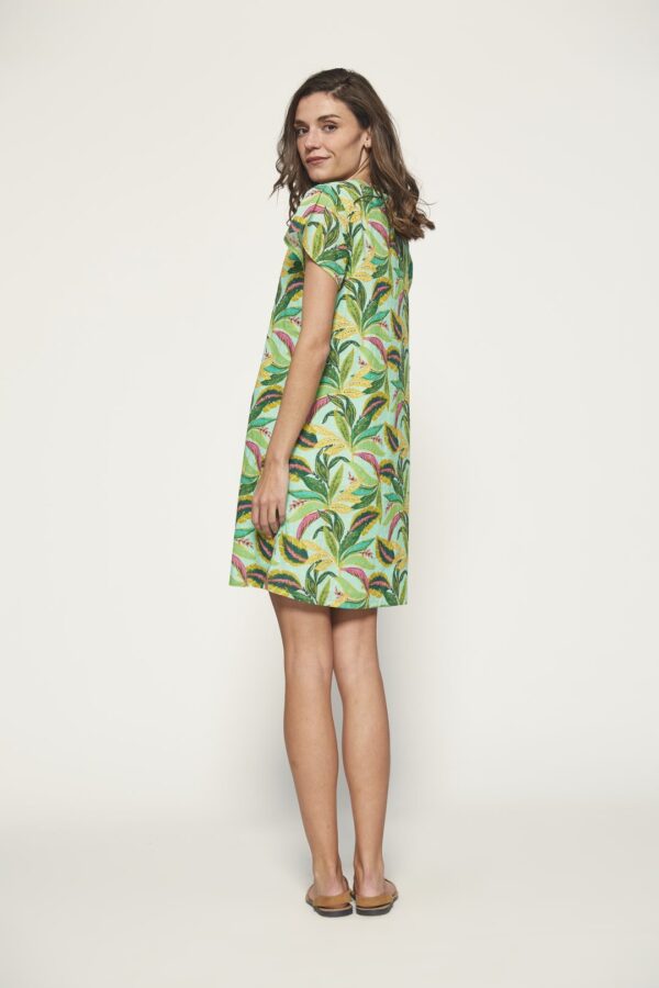 Embrace the summer with this charming short dress, crafted from 100% cotton to provide comfort and breathability all day long. Featuring a lively tropical print, this short sleeve design is ideal for warmer days. Its versatile style allows you to pair it with sandals or sneakers for a relaxed and vibrant look. Make your spring and summer unforgettable with this must-have seasonal piece!