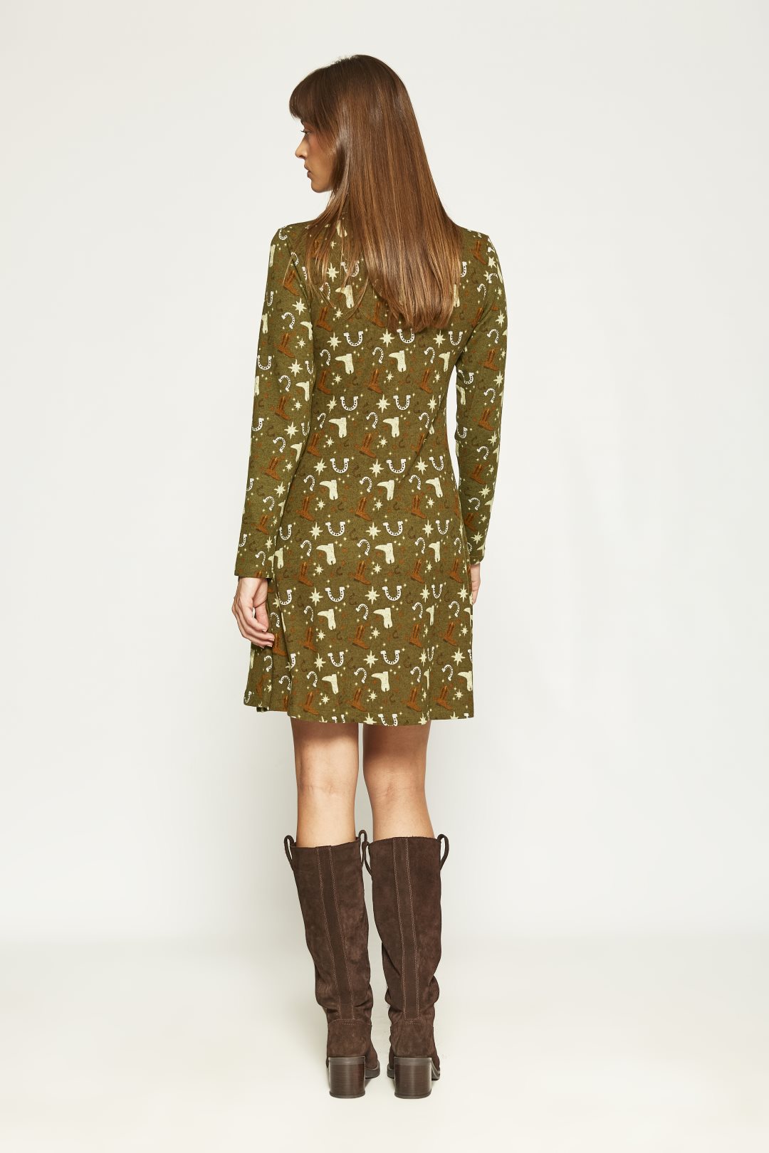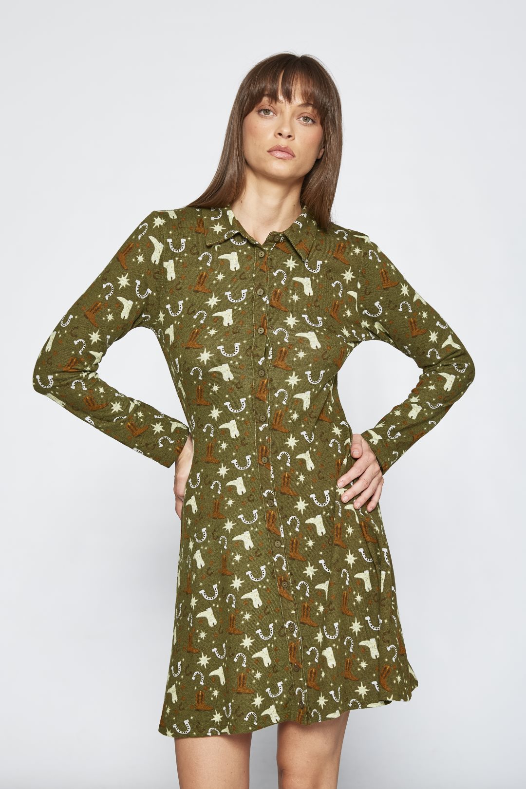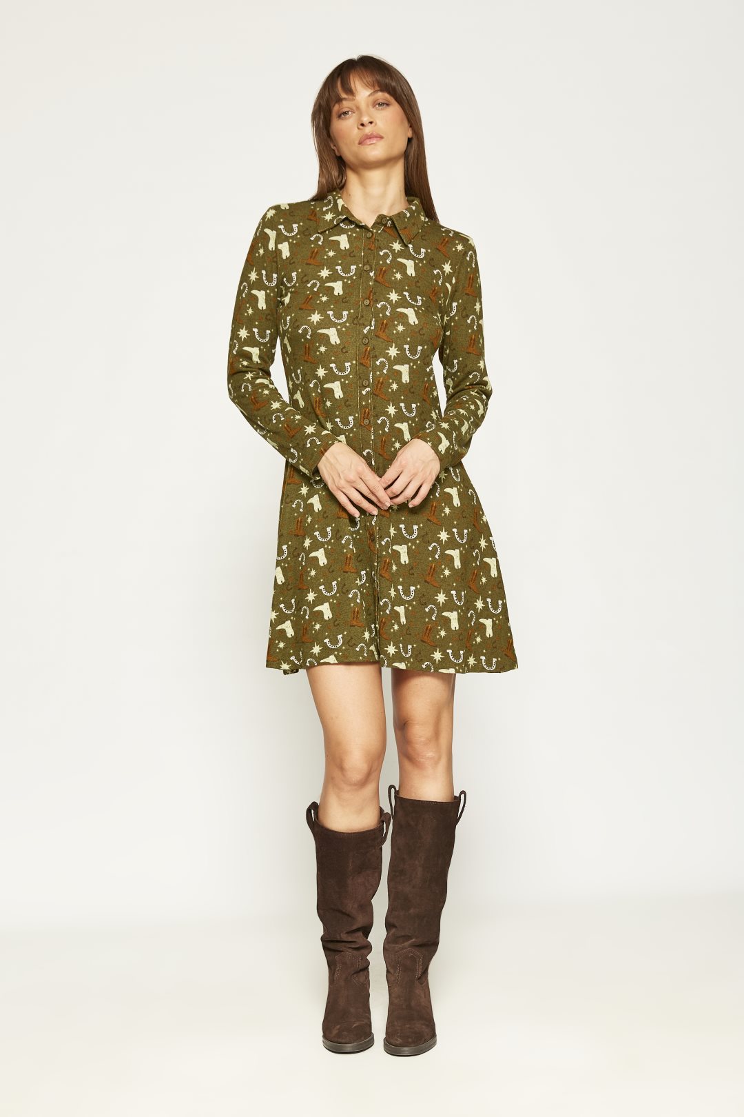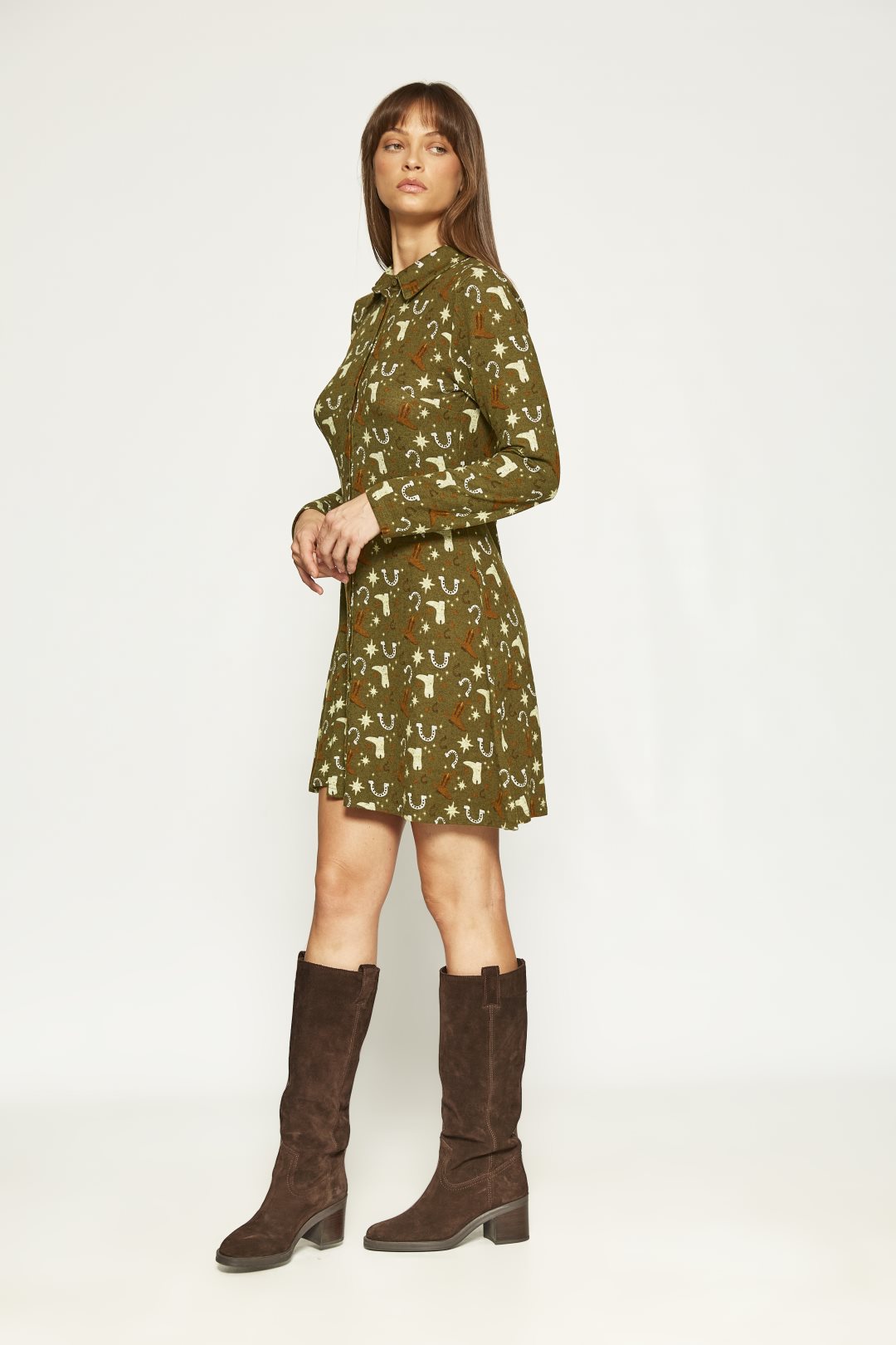 Women’s dress from MD’M’s autumn-winter collection. Made of knit fabric, it features a shirt collar, front button closure and a cowboy motif print that adds an original design. Long sleeves and flared skirt provide movement and comfort. Versatile and stylish piece for the season. Available in multiple sizes.