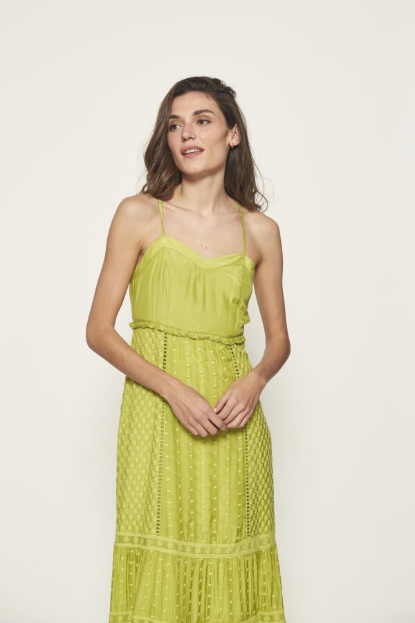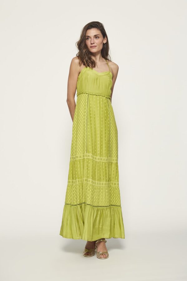 Green Vestido largo de tirantes confeccionado en mezcla de cupro con bordados a tono. Pertenece a la colección MD’M STUDIO.
