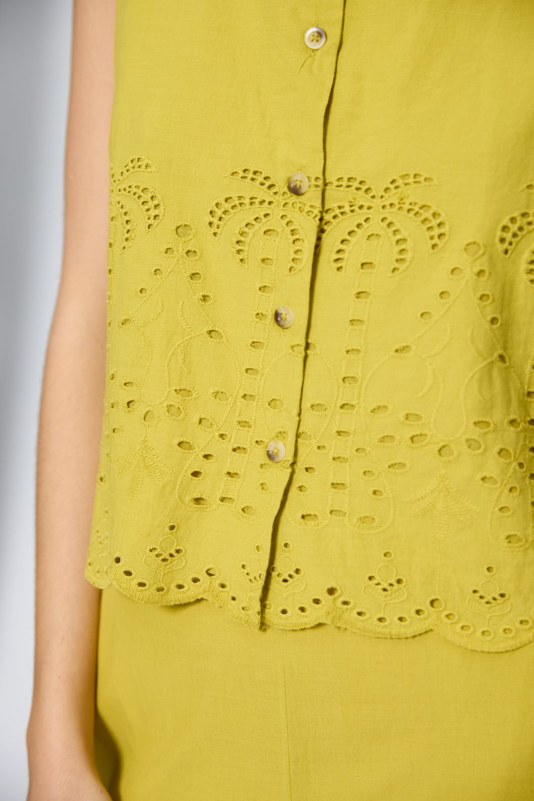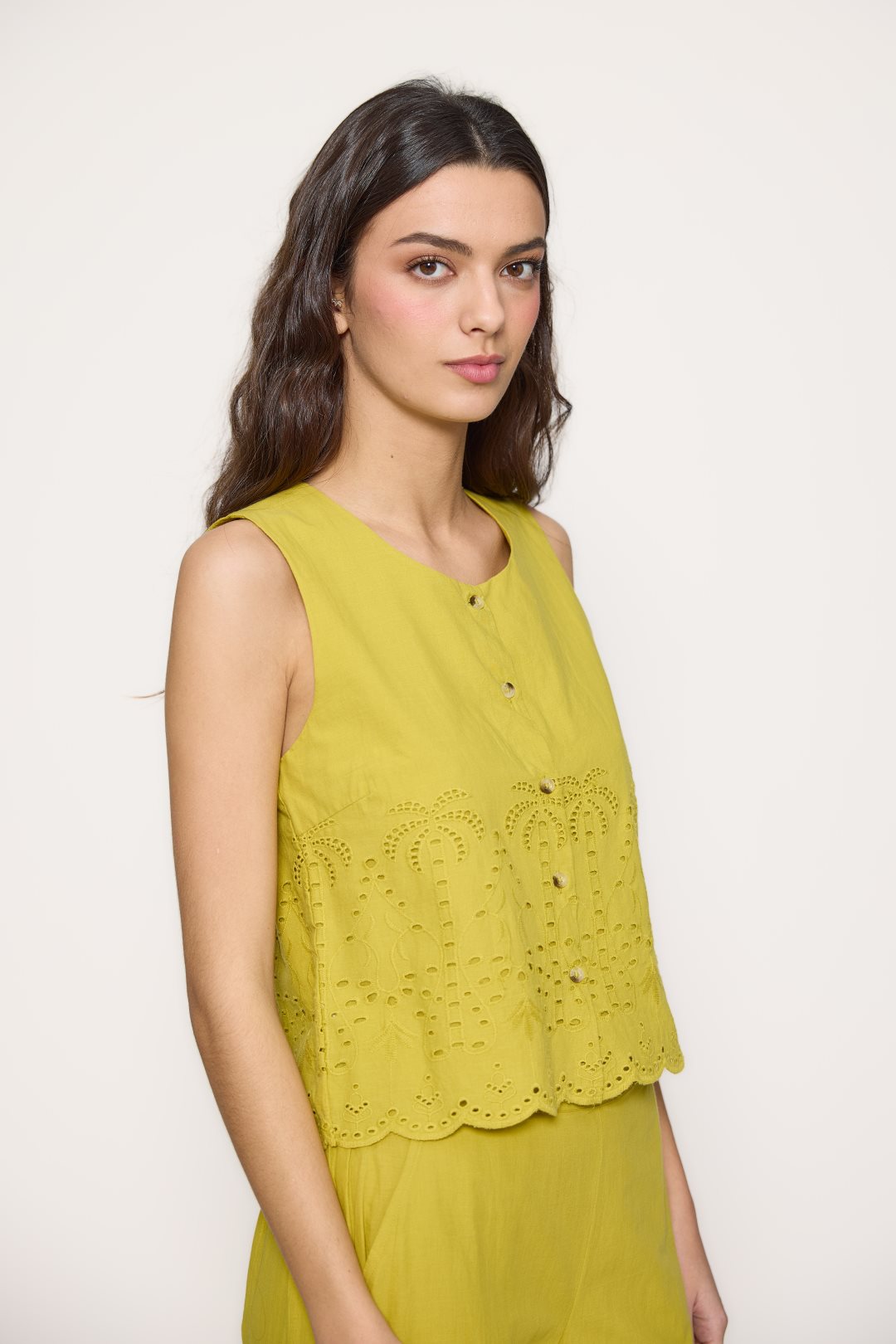 Yellow Sleeveless vest with button closure at the front. It features cutouts at the hem that add a handcrafted and feminine style.