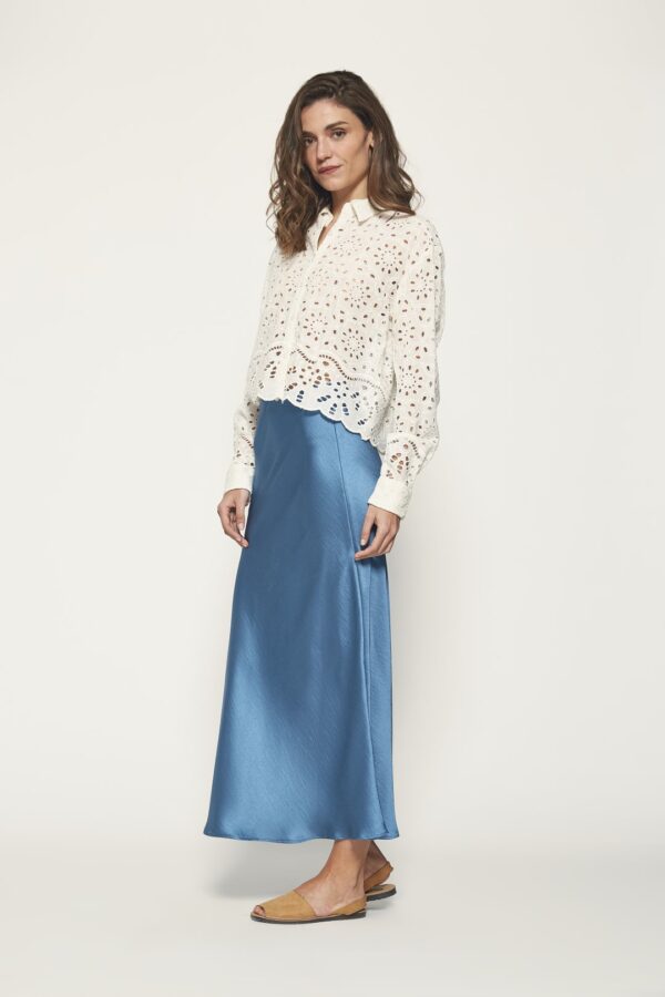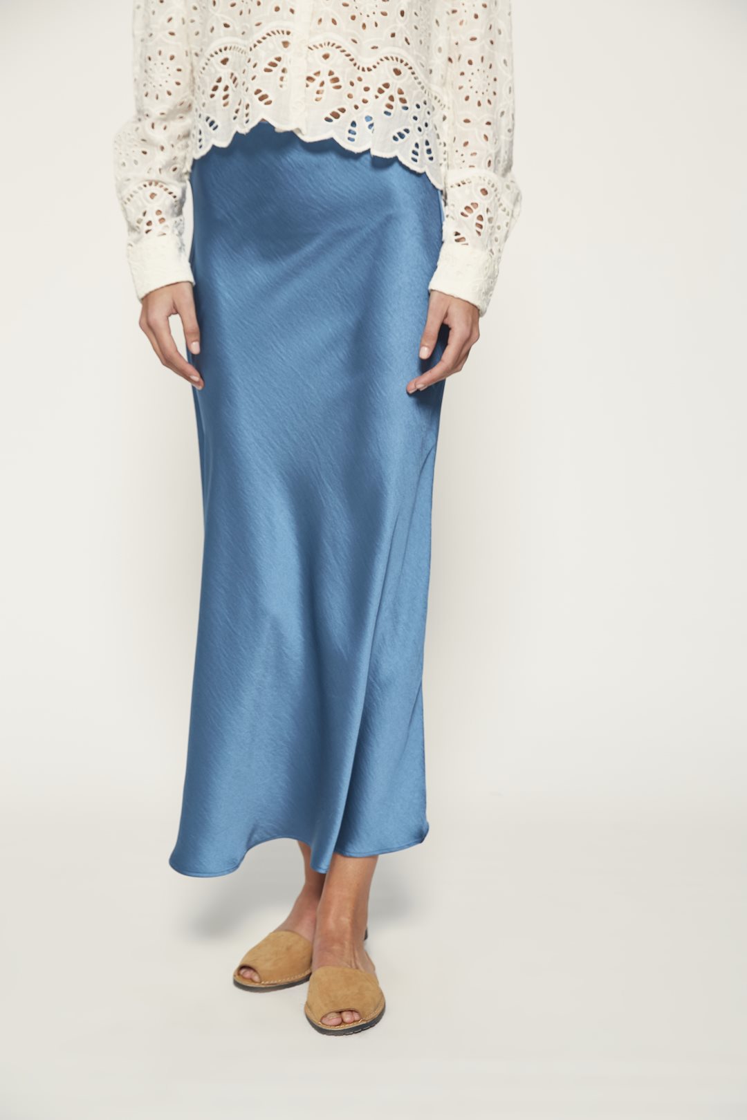 Blue Satin midi skirt with invisible elastic waistband, ideal for special occasions. Part of the MD’M STUDIO guest collection.