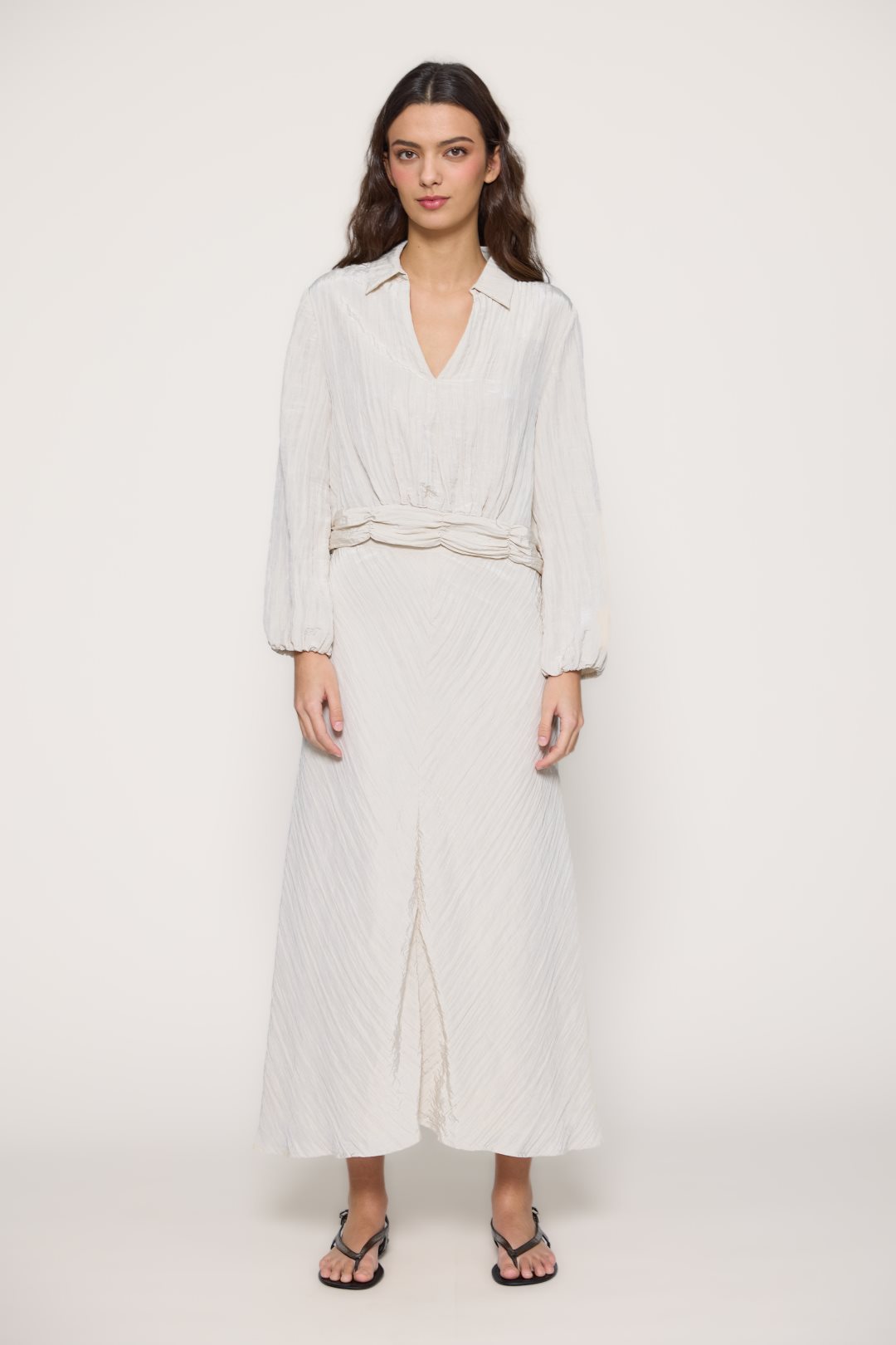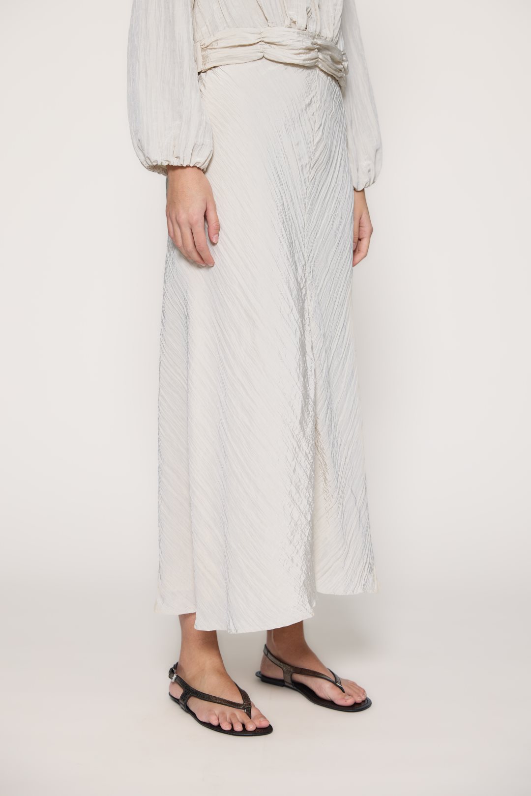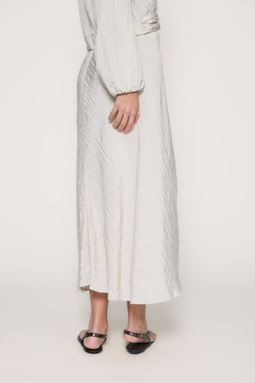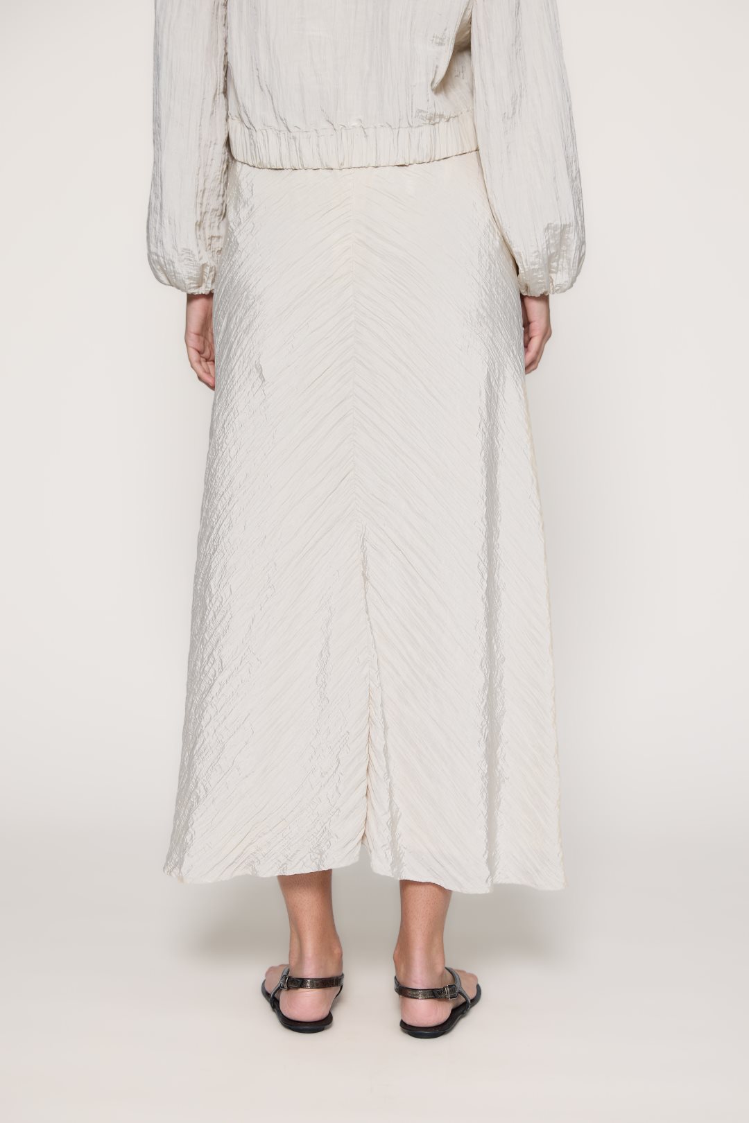 Women’s skirt from the MD’M spring-summer collection. Crafted from satin-textured fabric with a soft crinkled finish, it features a fluid silhouette and midi length that adds movement and elegance. Designed with a straight waistband and invisible side zip for a clean, feminine look. A lightweight and versatile piece, perfect to pair with seasonal blouses or tops. Available in various sizes.
