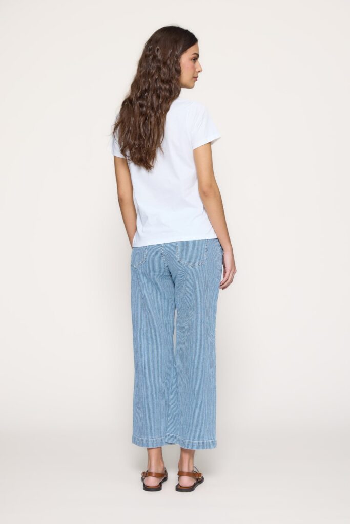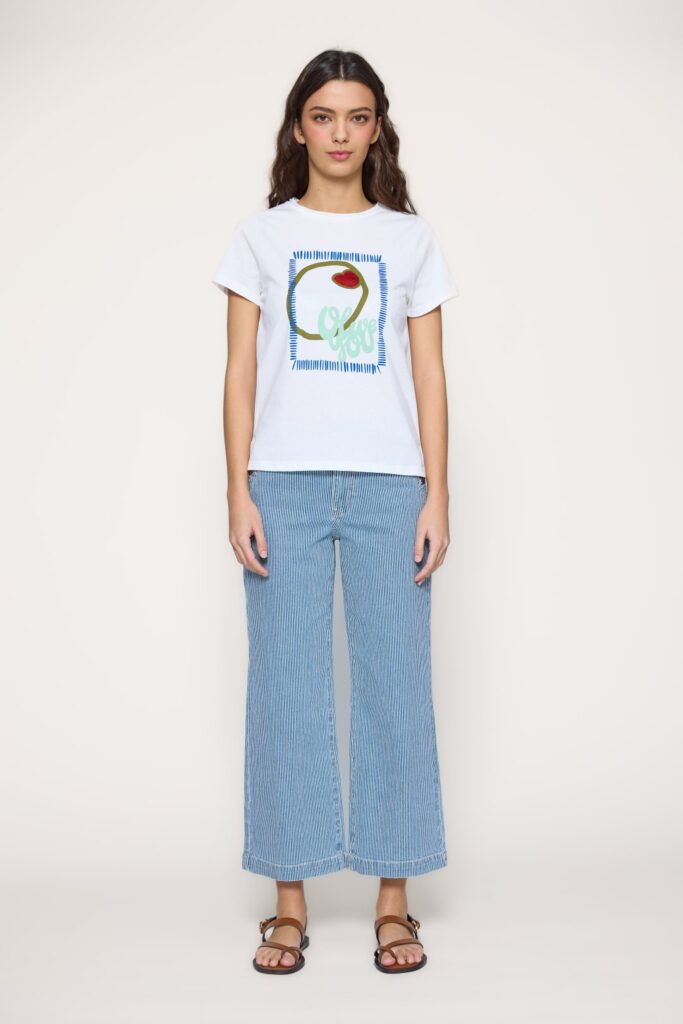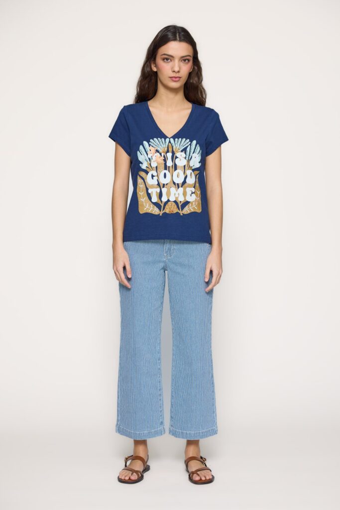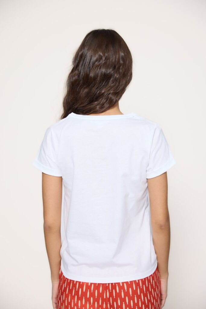 Women’s T-shirt from MD’M’s spring-summer collection. Made of soft, lightweight viscose, it features a vertical geometric print that elongates the silhouette and adds a modern, feminine style. With a V-neckline, short drop sleeves and straight fit, it combines comfort and elegance in a versatile piece perfect for everyday or summer looks. Available in several sizes.
