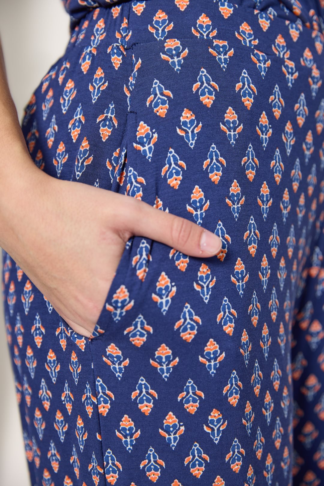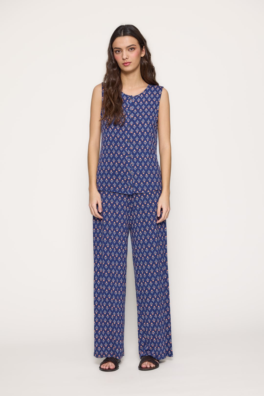 Women’s trousers from MD’M’s spring-summer collection. Made of stretch viscose knit, they feature an ethnic-inspired print that brings a bohemian, modern touch. With an elastic waistband and straight-leg cut, they offer a comfortable fit and fluid drape, perfect for warm summer days. The lightweight, soft fabric ensures comfort and style. Ideal to pair with the matching printed T-shirt or plain pieces from the collection. Available in several sizes.
