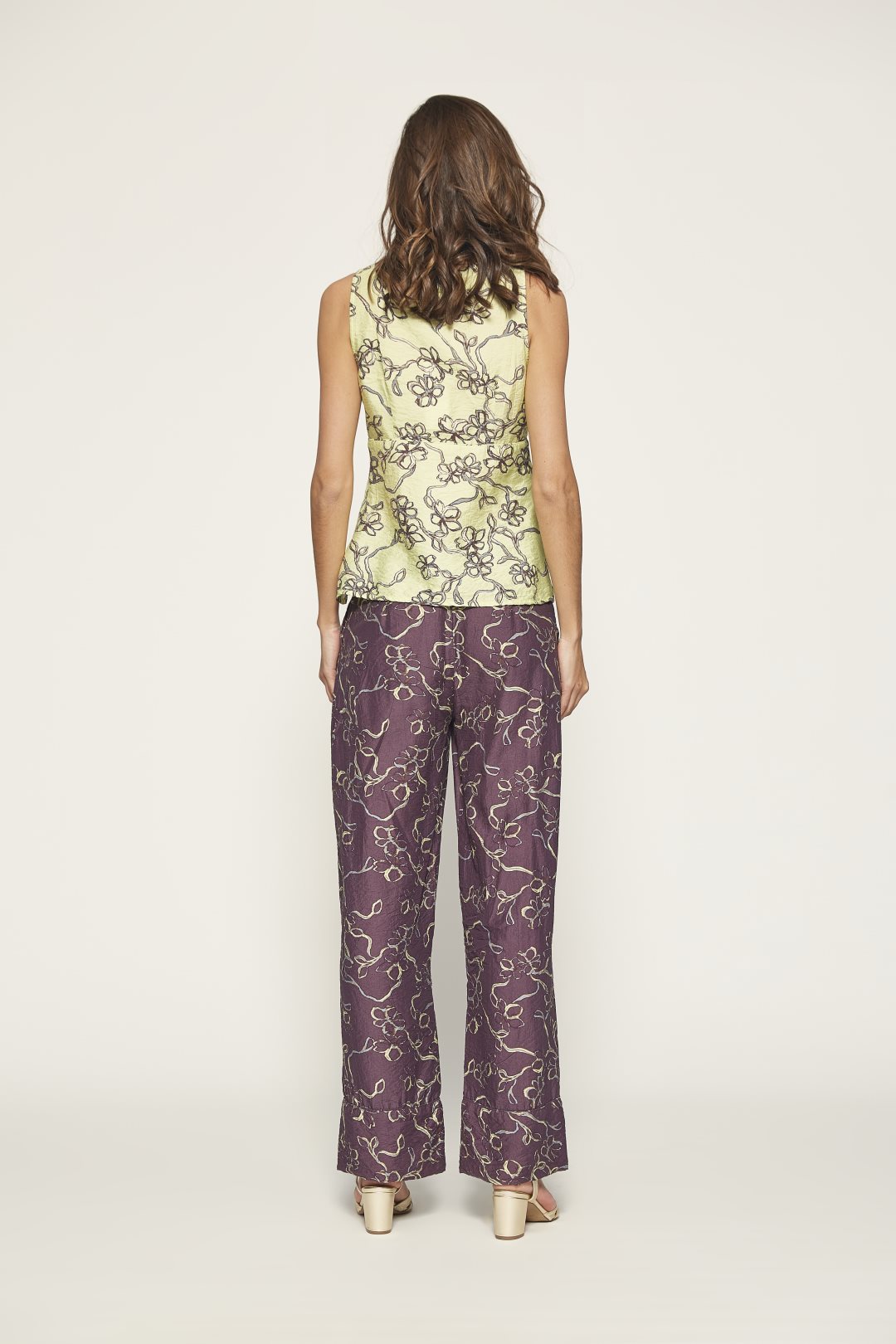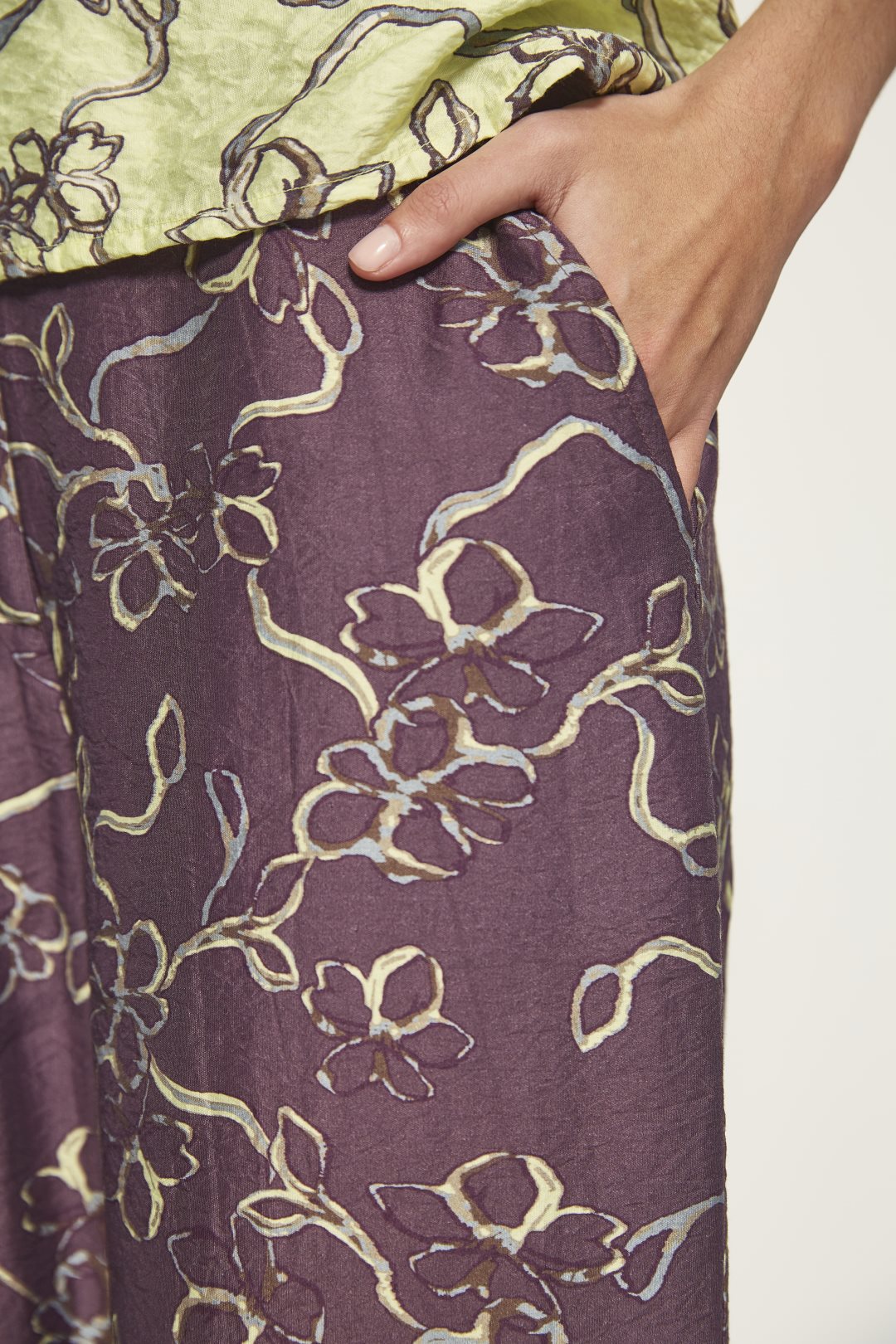 Aubergine Straight-leg viscose trousers with a delicate floral print and crinkled-effect fabric. Side pockets and front button closure. Part of the MD’M STUDIO guest collection.