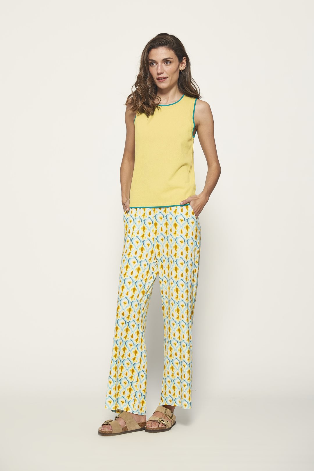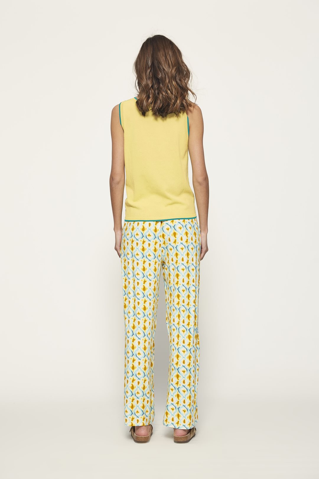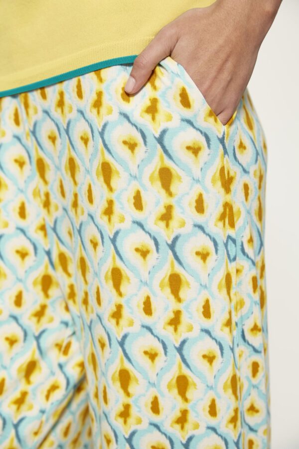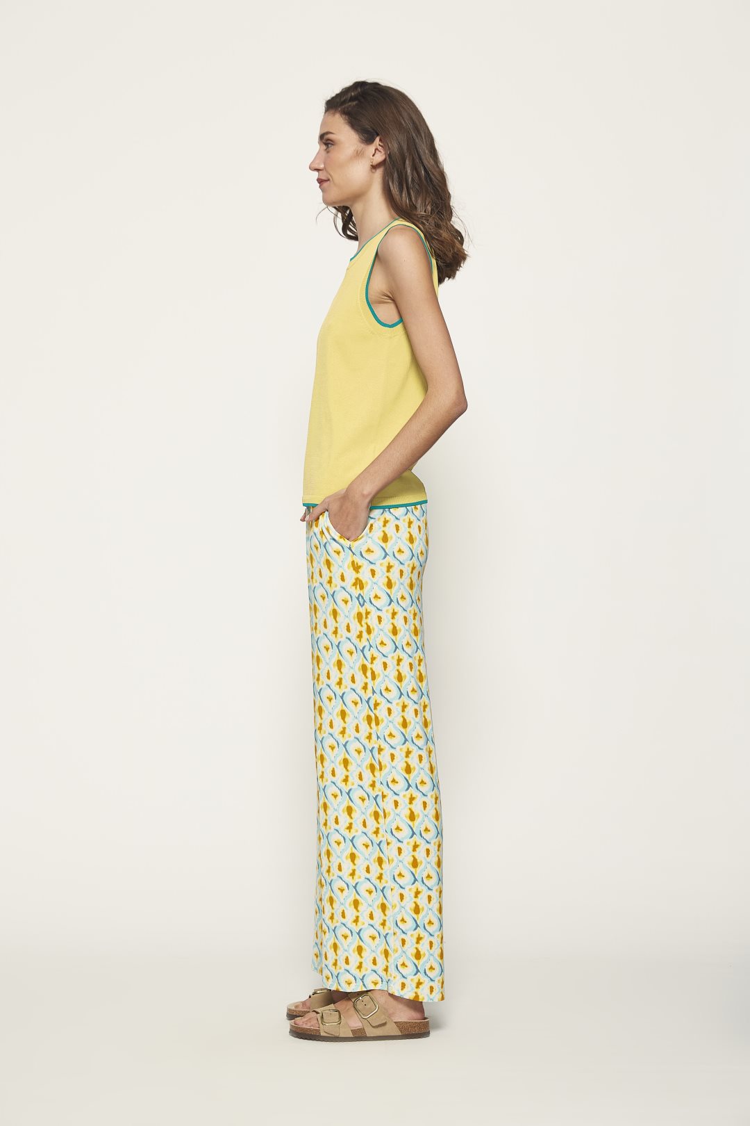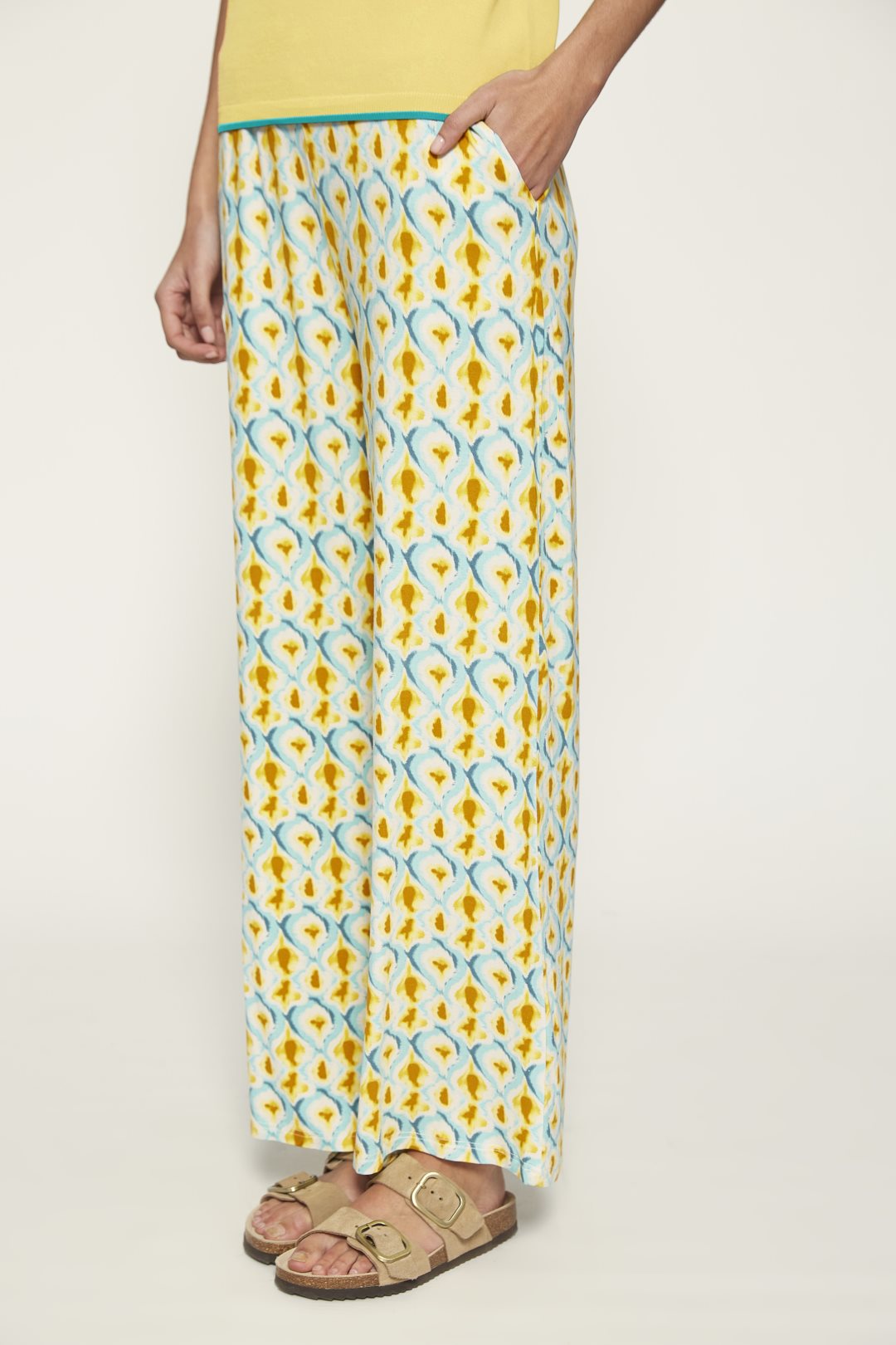Blue Viscose knit trousers with multicoloured ikat print. With elasticated waist for greater comfort.
