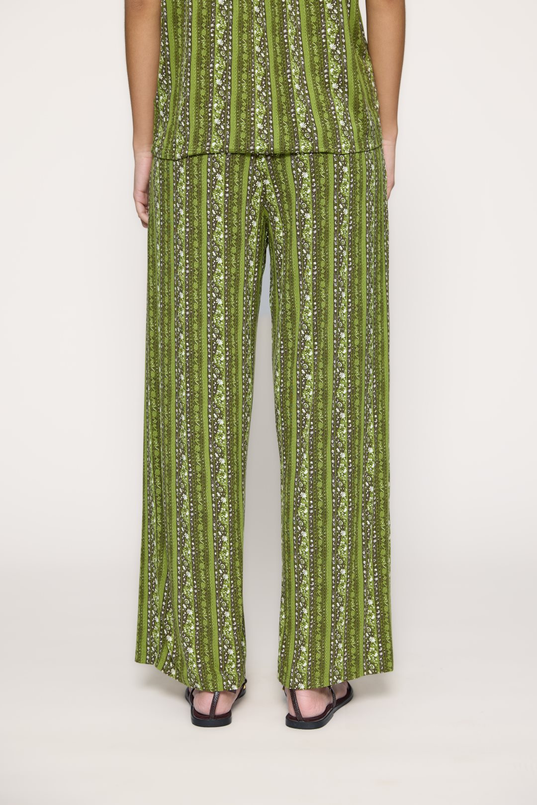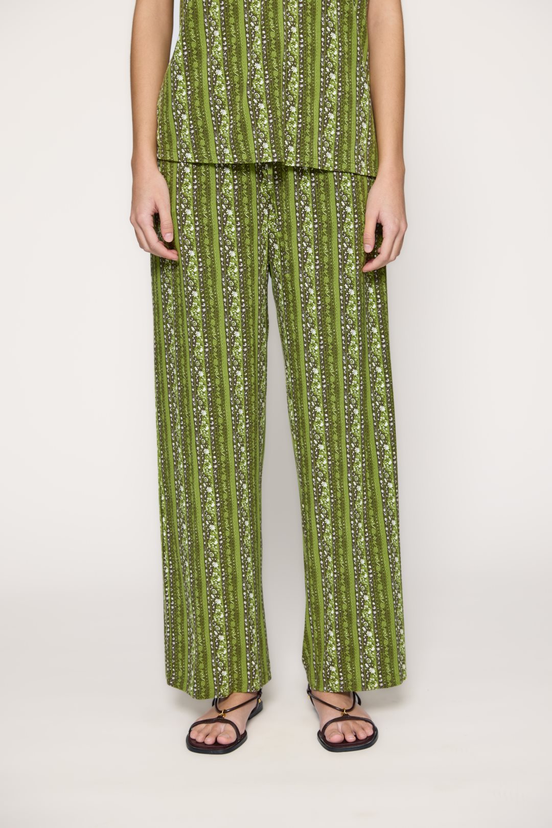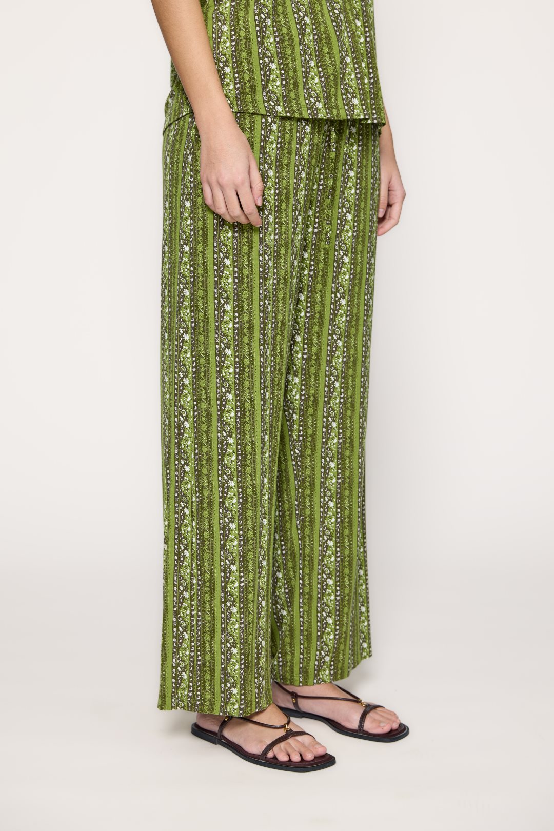 Khaki Viscose knit trousers with geometric print and elastic waistband with adjustable drawstring. Straight and flowy fit.
