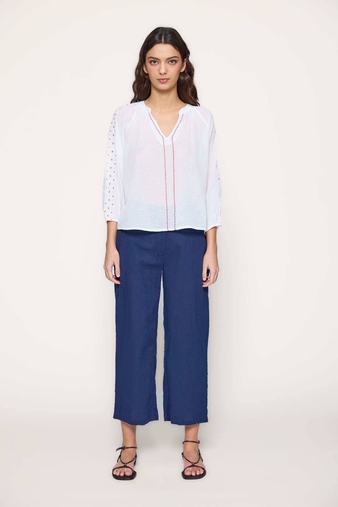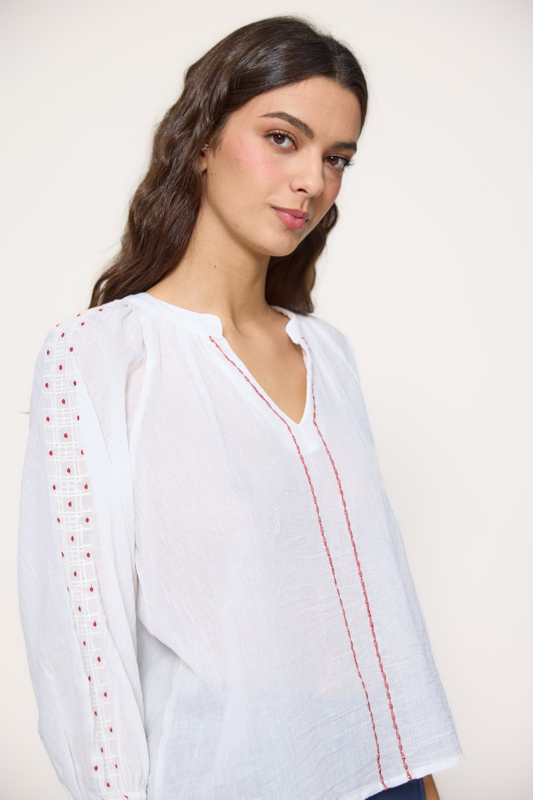 Blusa para mujer de la colección primavera-verano de MD’M. Confeccionada en 100 % algodón ligero y natural, presenta un diseño con pespuntes decorativos en contraste y bordados delicados en las mangas. Su escote de pico y la manga francesa aportan un toque artesanal y femenino. Una prenda cómoda y fresca, perfecta para el día a día o para combinar con faldas y pantalones de estilo boho. Disponible en varias tallas.