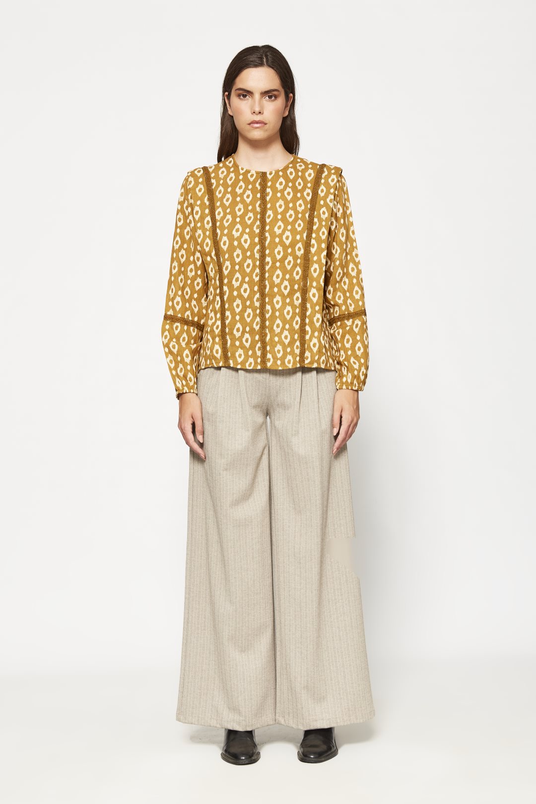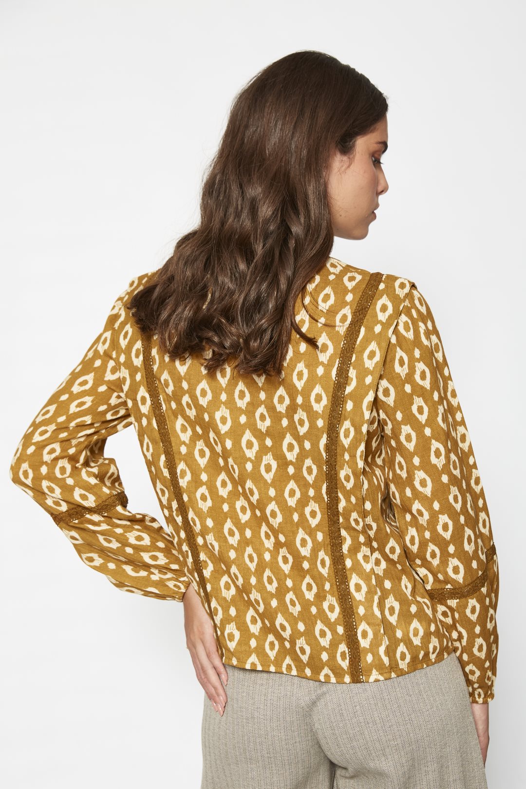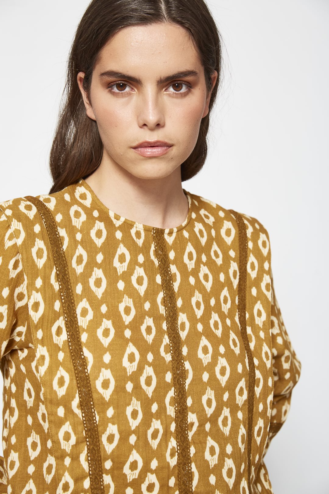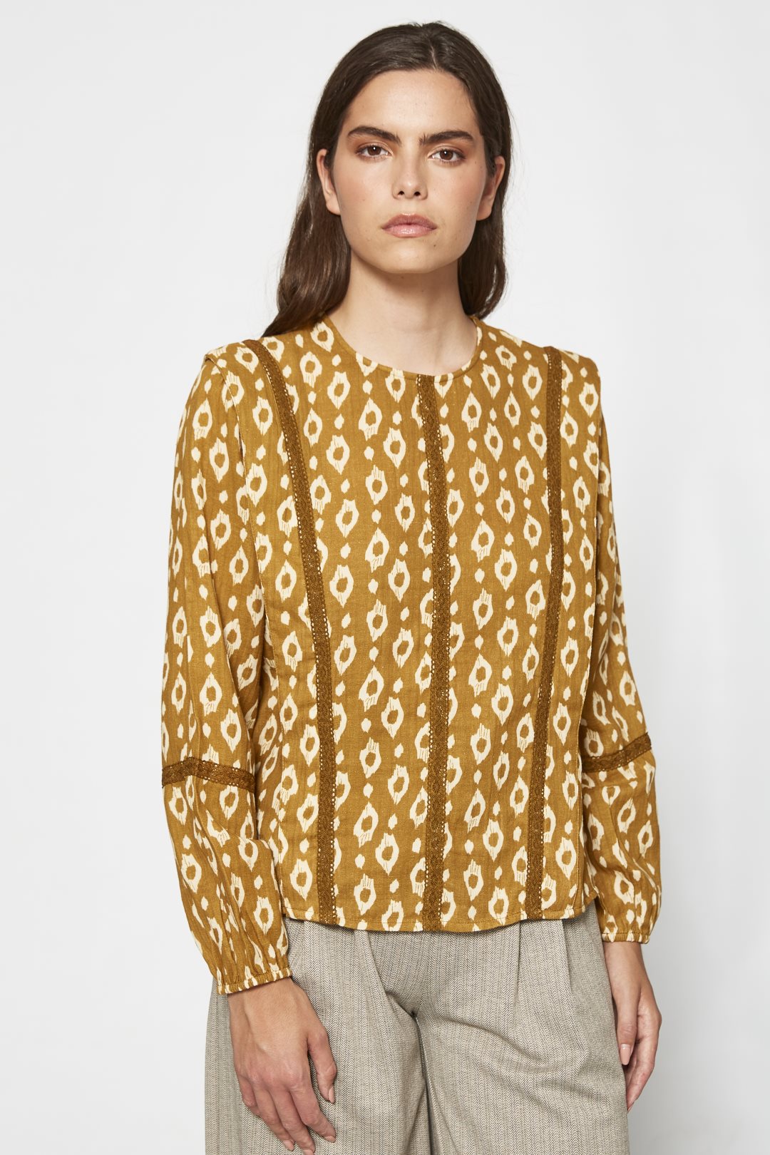 Blusa de manga larga 100% algodón con detalles de costuras y estampado tipo ikat. Cuello redondo. Color marrón