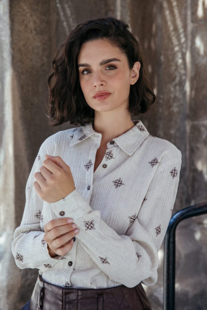 Blusa para mujer de la colección otoño-invierno de MD’M. Confeccionada en 100% algodón, presenta un diseño con estampado tipo ikat y detalles de costuras que aportan textura y definición. Cuello redondo clásico para un acabado limpio y versátil. Prenda cómoda y fácil de combinar para looks diarios. Disponible en varias tallas.