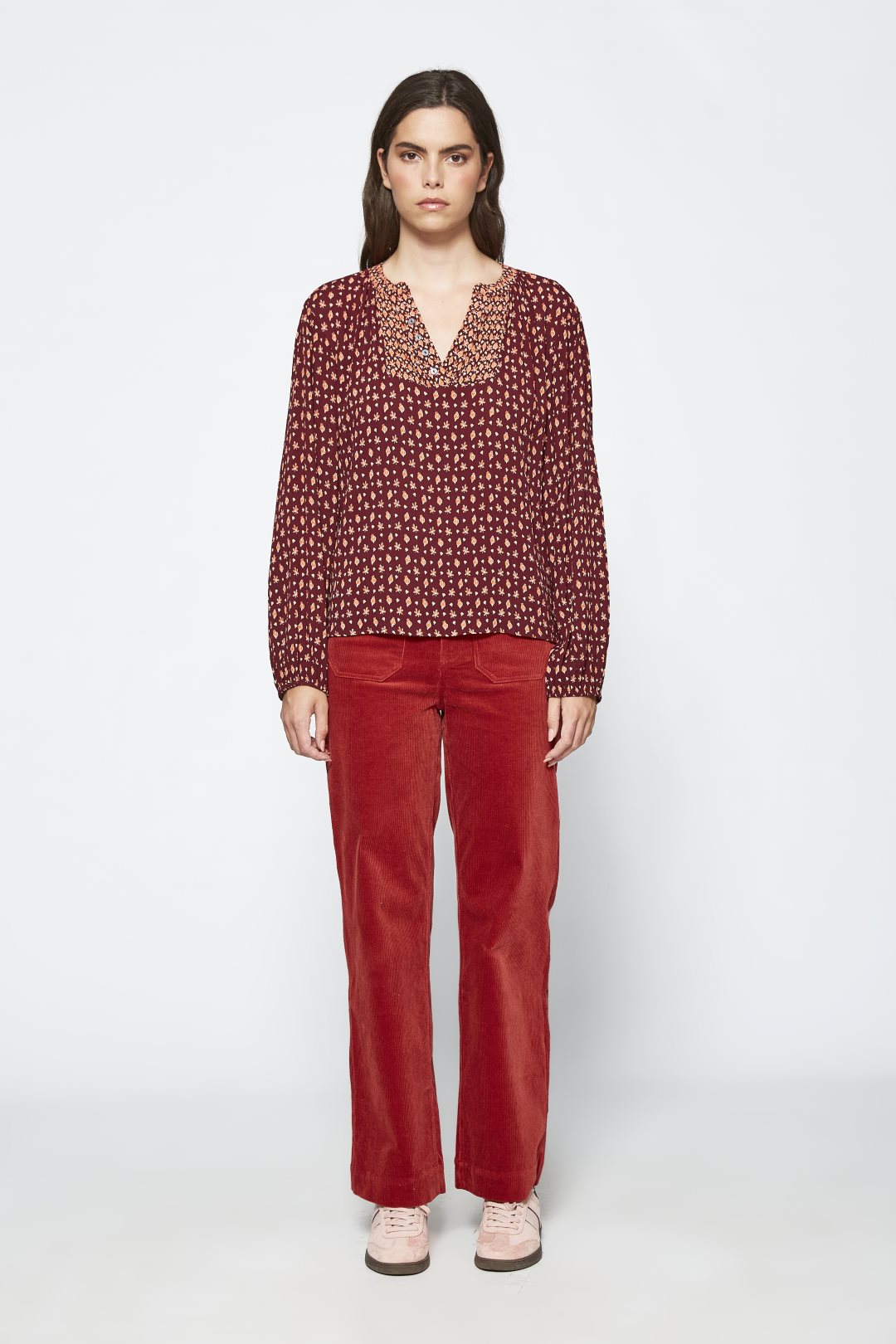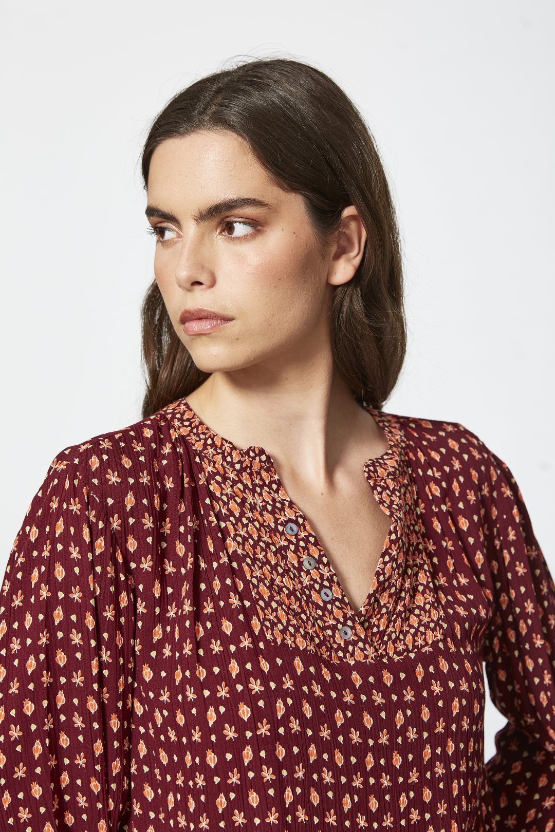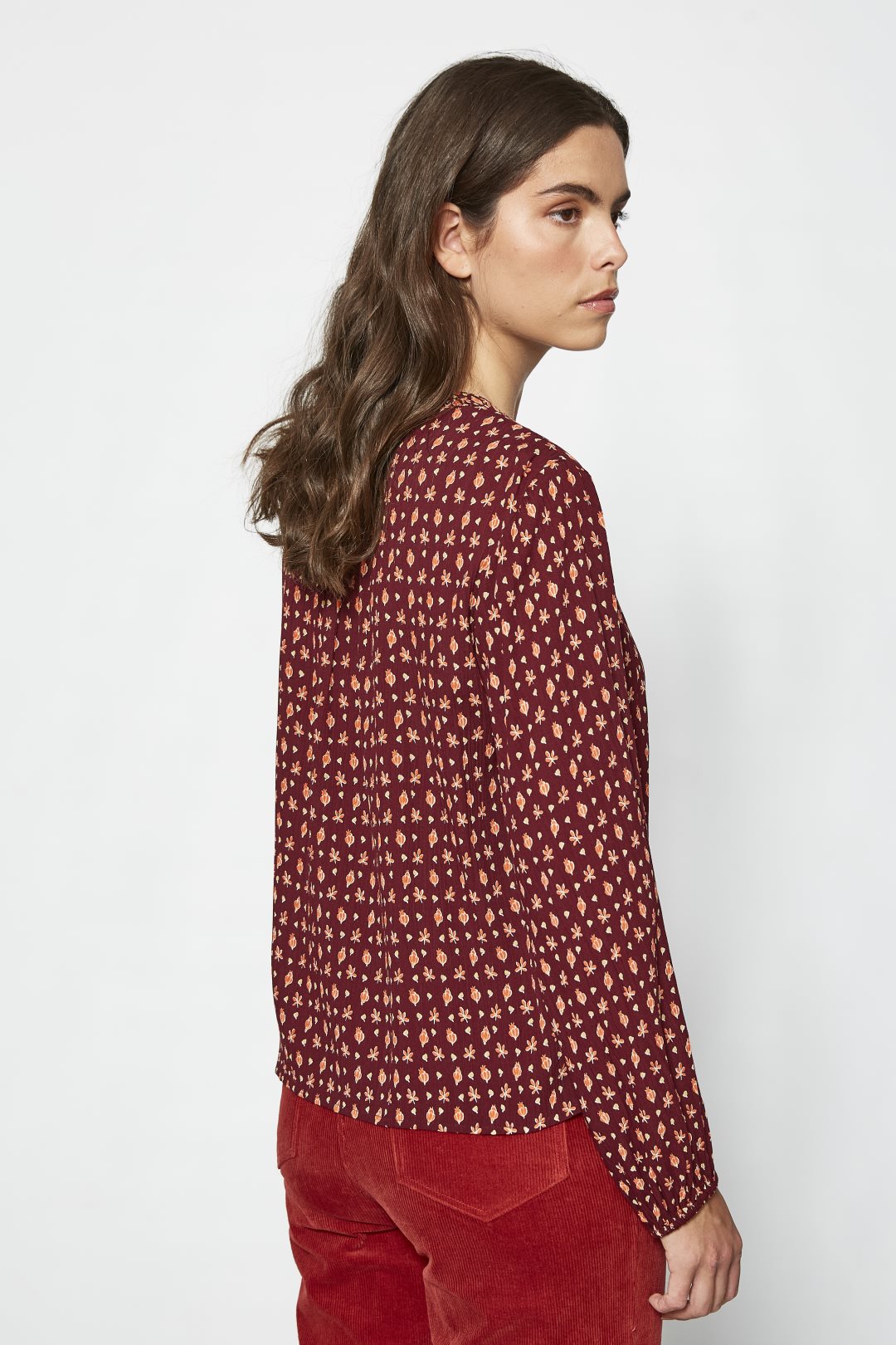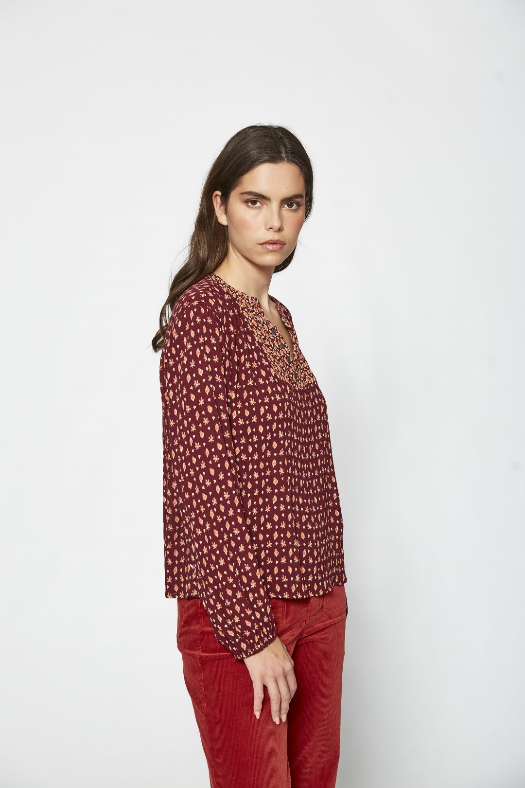 Blusa 100% viscosa con cuello pico, manga larga abullonada, estampado liberty y frunce en el pecho. Color marrón