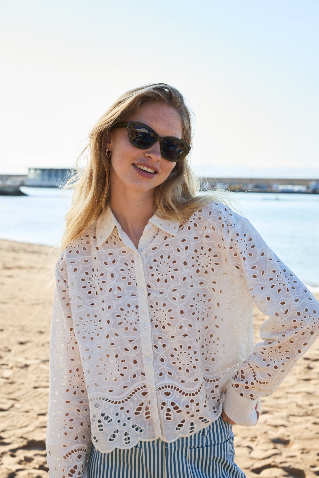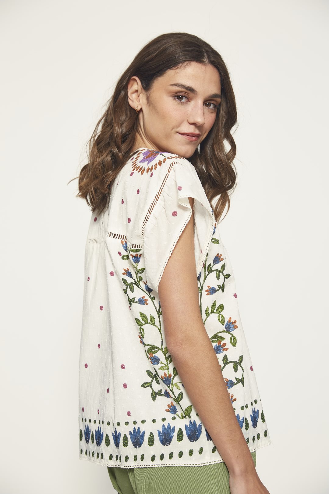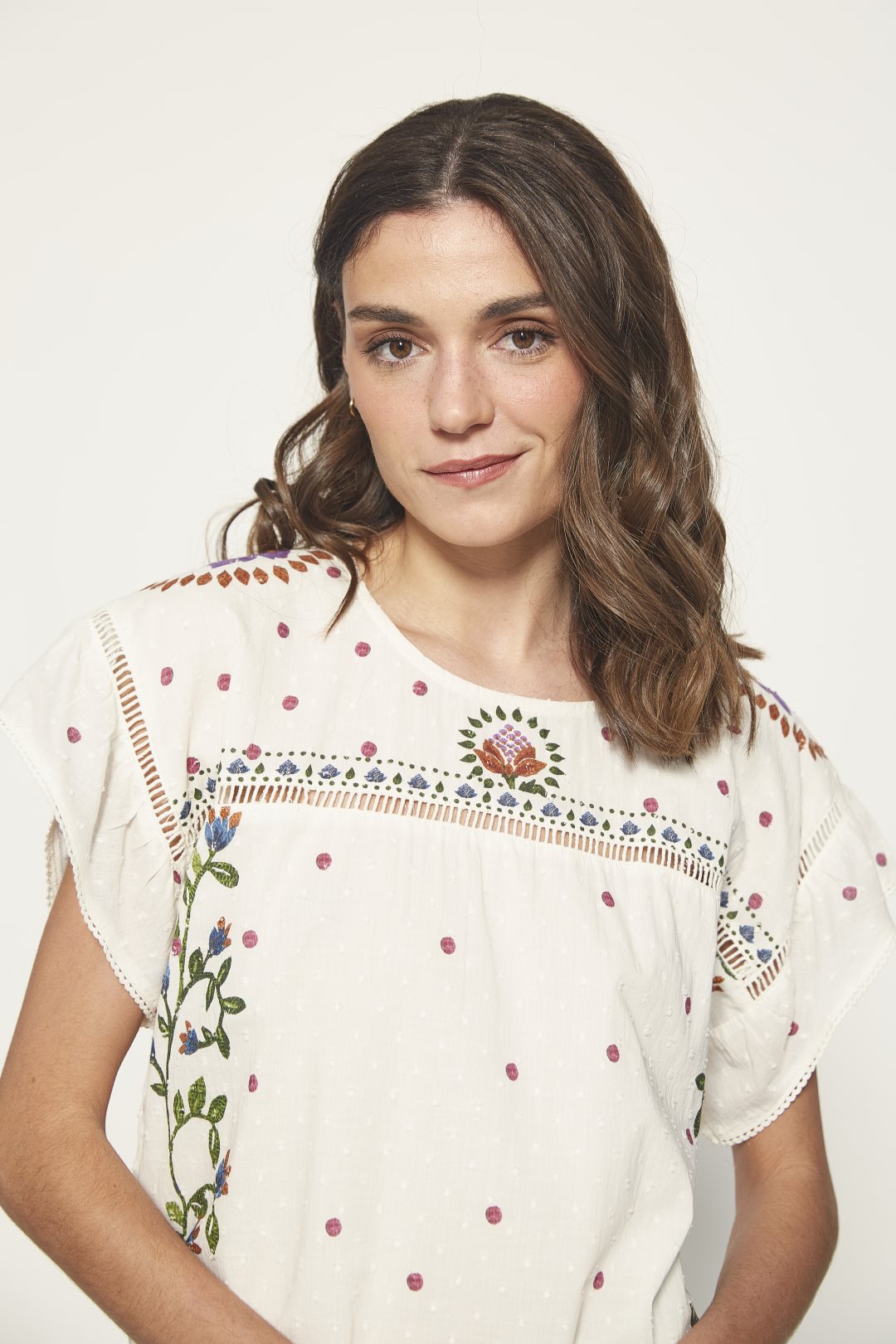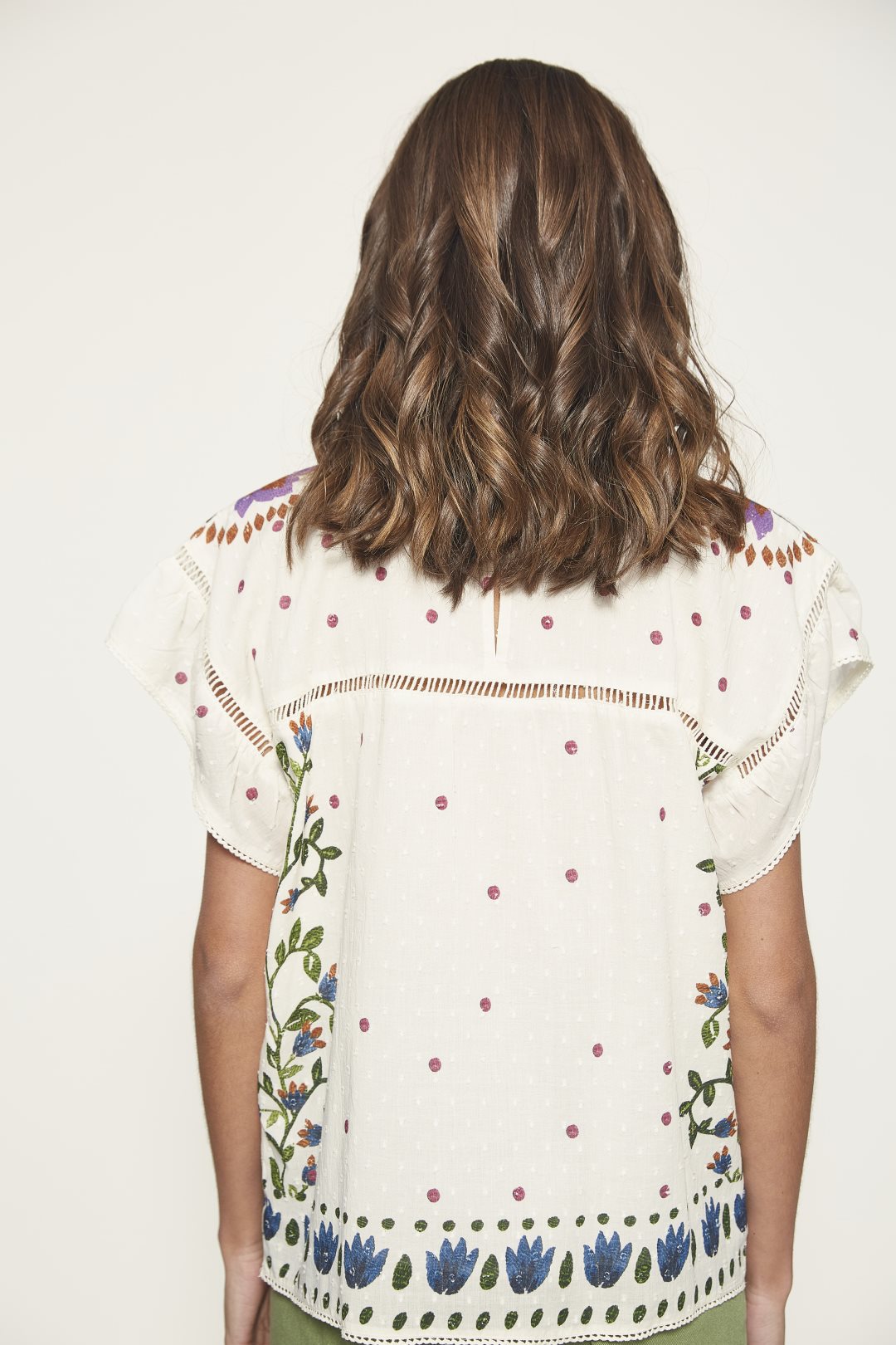 Blusa confeccionada en 100% algodón, con manga caída, detalle de print posicional efecto bordado y encaje. Color blanco