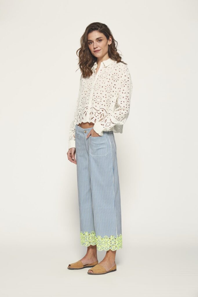 Esta blusa de manga corta está confeccionada en 100% algodón, un material natural y transpirable perfecto para la temporada primavera-verano. Su diseño cuenta con un delicado falso bordado que añade un toque de sofisticación sin perder la frescura. El cuello redondo aporta un estilo clásico y cómodo, ideal para combinar con jeans, faldas o pantalones cortos. Una prenda versátil que te acompañará en tus días más cálidos, manteniéndote fresca y estilosa.