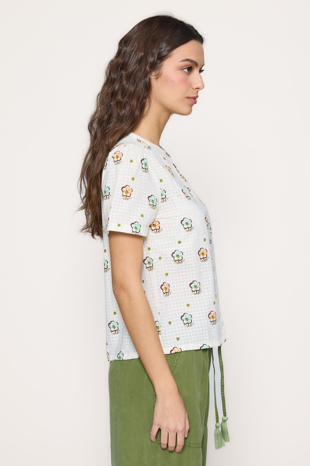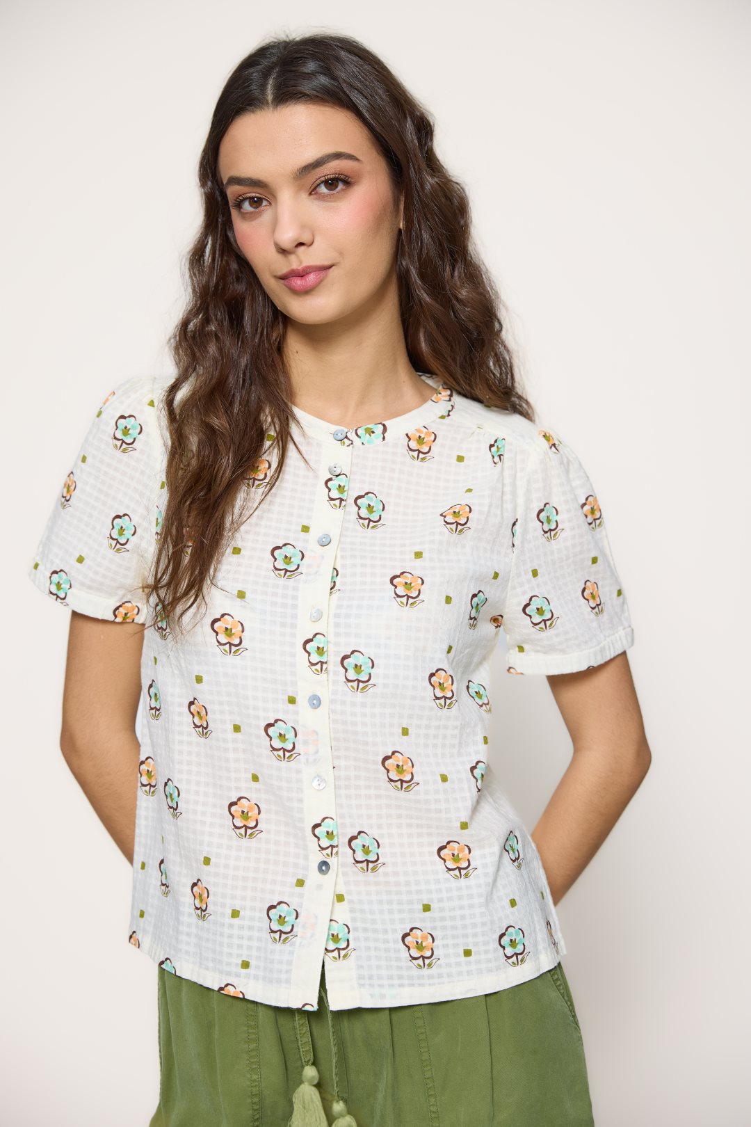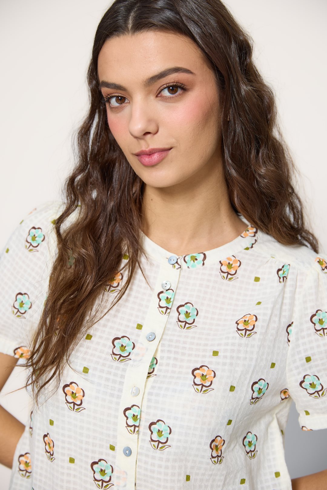 Camisa 100 % algodón con estampado de flores camomila. Cuello redondo, manga corta y cierre frontal con botones. Color blanco