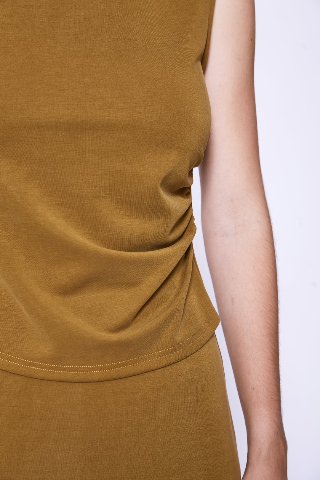 Top sin mangas con cuello redondo y detalle de drapeado en la cintura y en el hombro. Color marrón