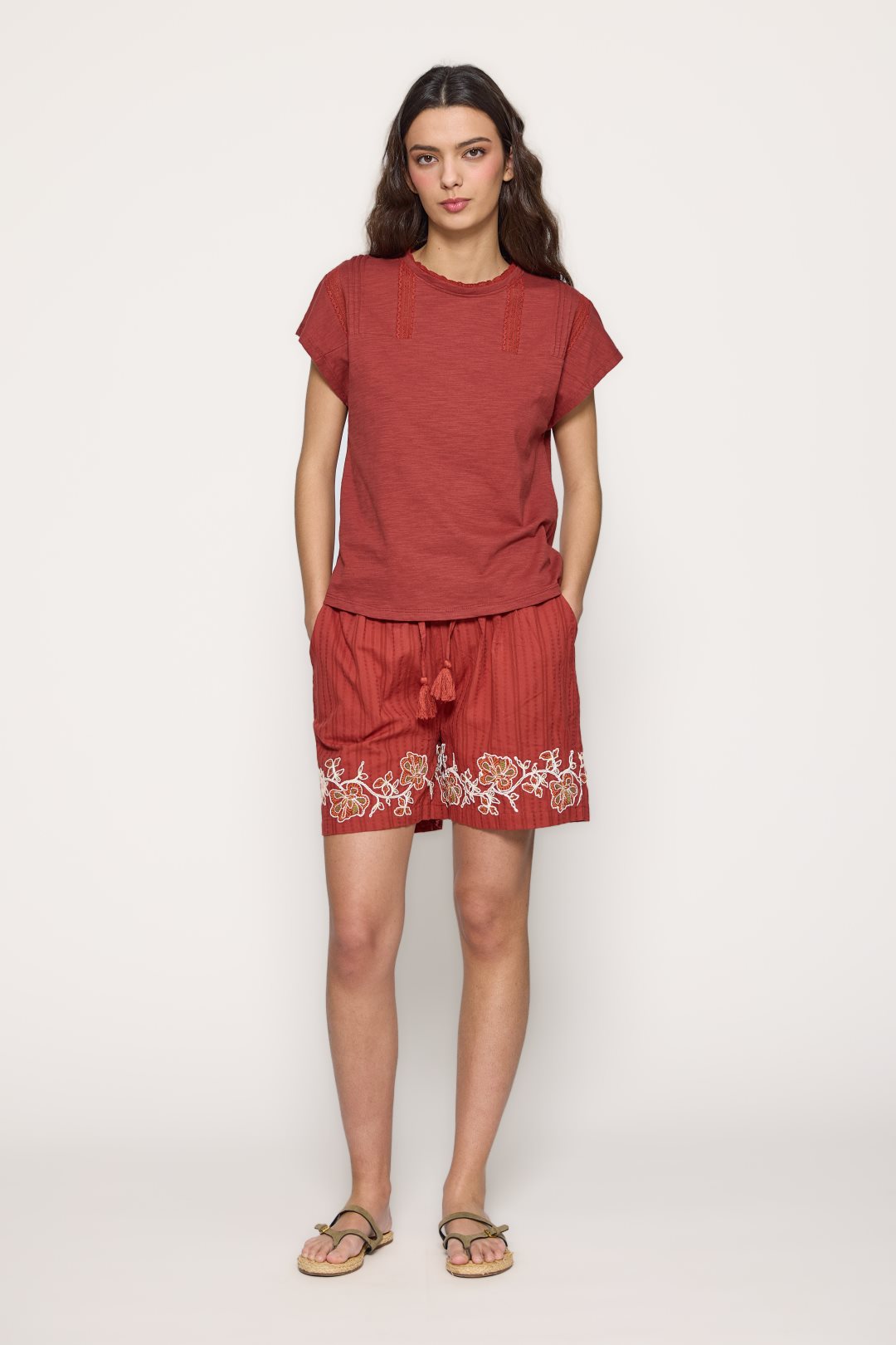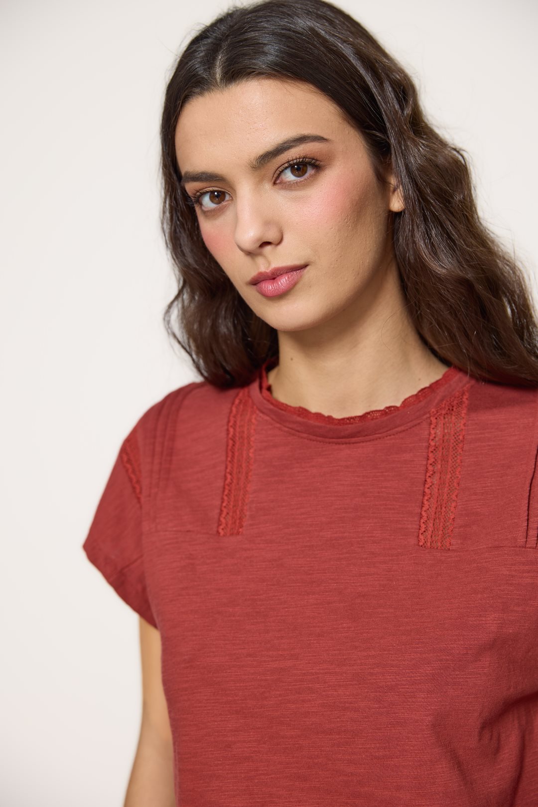 Camiseta 100 % algodón con detalle de encaje en los hombros y cuello redondo con frunce. Manga corta caída y corte recto. Color marrón