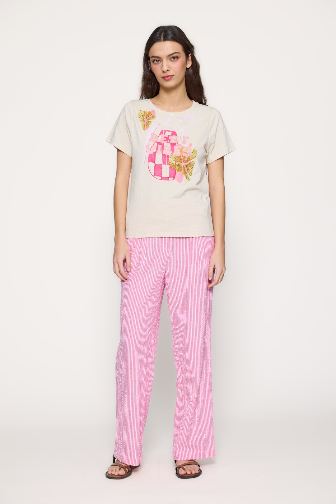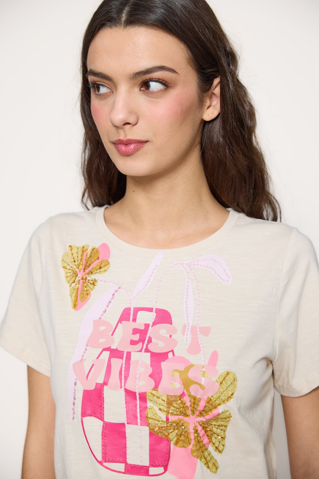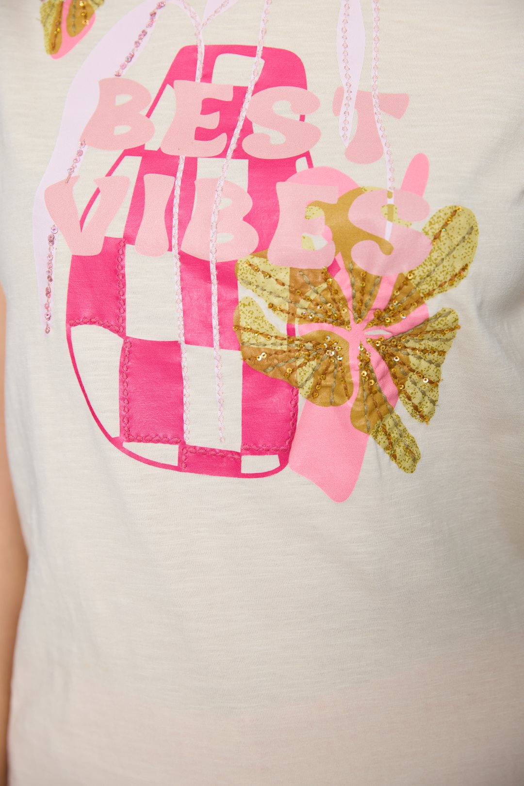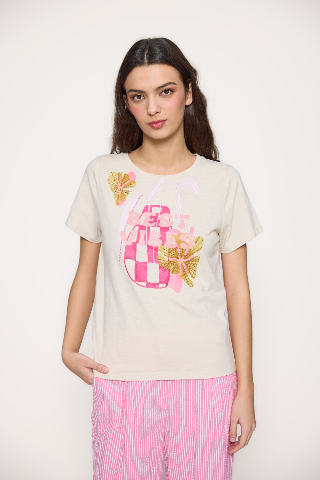 Camiseta para mujer de la colección primavera-verano de MD’M. Confeccionada en 100 % algodón, presenta un alegre estampado frontal con el mensaje “Best Vibes” acompañado de motivos tropicales y bordados con lentejuelas que aportan brillo y textura. De cuello redondo y manga corta, es una prenda ligera y cómoda que transmite energía positiva y estilo. Perfecta para crear looks casuales y veraniegos llenos de color. Disponible en varias tallas.