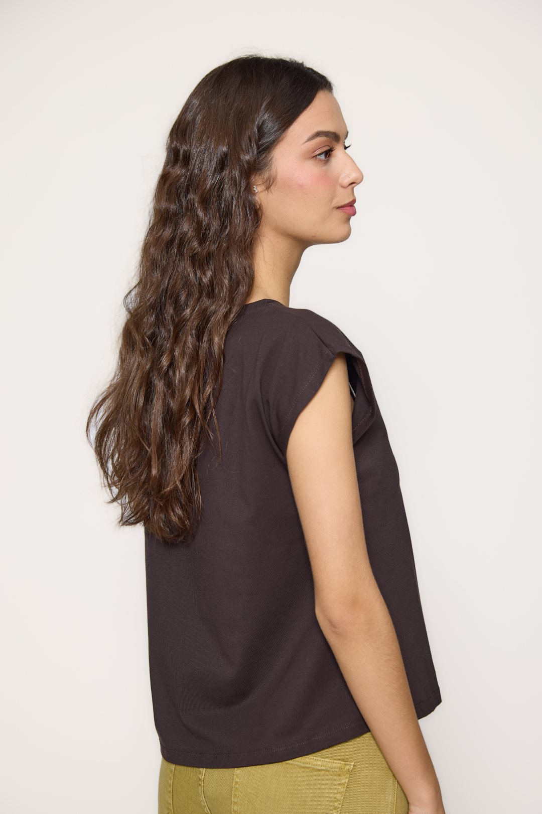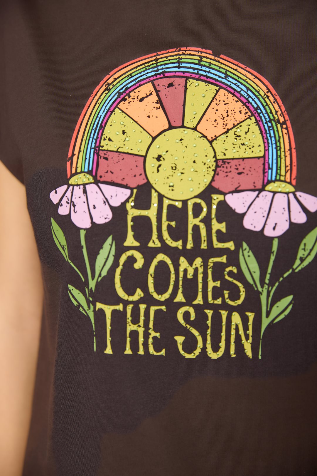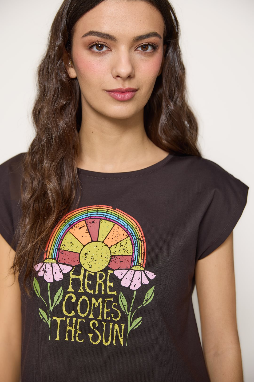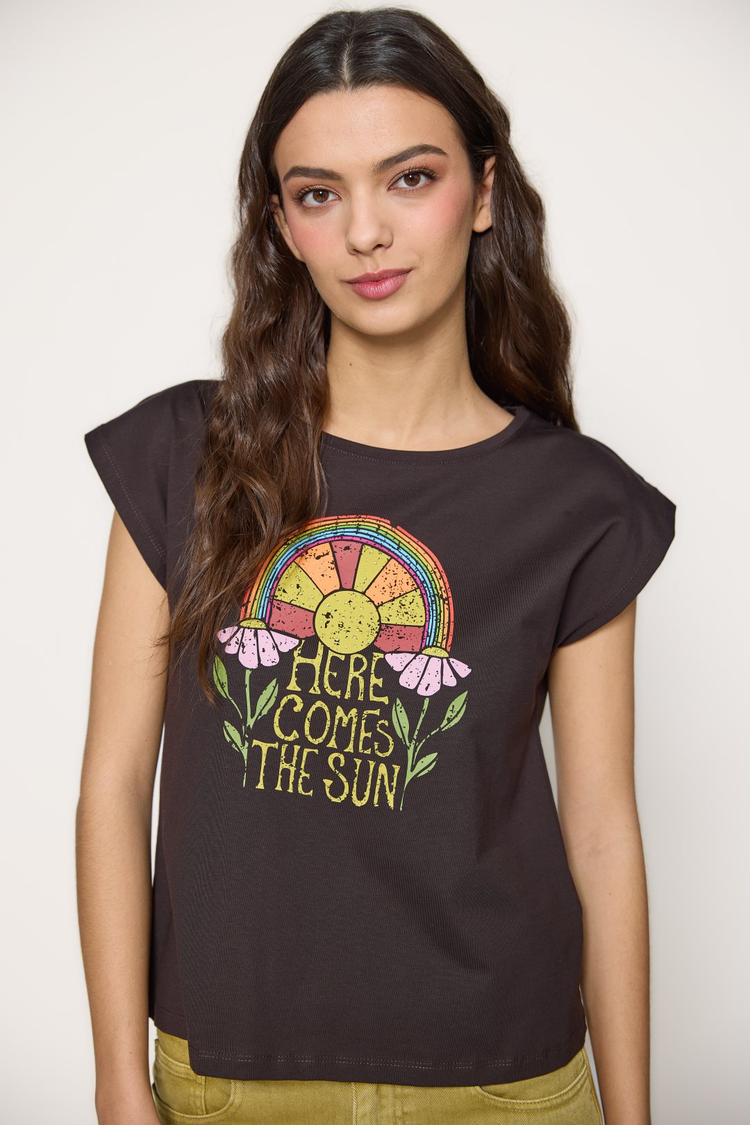 Camiseta de algodón con estampado frontal “Here Comes The Sun”. Diseño de inspiración retro con sol, arcoíris y flores. Cuello redondo y manga corta amplia. Color marrón