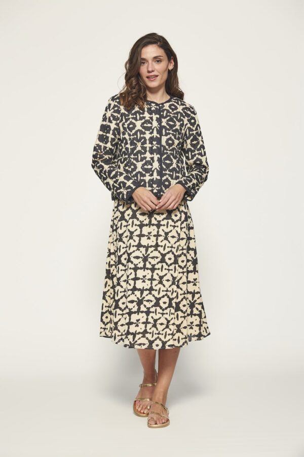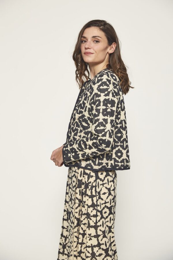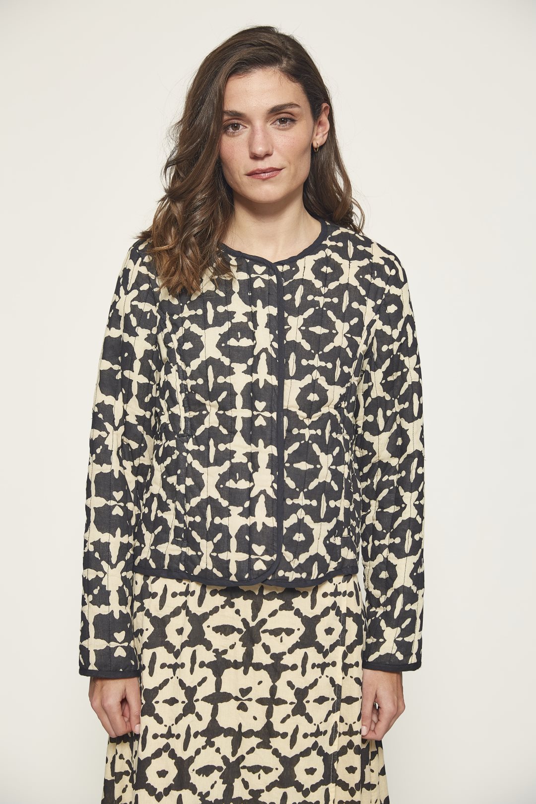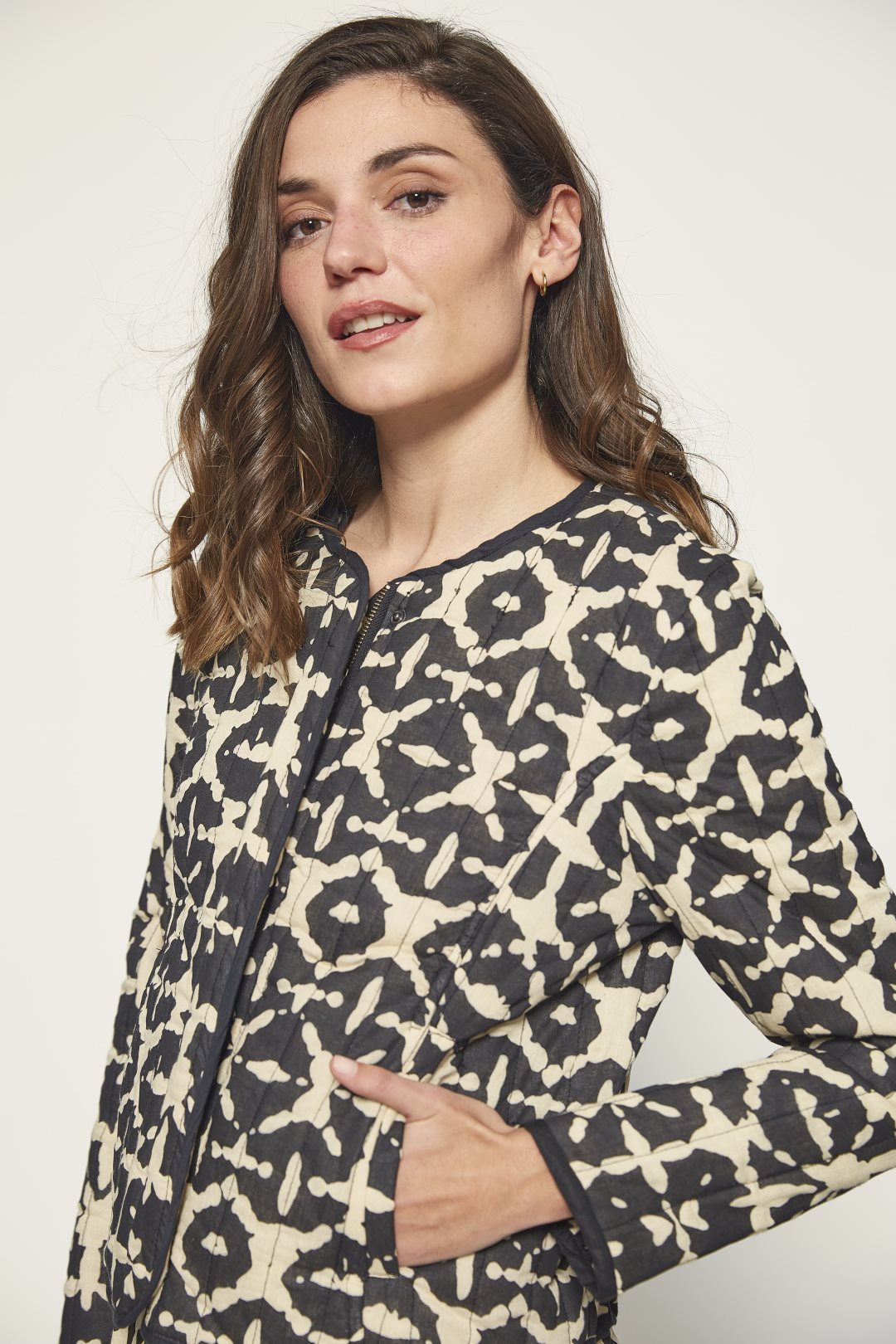 Chaqueta acolchada 100% algodón con estampado de ikat bicolor y cierre central con cremallera oculta y tapeta. Color negro