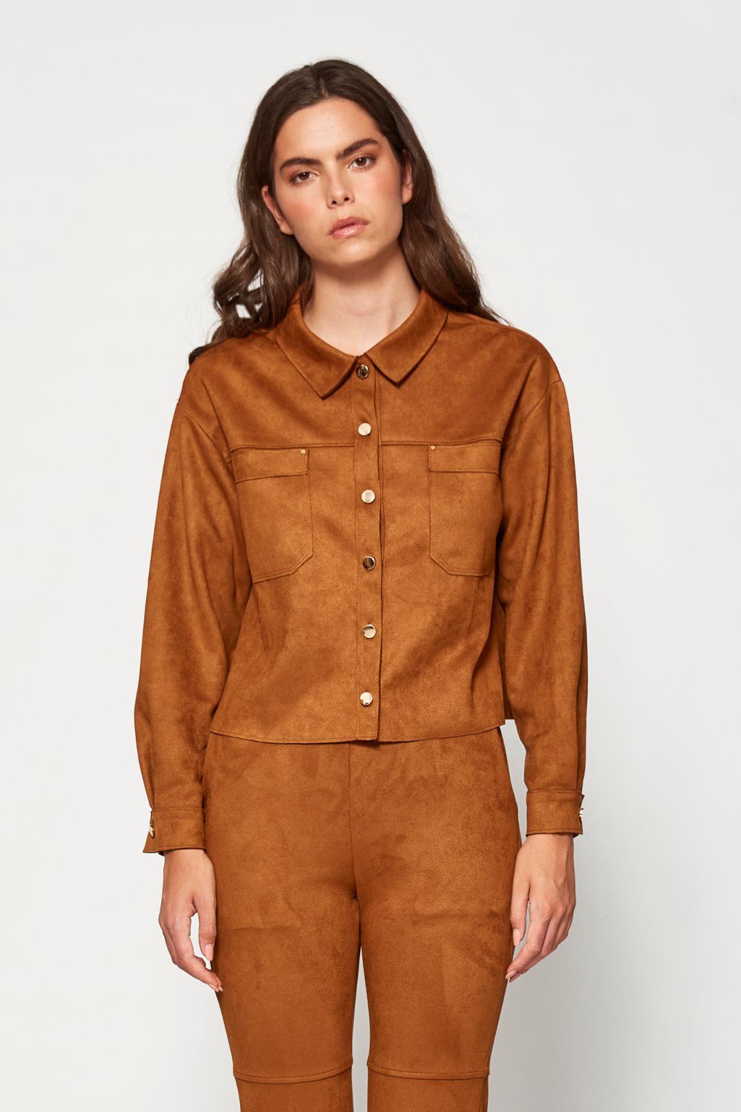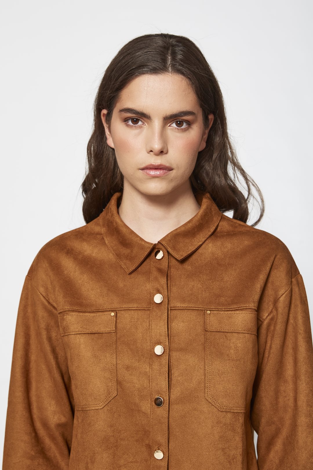 Sobrecamisa cropped de corte recto y holgado en tejido suave de antelina, cuello de solapa, cierre frontal con botones y bolsillos de parche con solapa. Color marrón