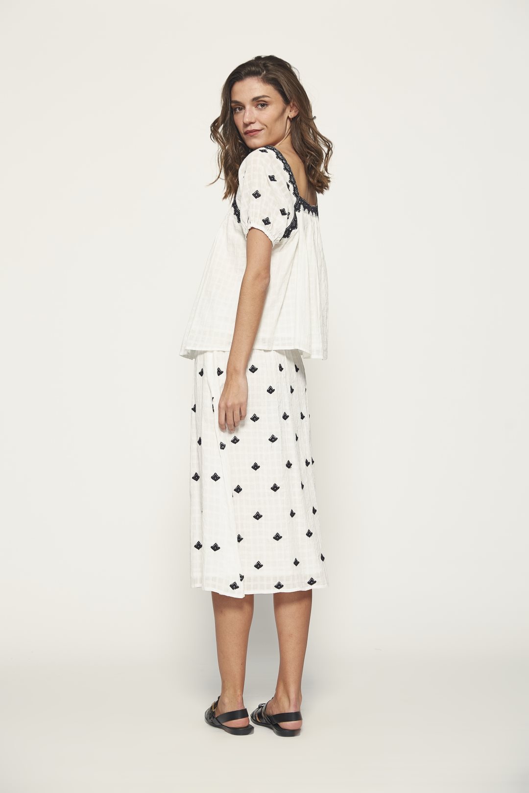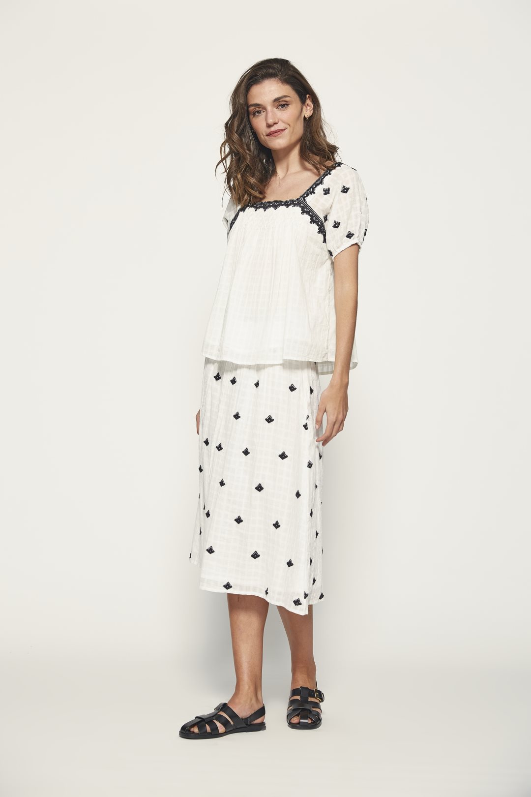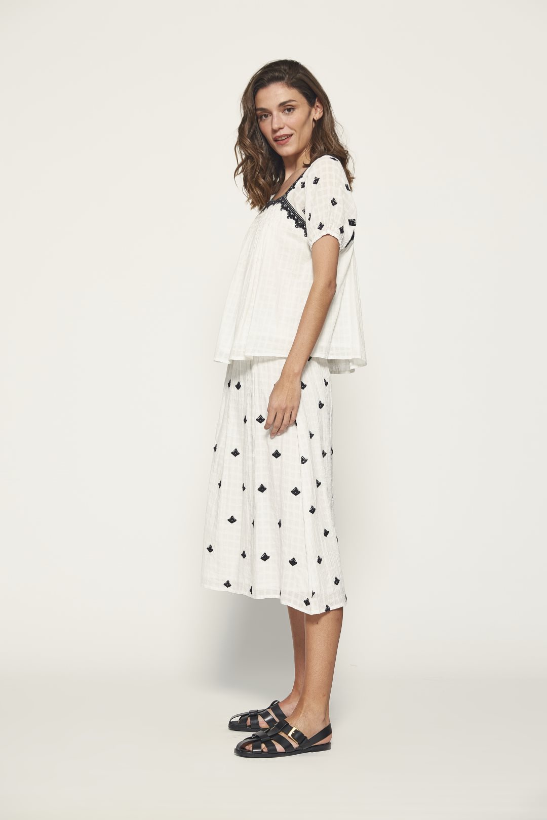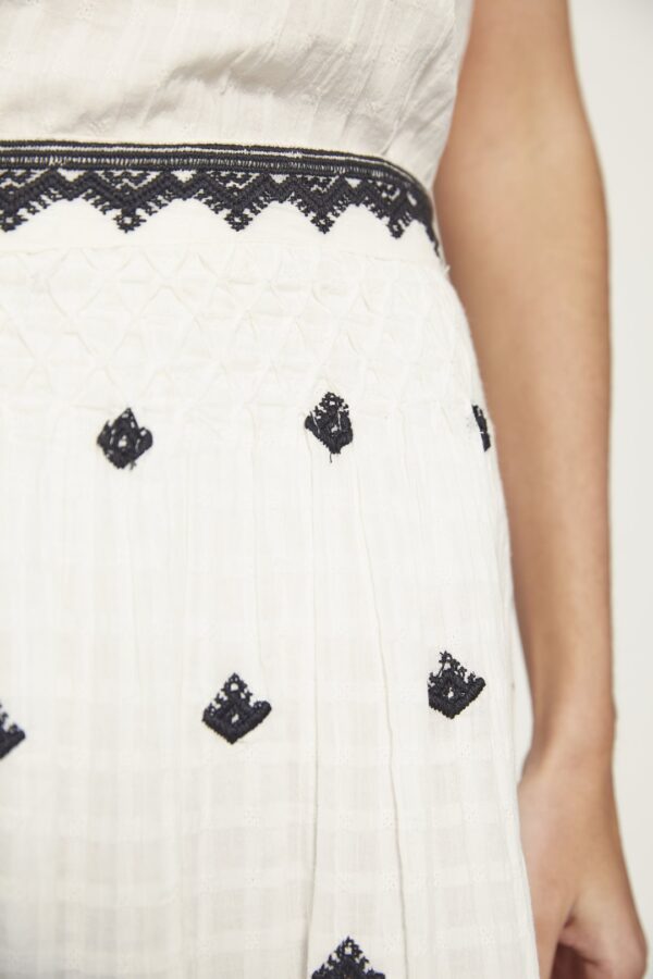 Falda midi en 100% algodón, con bordados delicados a contraste, nido de abeja artesanal y tejido con textura de cuadros. Cierre con cremallera lateral. Color crudo