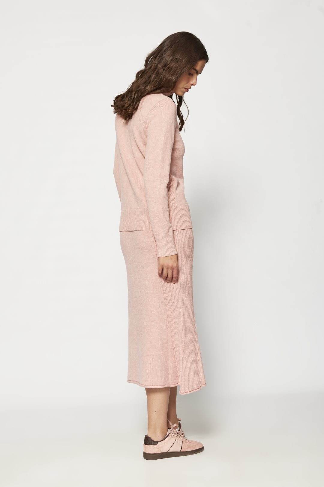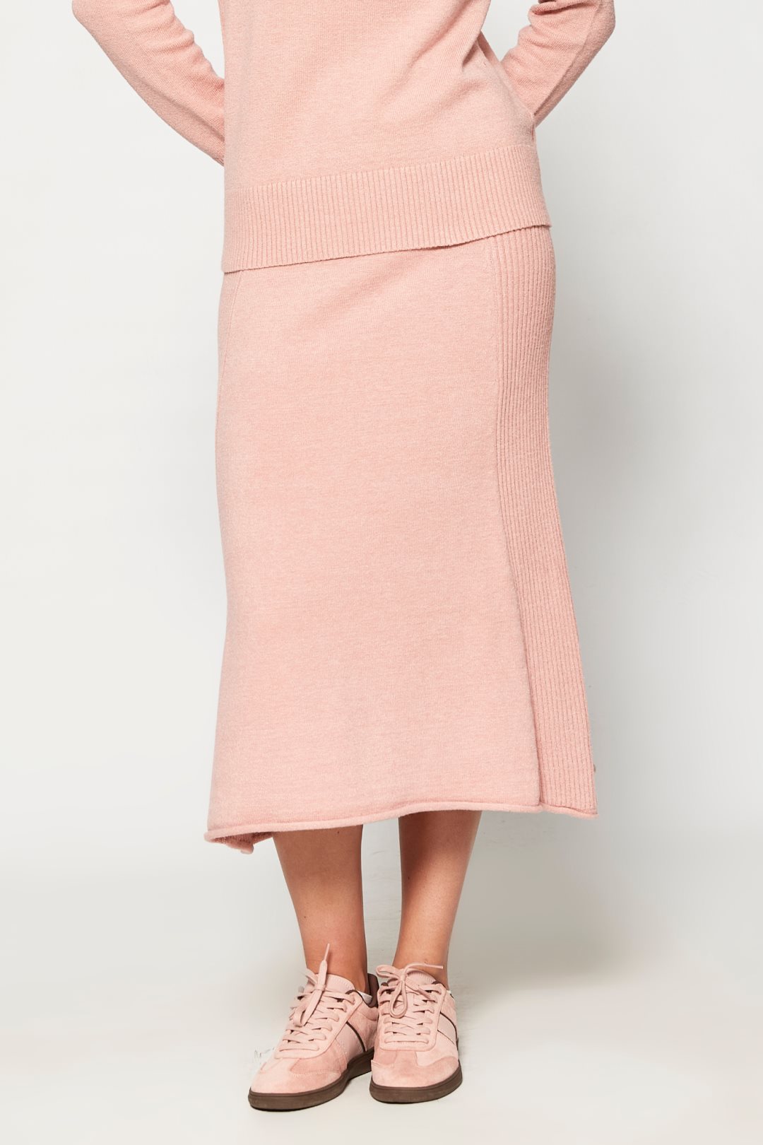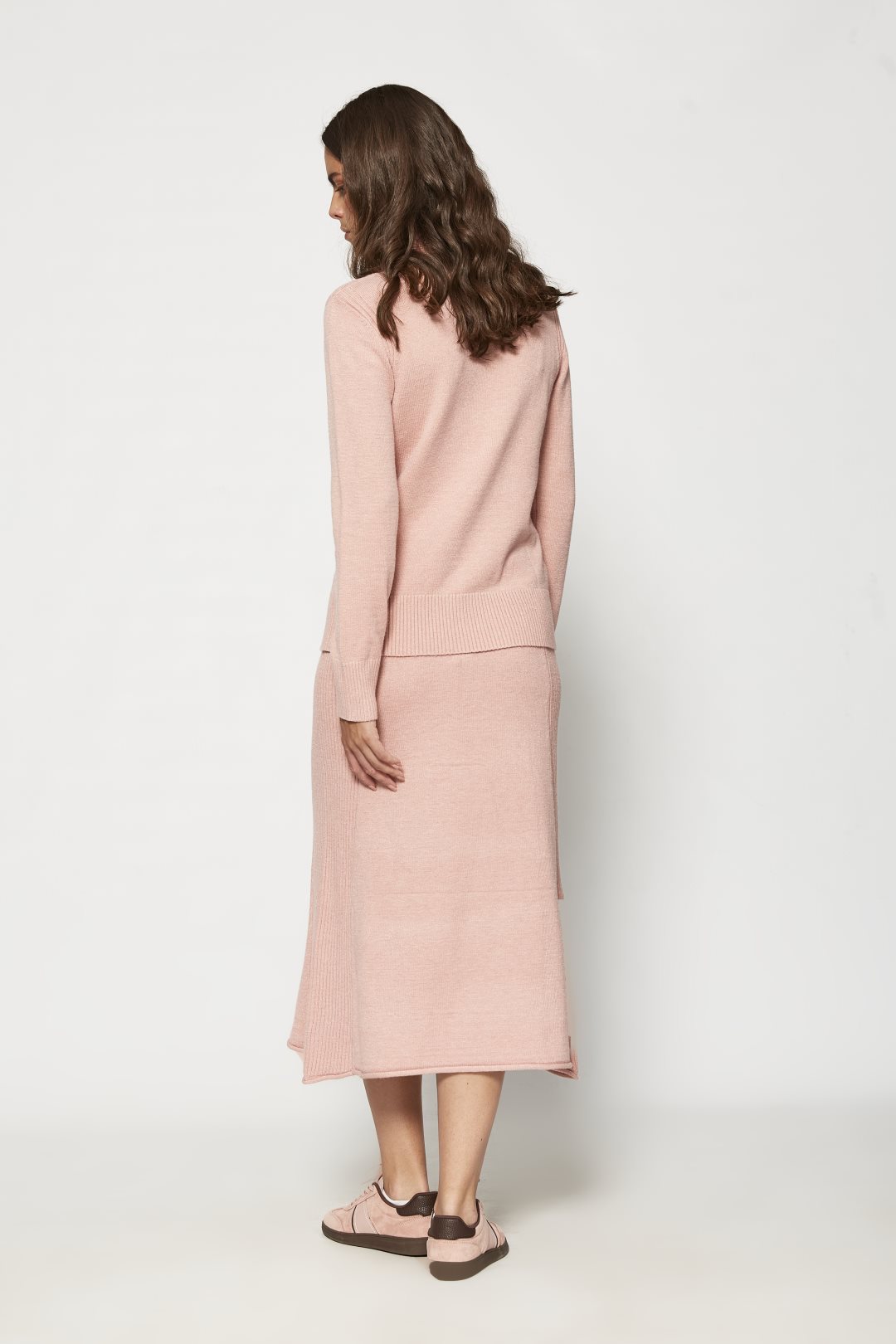 Falda de corte recto y longitud midi con cintura elástica. Confeccionada en tejido liso de efecto melange. Bajo recto con acabado limpio, sin costura visible. Silueta recta y fluida. Color rosa