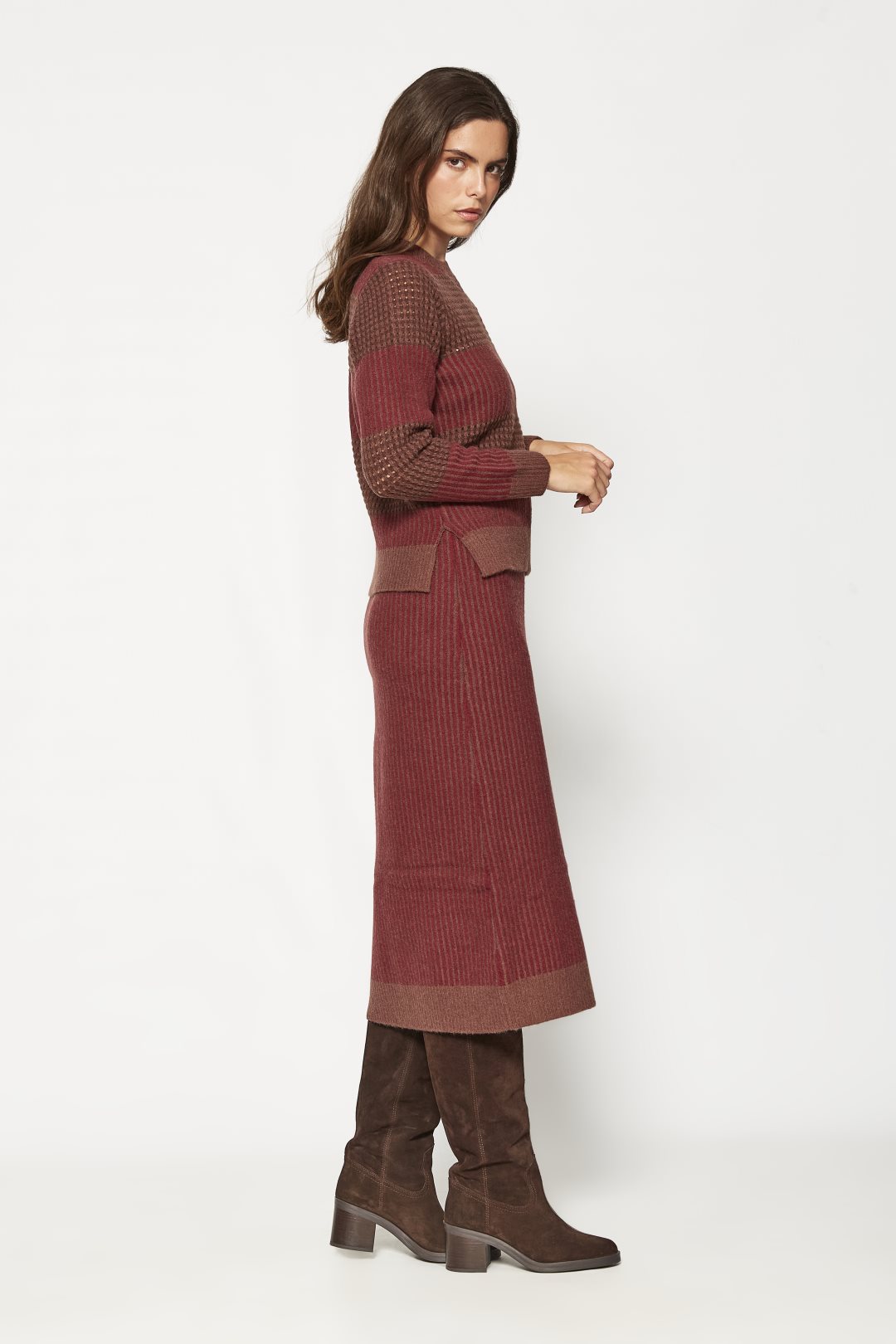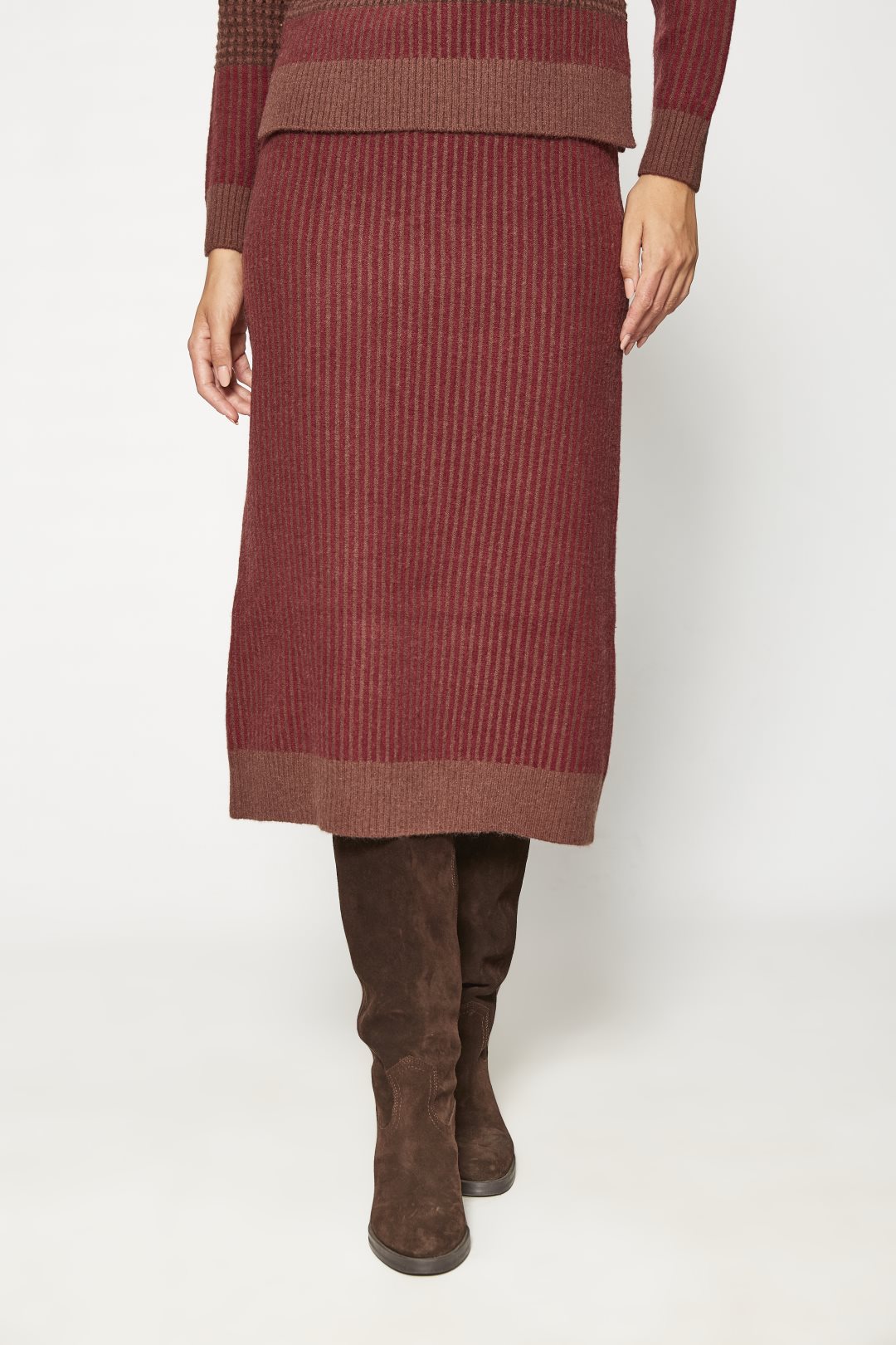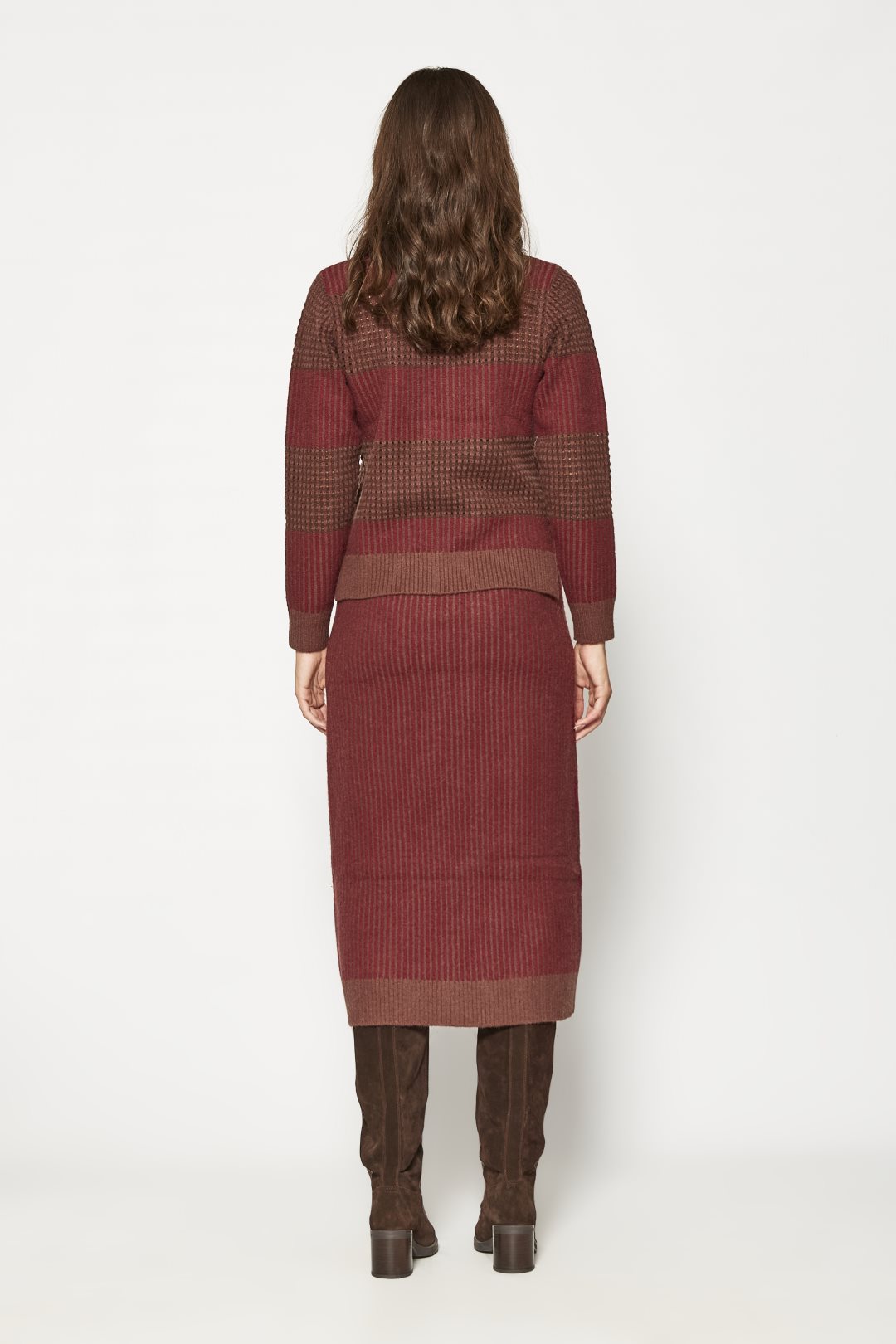 Falda midi para mujer de la colección otoño-invierno de MD’M. Confeccionada en tejido de punto con patrón jacquard que aporta textura y diseño. Cuenta con cintura ajustable para un ajuste cómodo y personalizado. Prenda versátil y elegante, perfecta para combinar con jerséis y prendas de punto. Disponible en varias tallas.