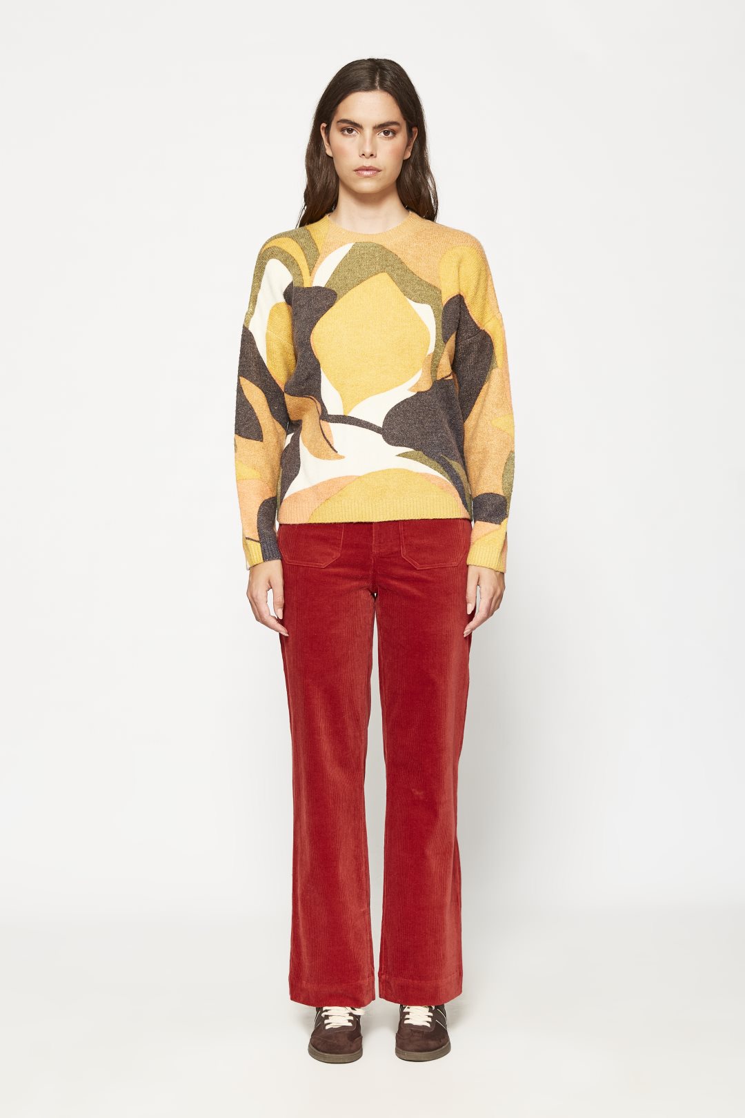 Jersey de punto de manga larga con cuello redondo y estampado integral de formas Jersey de punto de manga larga con cuello redondo y estampado integral de formas abstractas y orgánicas entrelazadas. Mangas de corte regular con puños y bajo acanalados Color amarillo