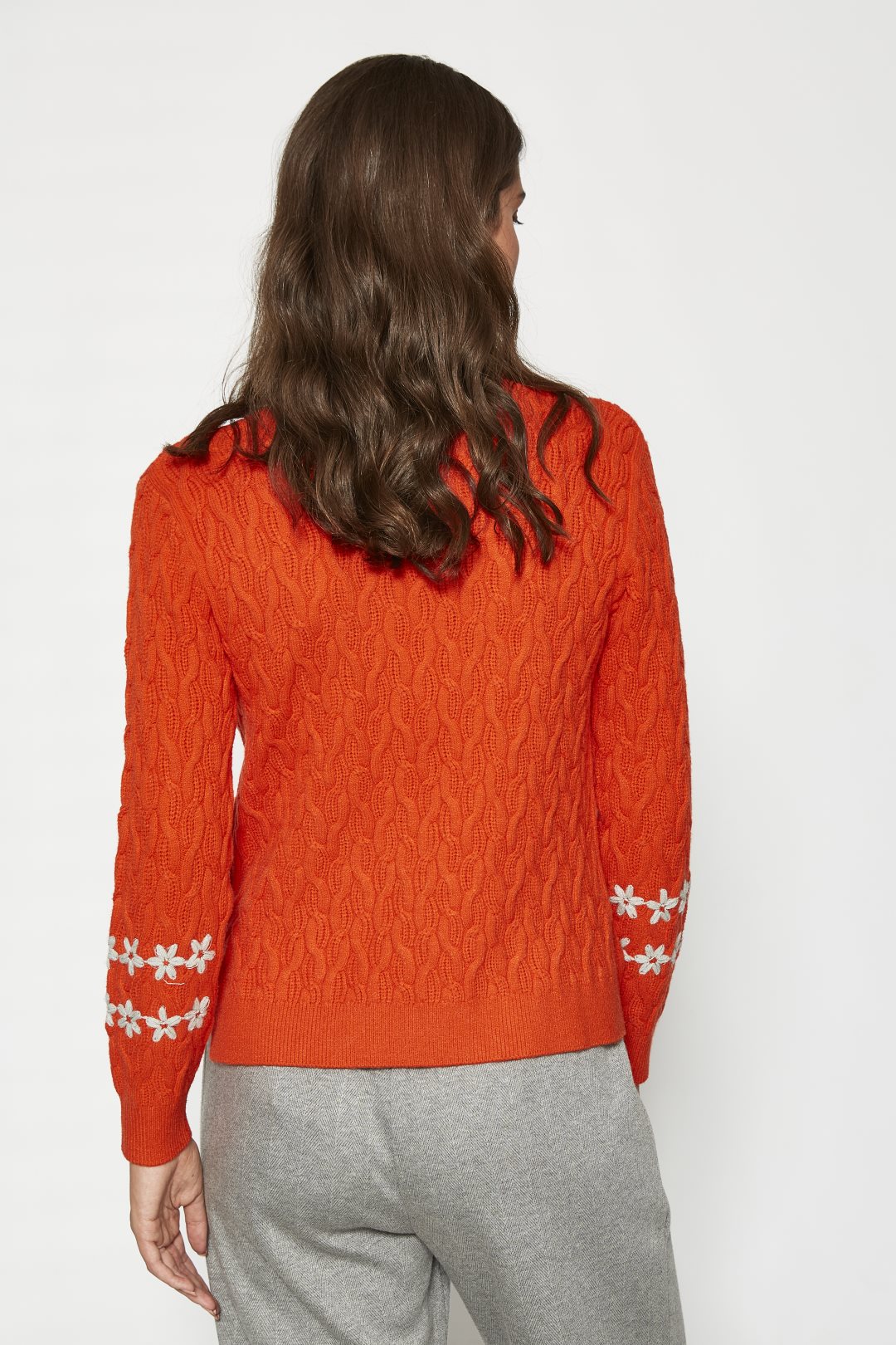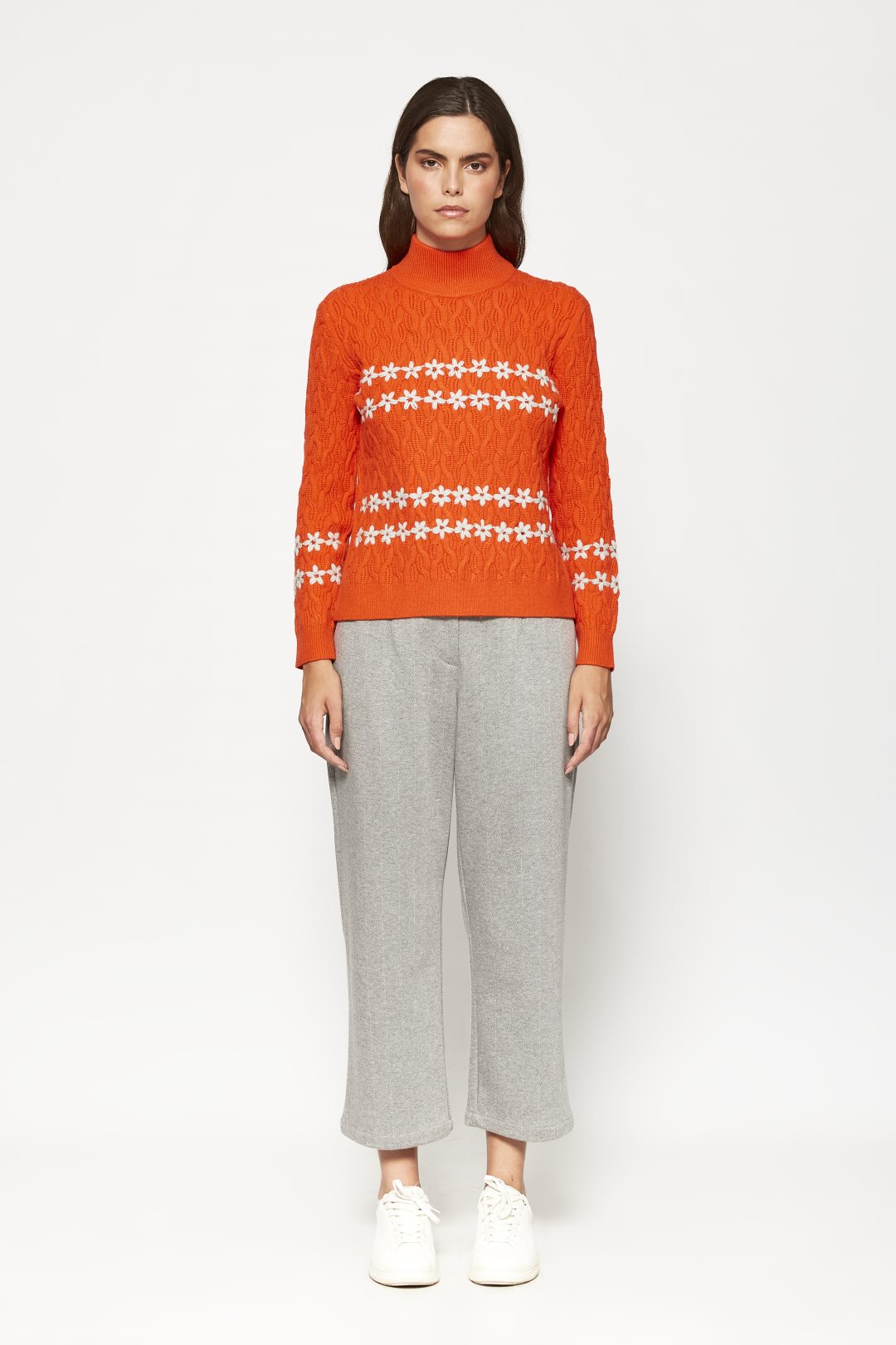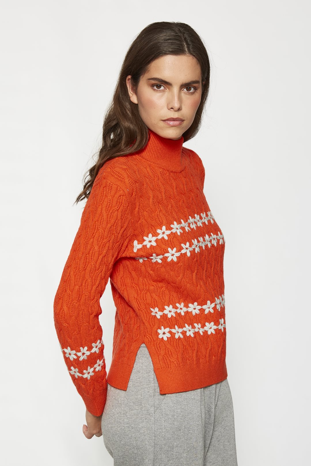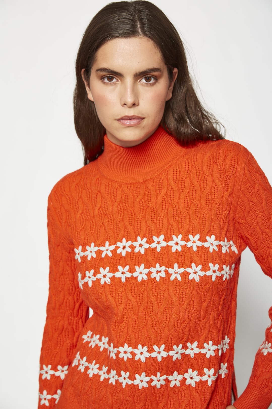 Jersey de punto de manga larga con cuello alto acanalado. Cuerpo y mangas con patrón de ochos verticales y bandas horizontales con diseño floral en contraste. Puños acanalados. Silueta de corte recto y ajustado. Color naranja