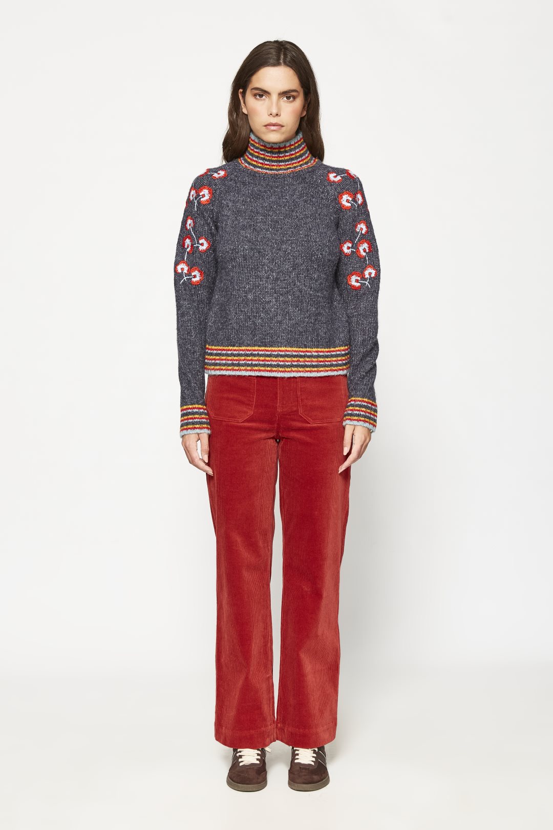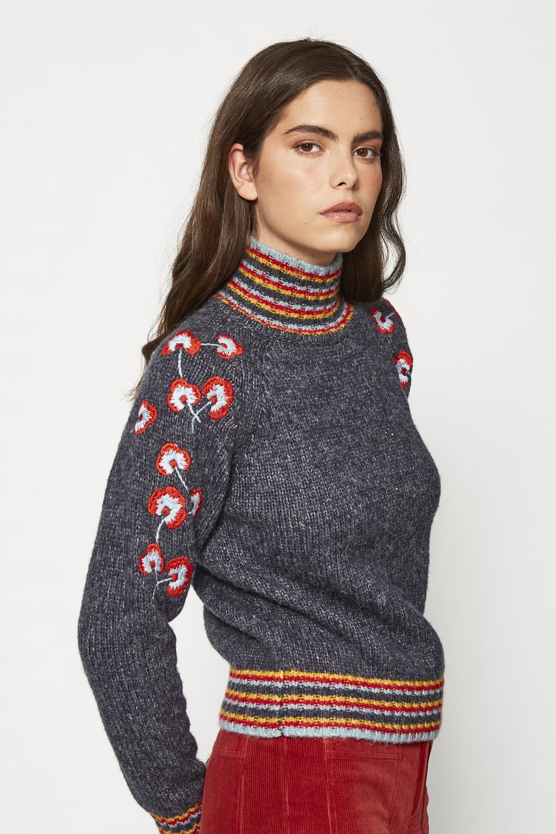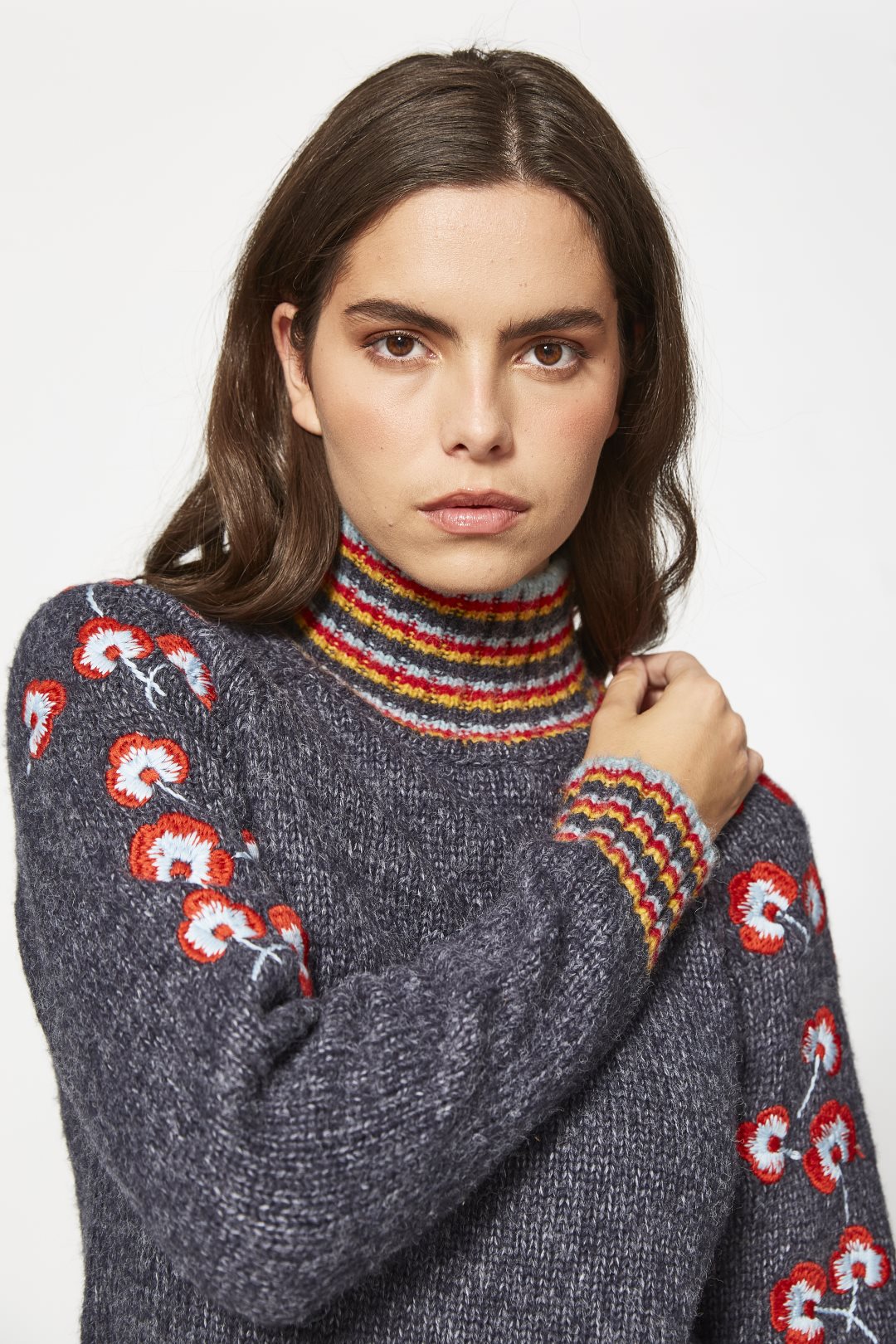 Jersey de punto con cuello alto y mangas raglán. Bordados florales distribuidos en las mangas y la parte superior del cuerpo. Cuello, puños y bajo rematados con bandas acanaladas de rayas multicolor. Silueta de corte recto. Color azul