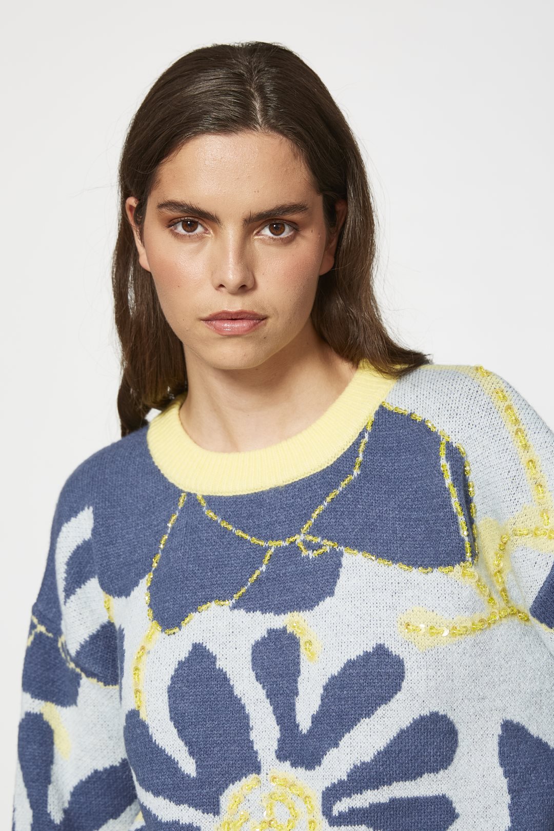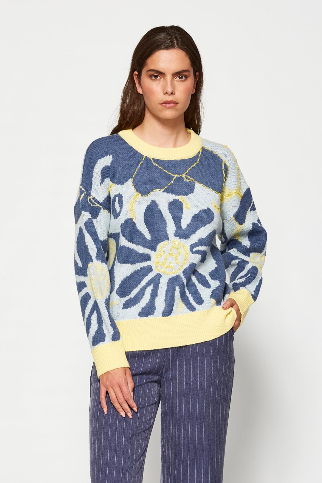 Jersey de punto de manga larga con cuello redondo. Estampado integral de motivos florales grandes con detalles decorativos en lentejuelas. Cuello, puños y bajo acanalados en contraste. Silueta de corte recto y ligeramente holgado. Color azul