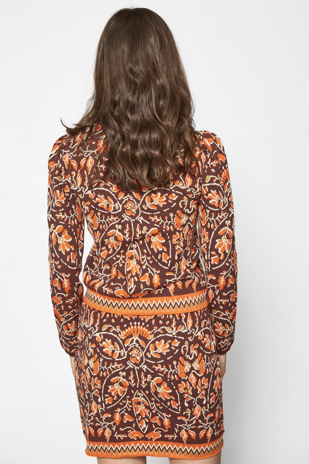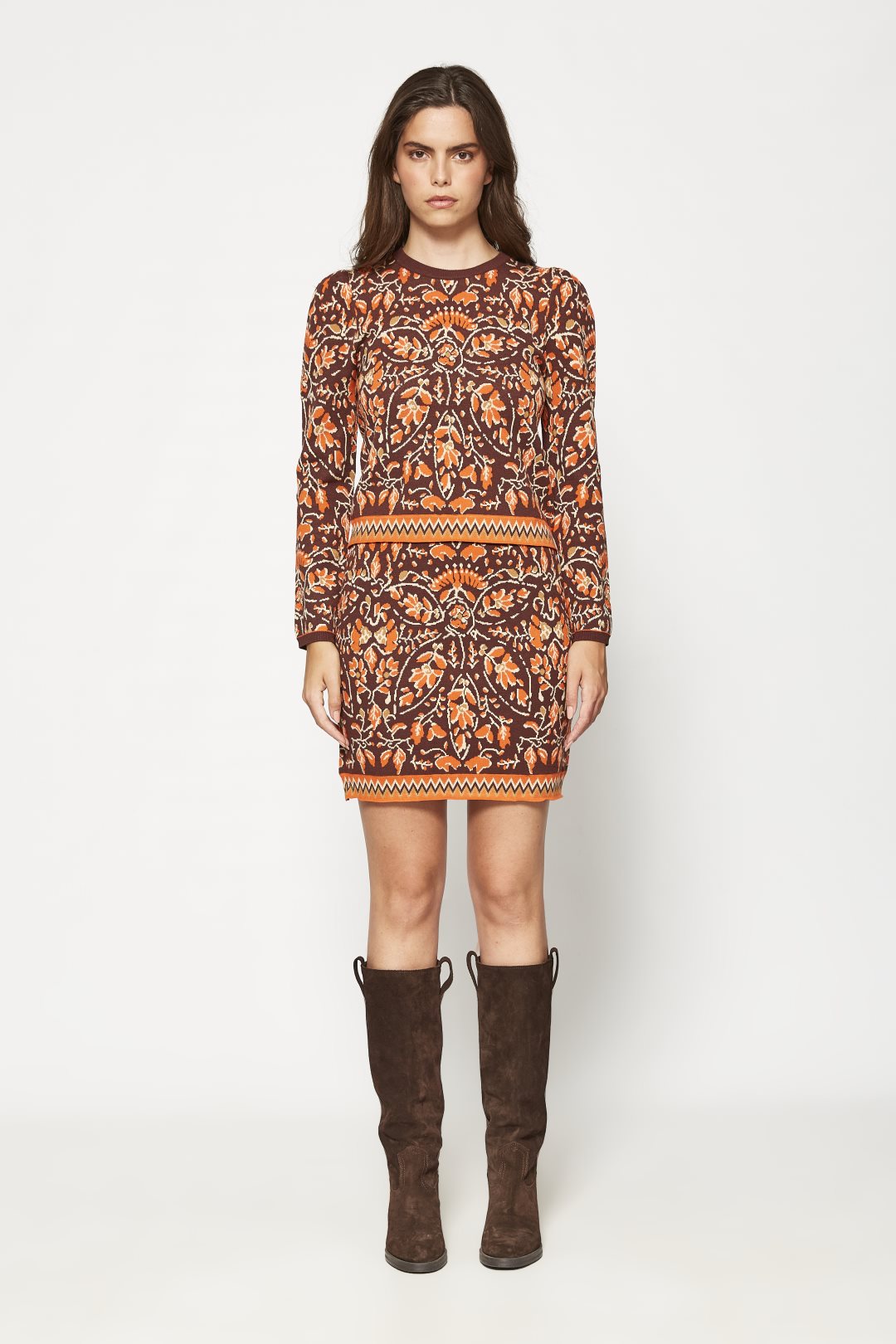 Jersey para mujer de la colección otoño-invierno de MD’M. Confeccionado en tejido de punto, presenta cuello redondo, hombros con ligero volumen, jacquard con estampado liberty y rib a contraste en el bajo que aporta acabado y ajuste. Prenda femenina y versátil, ideal para combinar con pantalones o faldas. Disponible en varias tallas.