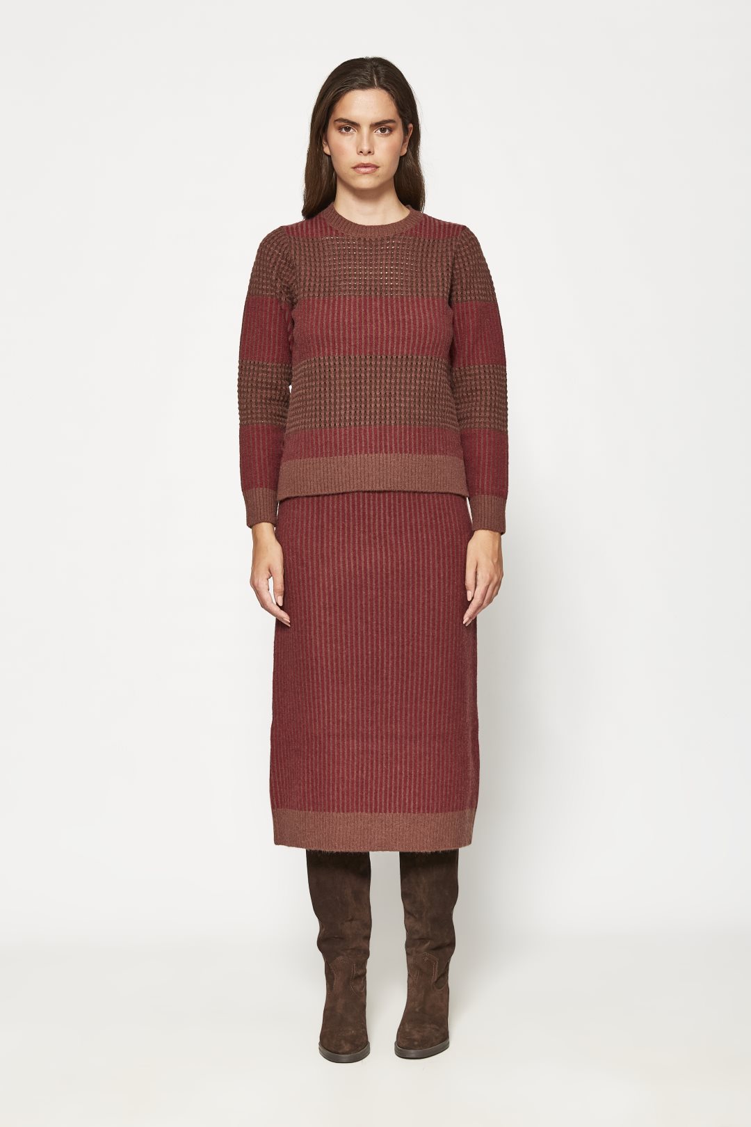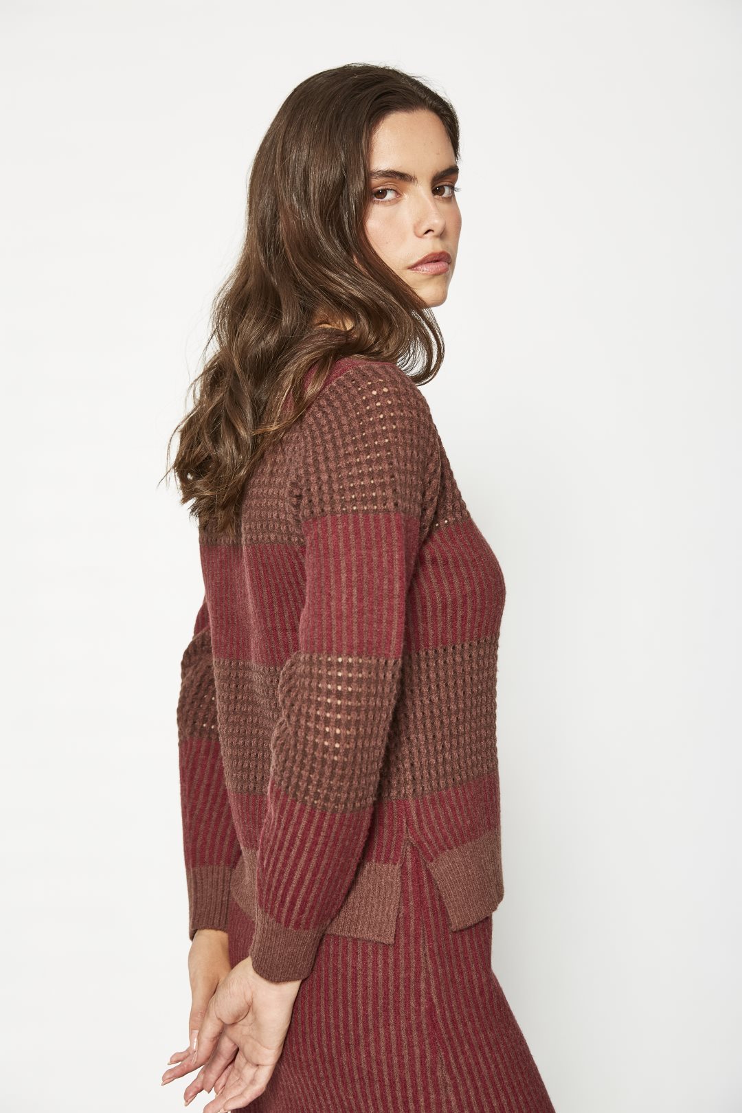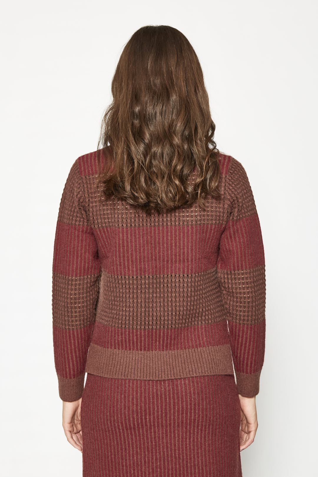 Jersey de cuello redondo con combinación de jacquares en distintos motivos. Color marrón