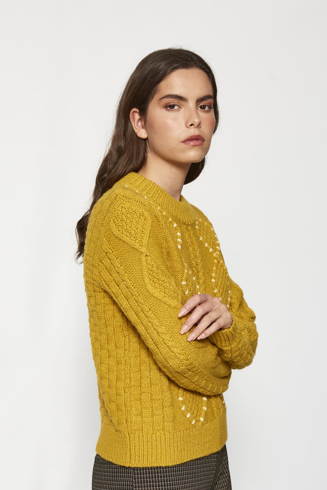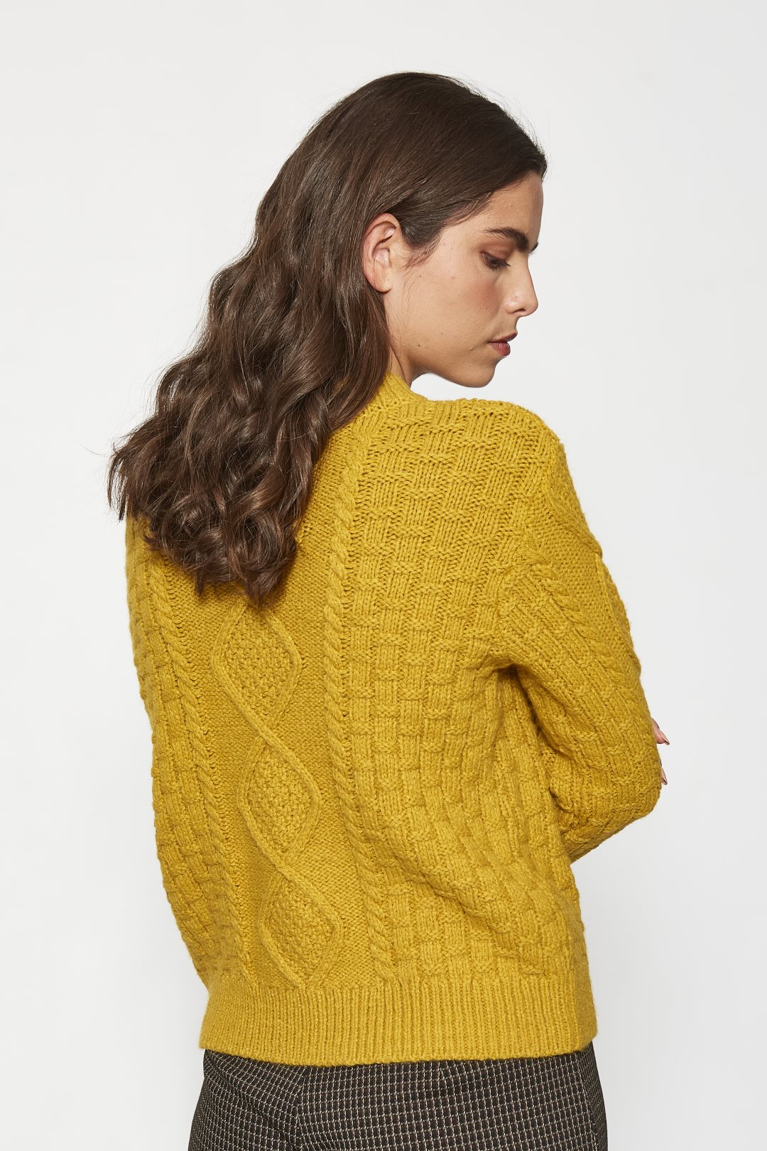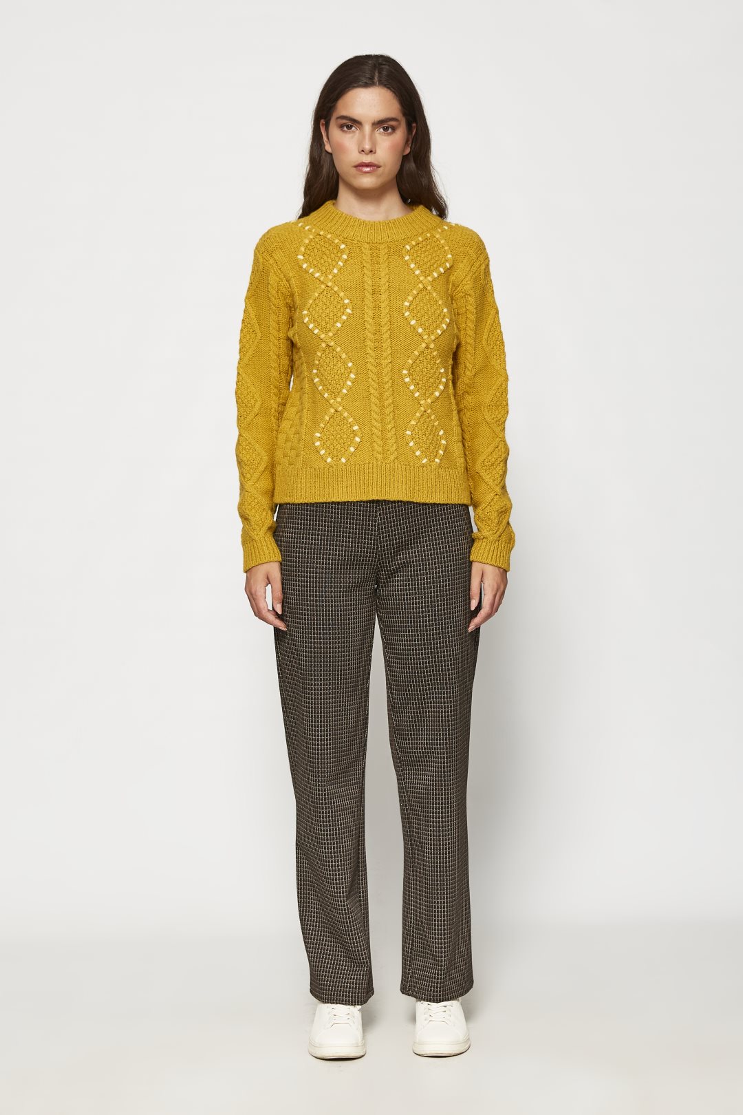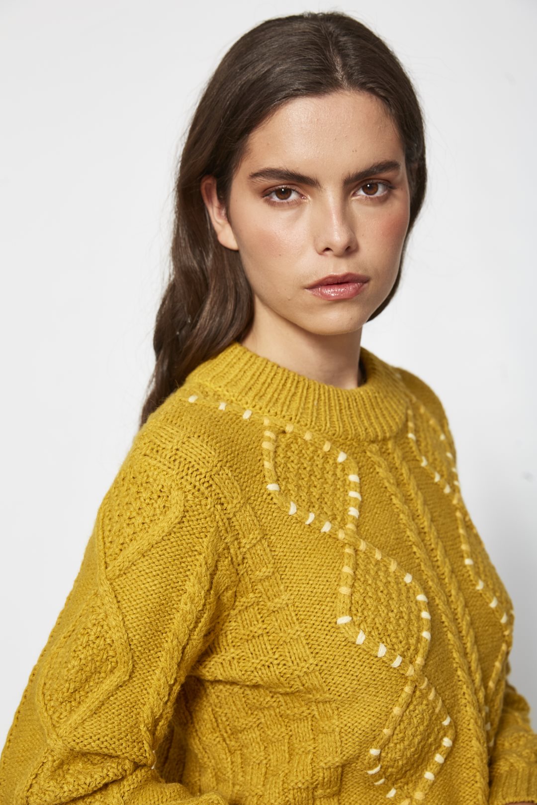 Jersey para mujer de la colección otoño-invierno de MD’M. Confeccionado en tejido de punto, presenta cuello redondo y detalle de trenzado decorativo en el pecho y las mangas. Prenda cálida y estructurada, ideal para combinar con pantalones o faldas. Disponible en varias tallas.