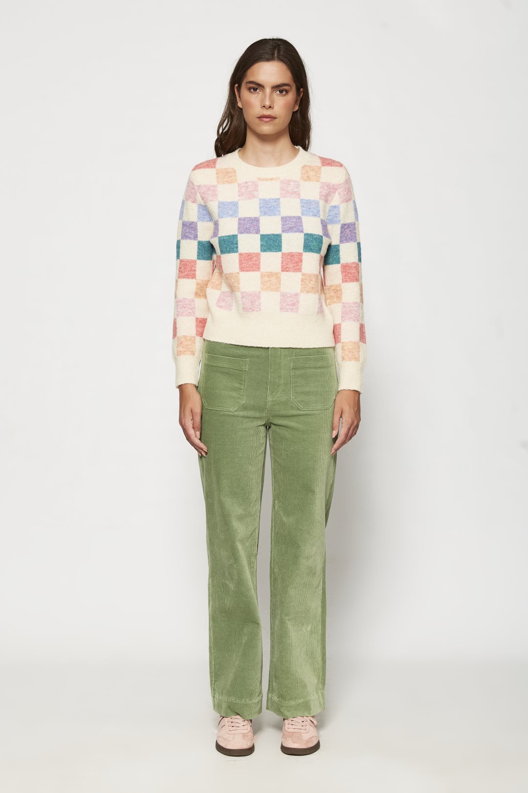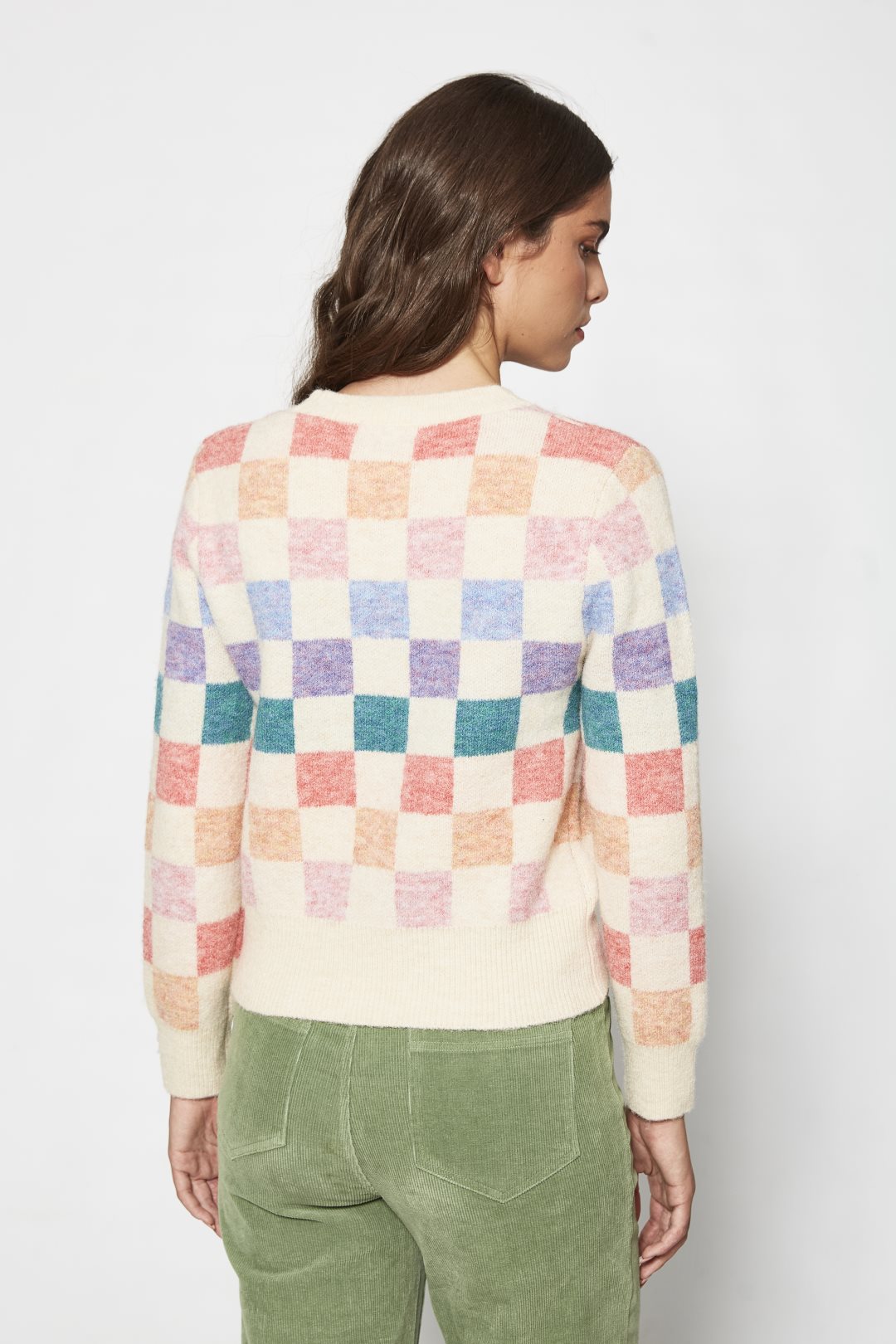 Jersey de punto de manga larga con cuello redondo y patrón integral de cuadros. Cuello, puños y bajo acabados en punto acanalado. Silueta de corte recto. Color crudo