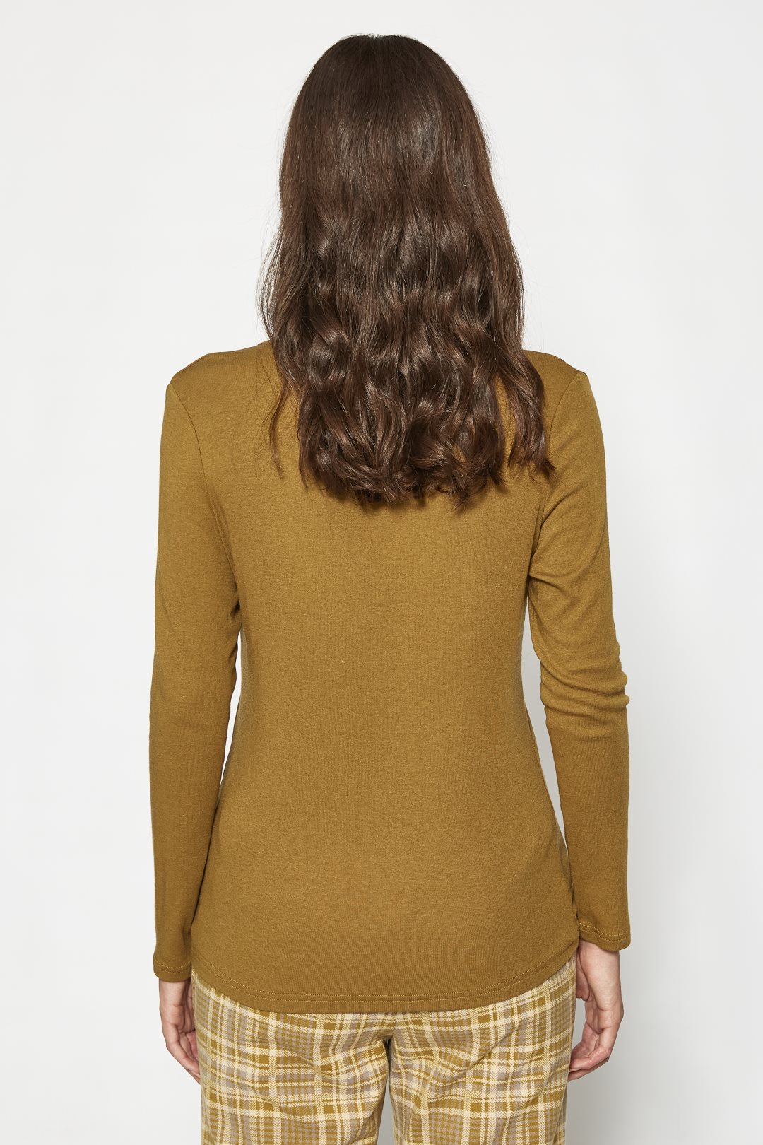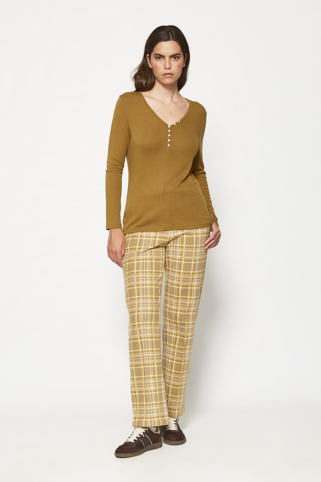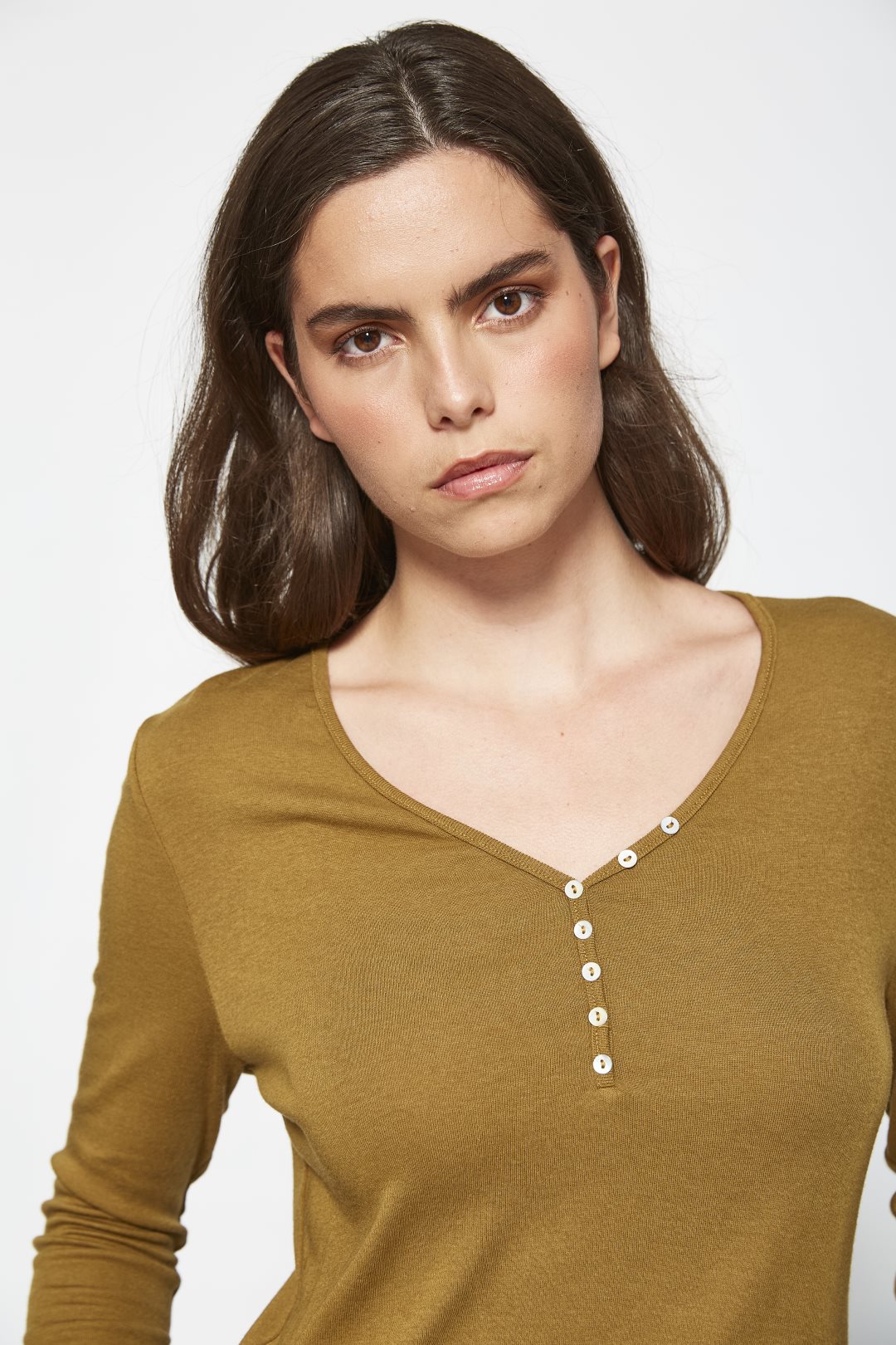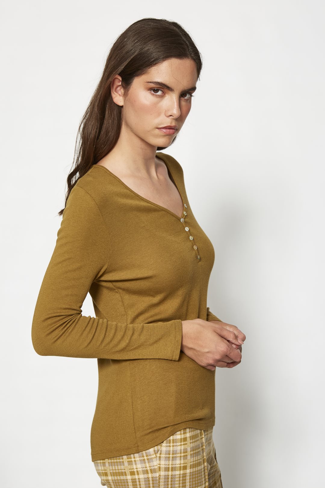 Jersey de manga larga confeccionado en punto liso y ligero. Escote en pico con tapeta frontal y botones pequeños estilo Henley. Corte semi-ajustado al cuerpo con bajo recto. Diseño limpio. Color amarillo