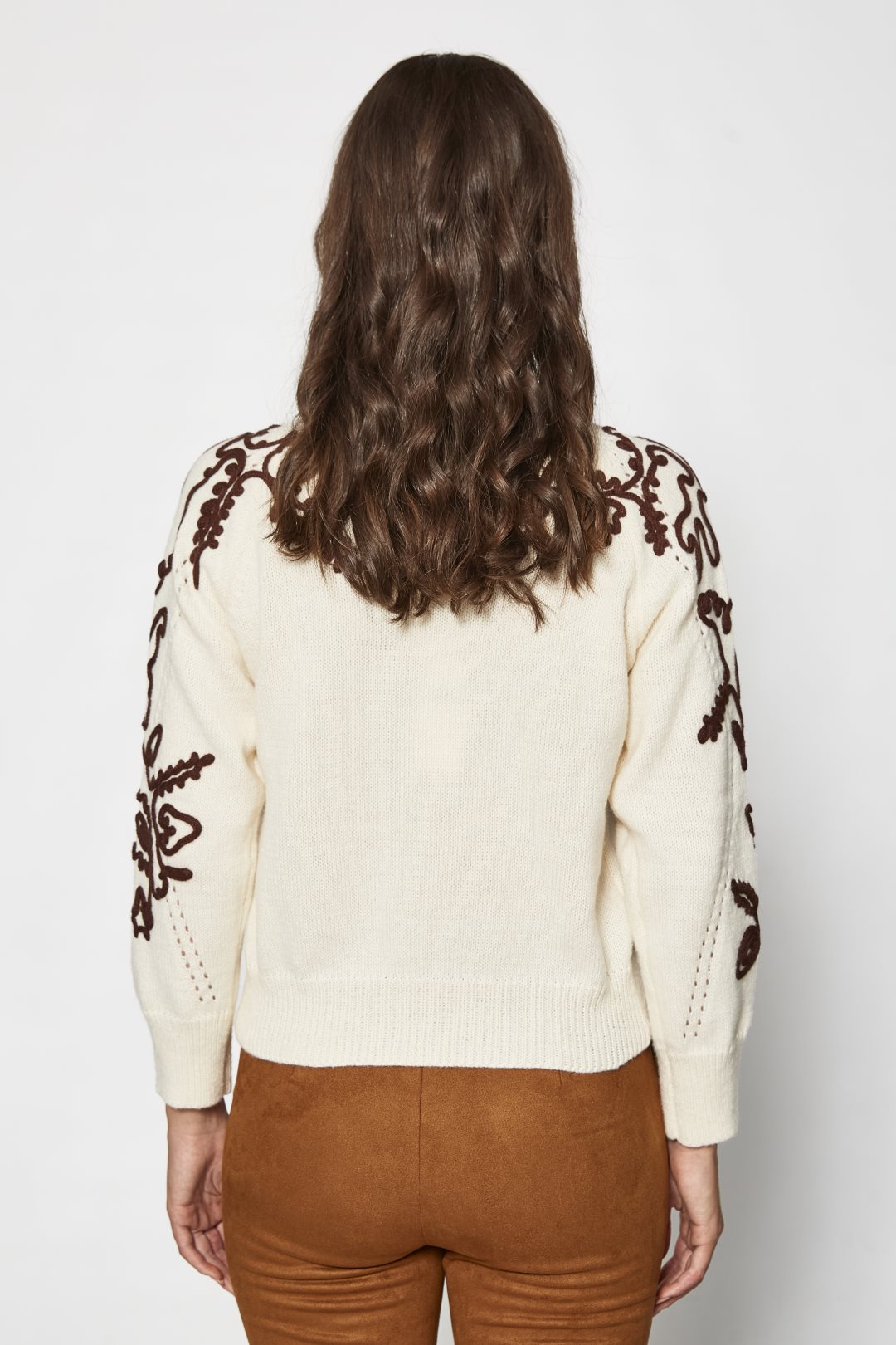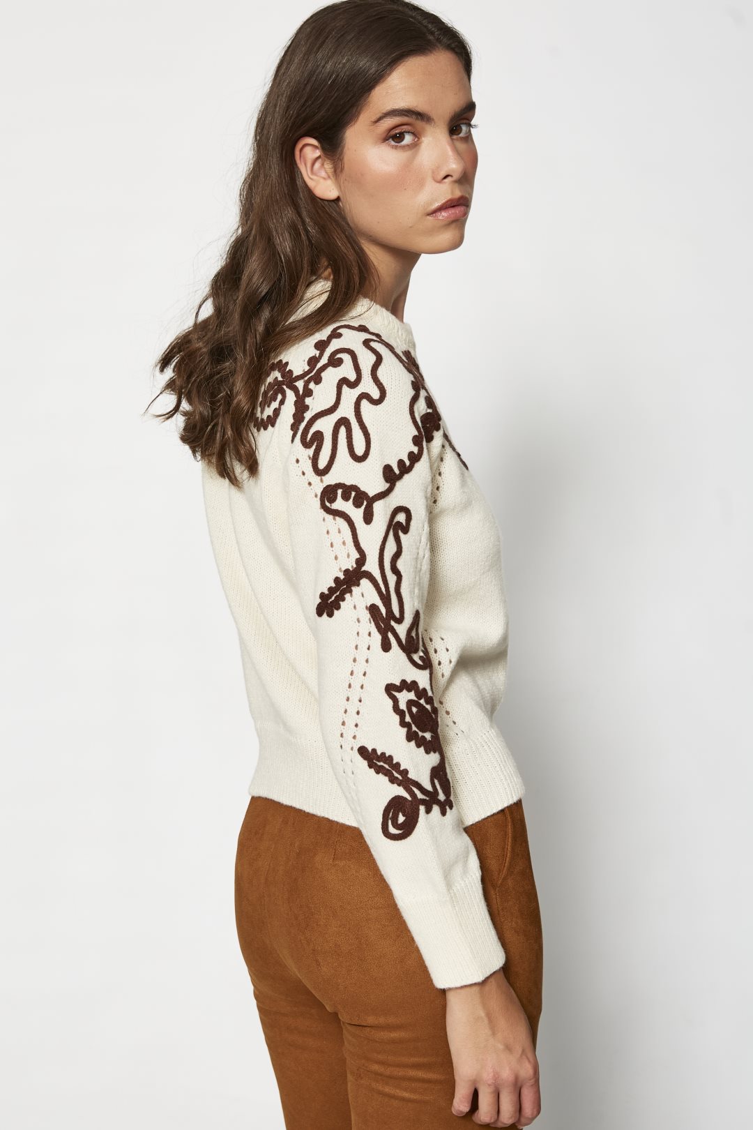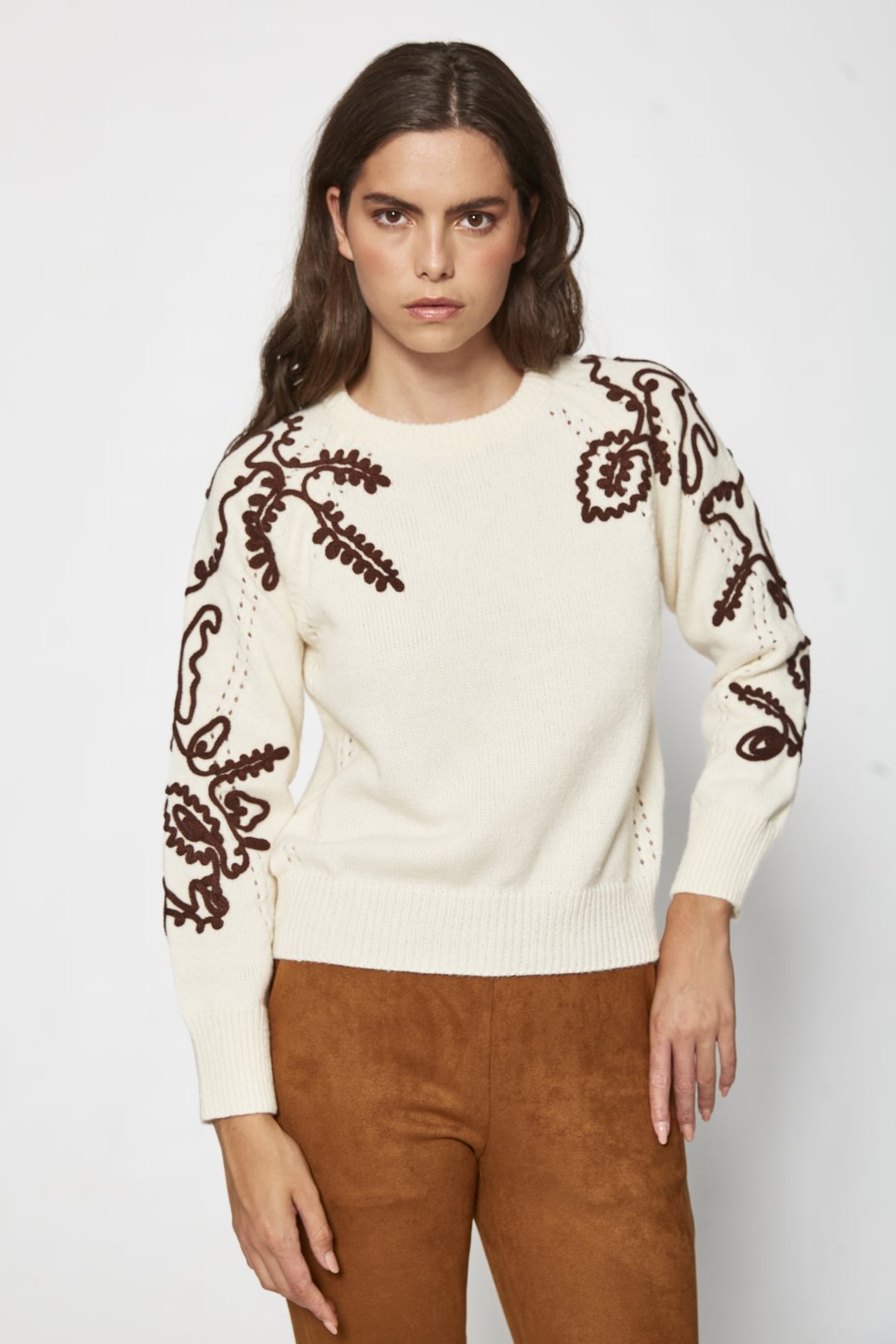 Jersey de punto de manga larga con cuello redondo. Apliques en relieve con motivos florales desde los hombros hasta las mangas. Mangas raglán con detalle de punto calado en la parte inferior. Puños y bajo acanalados.100% acrílico. Color crudo